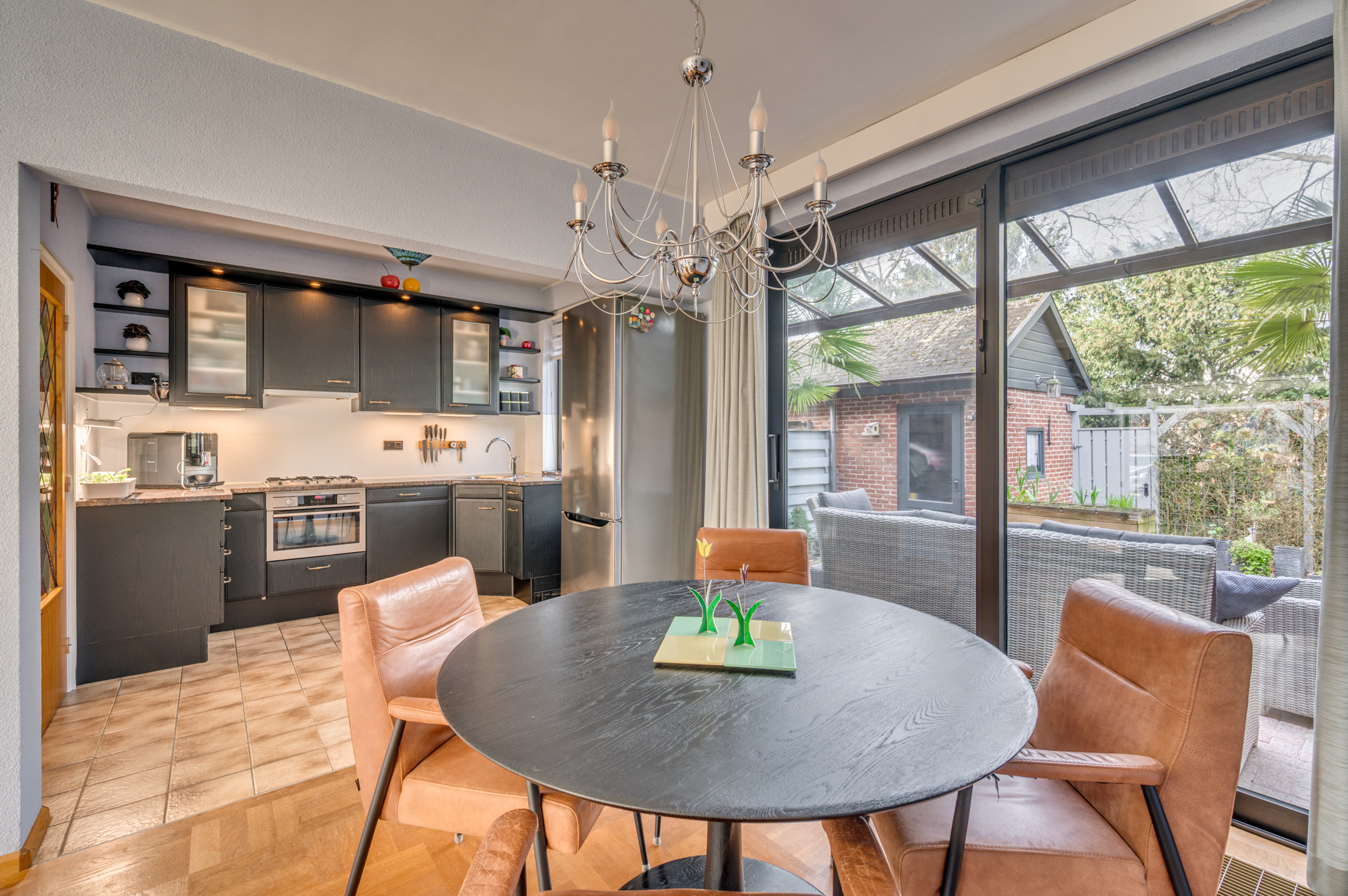 Middels een beklinkerd looppad door de voortuin bereikt men de entree van de woning. De ruime ontvangsthal geeft toegang tot de meterkast (2019), trapopgang naar de 1e verdieping, trapgang naar de kelder, separate toiletruimte en keuken. De deels betegelde toiletruimte is voorzien van een zwevend toilet. Middels een loopdeur aan het einde van de hal is de open keuken te bereiken. De keuken staat in open verbinding met de woonkamer en is voorzien van een gasfornuis, afzuigkap, oven, vaatwasmachine en veel opbergruimte. De woonkamer geniet veel natuurlijk lichtinval en is voorzien in een eet en zitgedeelte. Middels een schuifpui en loopdeur is de tuinoverkapping te bereiken.