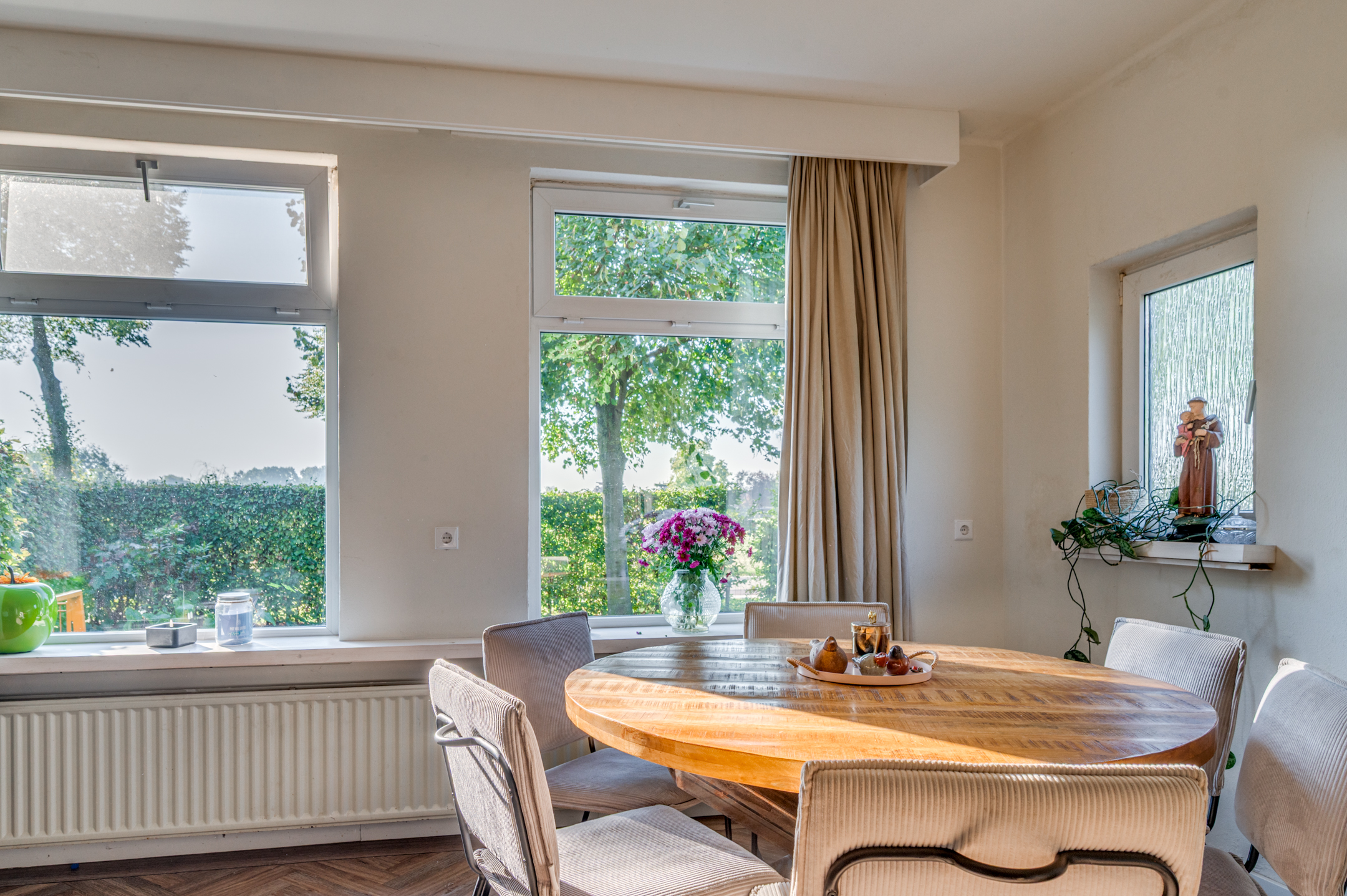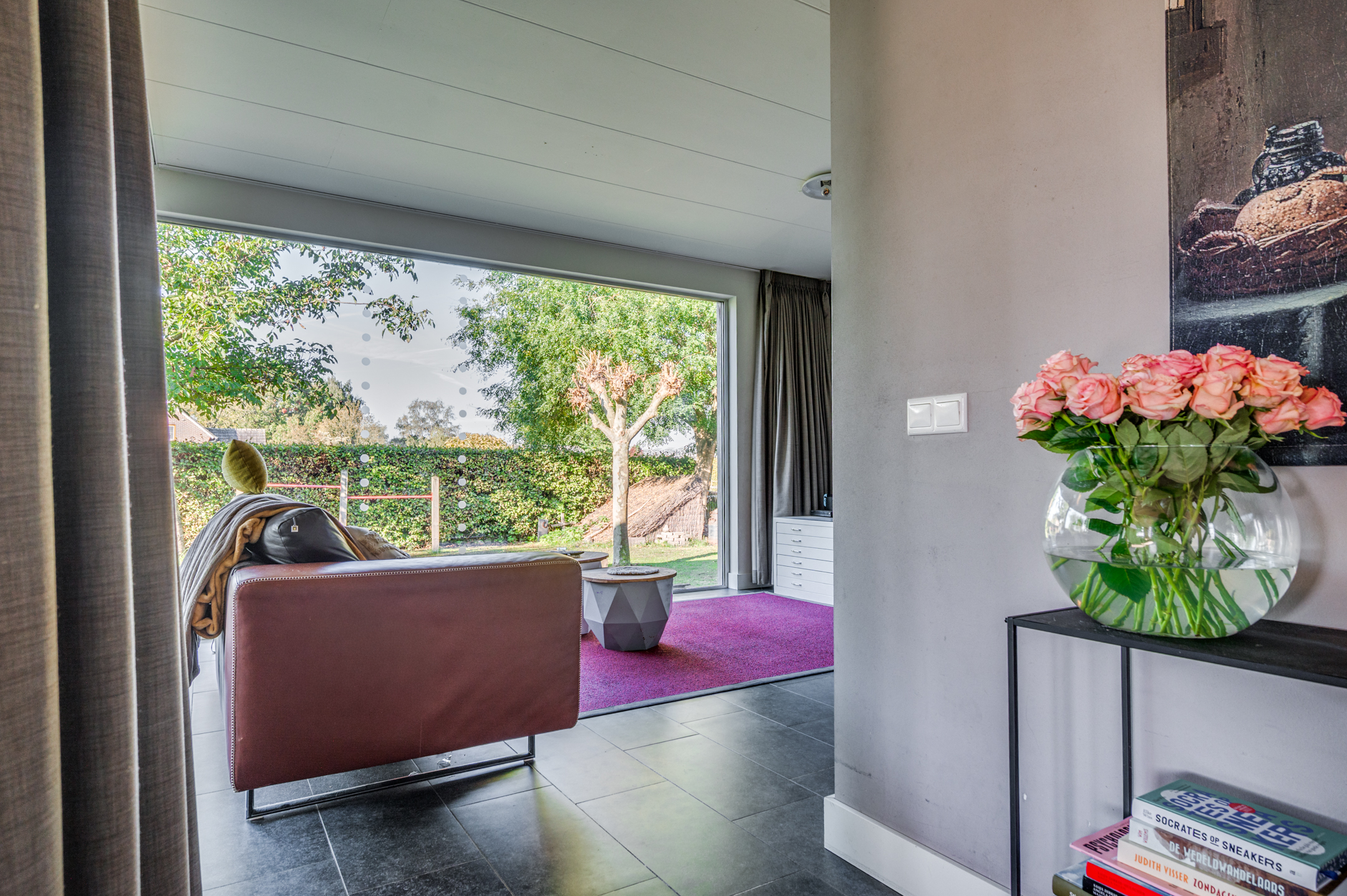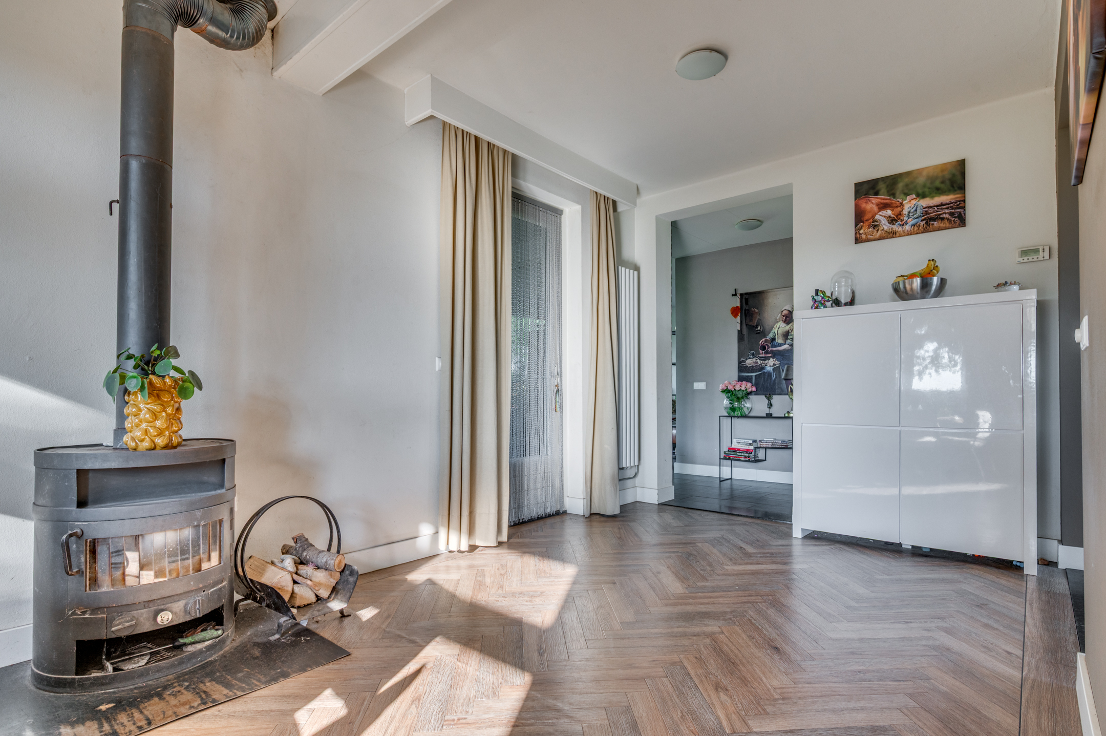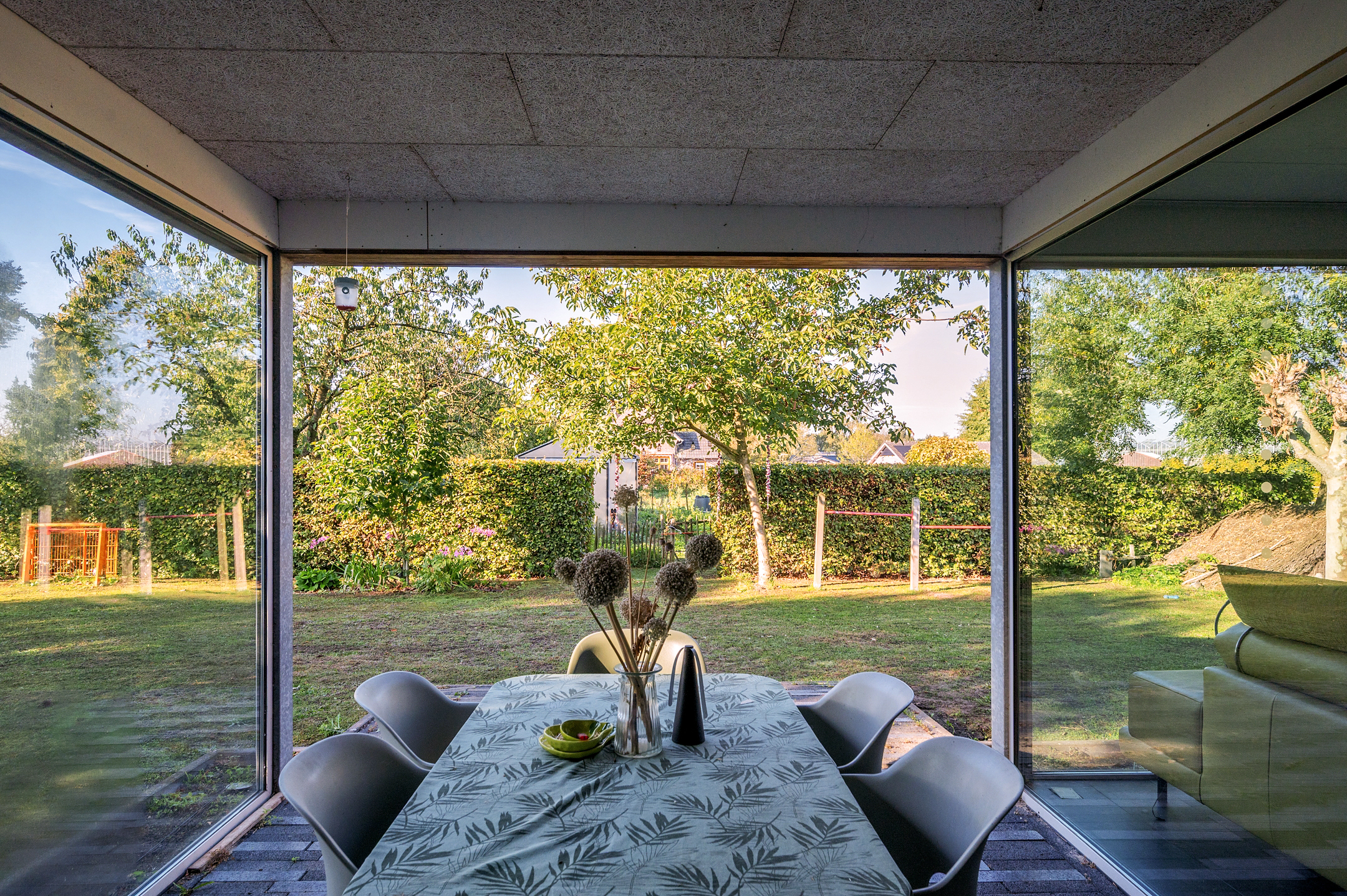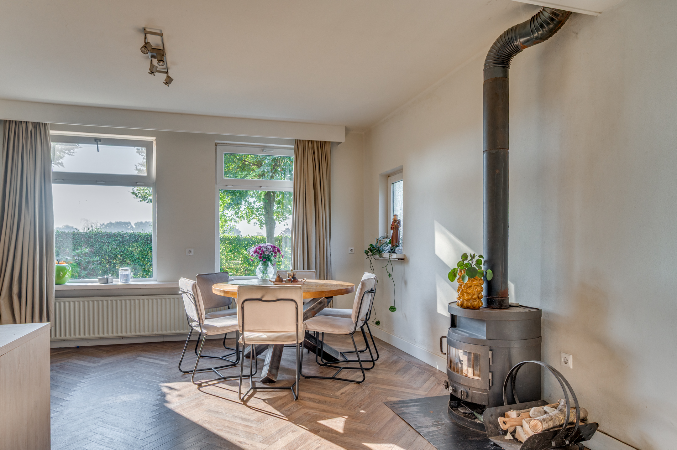 De eetkamer is aan de voorzijde van de woning gelegen, biedt veel natuurlijk lichtinval door de grote raampartijen en beschikt over een sfeervolle houtkachel. Middels een loopdeur is er toegang tot de overkapping. Aan de achterzijde van de woning is de woonkamer gelegen. Deze is voorzien van een tegelvloer en staat door de grote raampartijen prachtig in verbinding met de tuin.