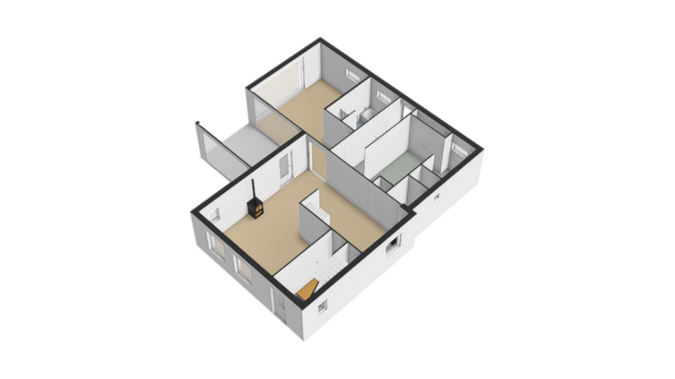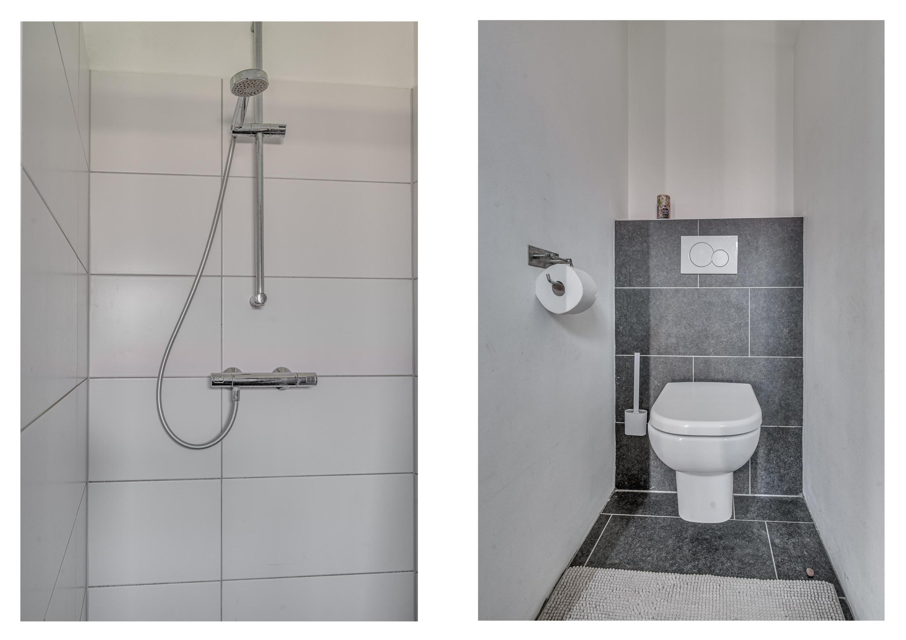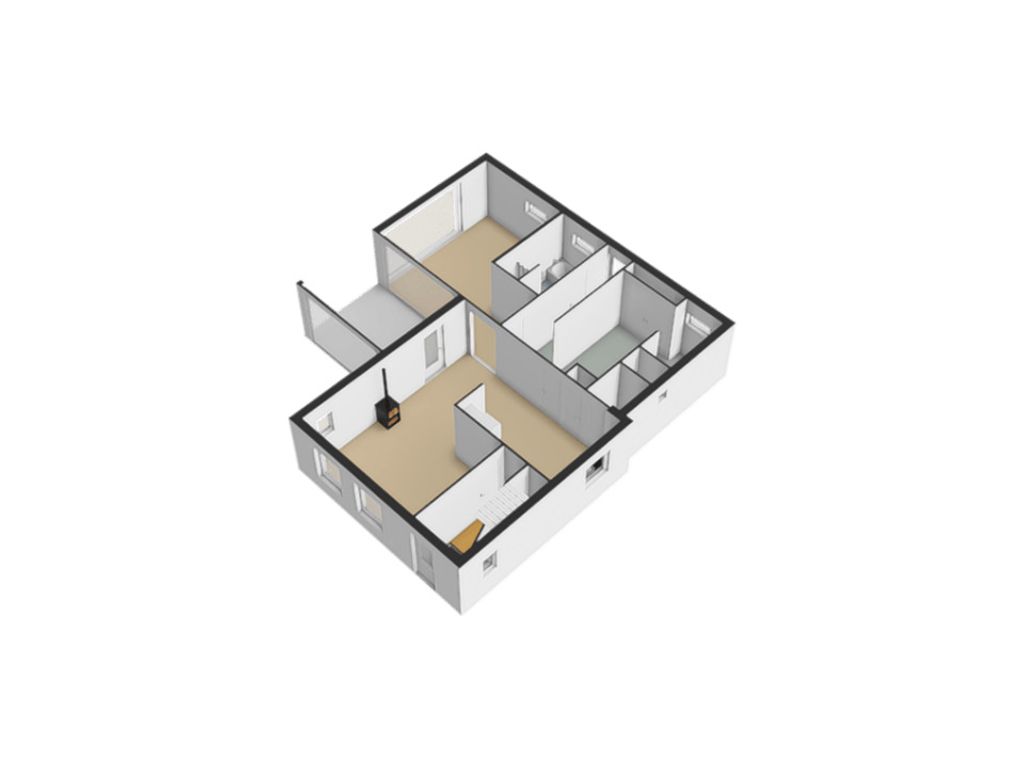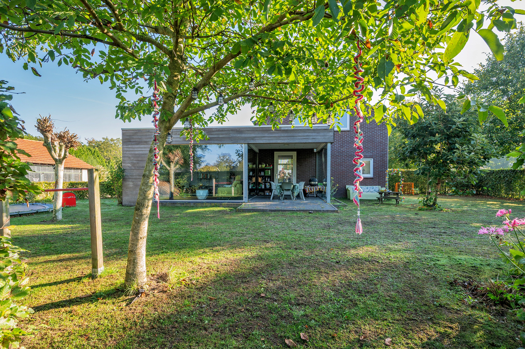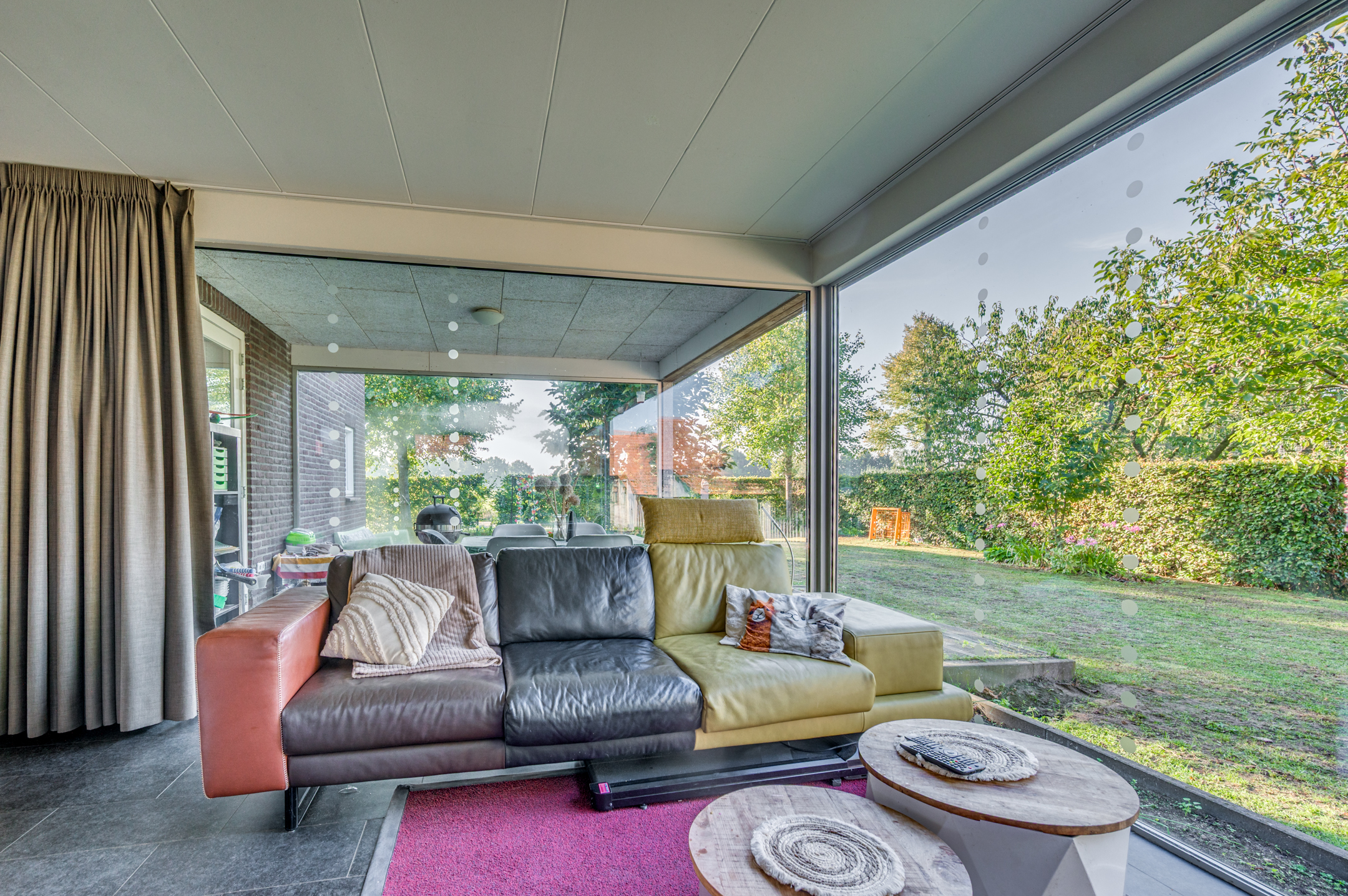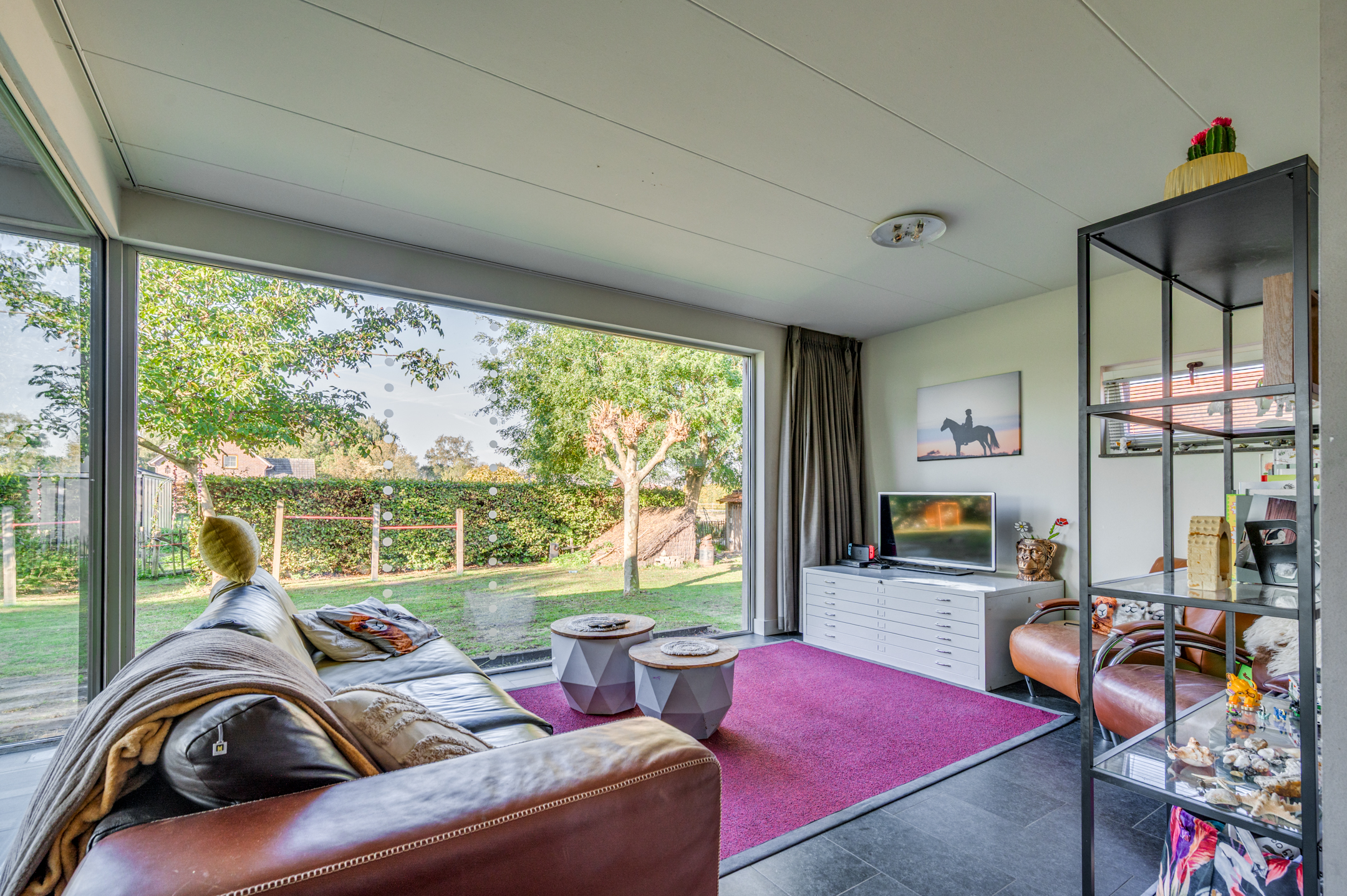 De eetkamer is aan de voorzijde van de woning gelegen, biedt veel natuurlijk lichtinval door de grote raampartijen en beschikt over een sfeervolle houtkachel. Middels een loopdeur is er toegang tot de overkapping. Aan de achterzijde van de woning is de woonkamer gelegen. Deze is voorzien van een tegelvloer en staat door de grote raampartijen prachtig in verbinding met de tuin.
