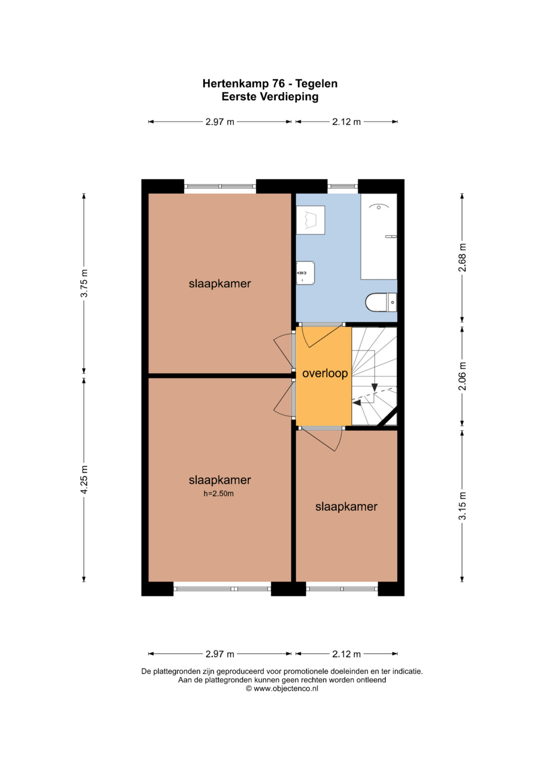 De overloop geeft toegang tot 3 slaapkamers, badkamer en vaste trapopgang naar de 2e verdieping. De slaapkamers zijn ca. 6,5m², 11m² en 13m² groot en allen voorzien van een laminaatvloer met rolluiken. De badkamer is ca. 6m² groot en is voorzien van een ligbad met douchefaciliteit, toilet, wastafel, verwarming, de witgoedaansluitingen, mechanische ventilatie en een buitenraam.