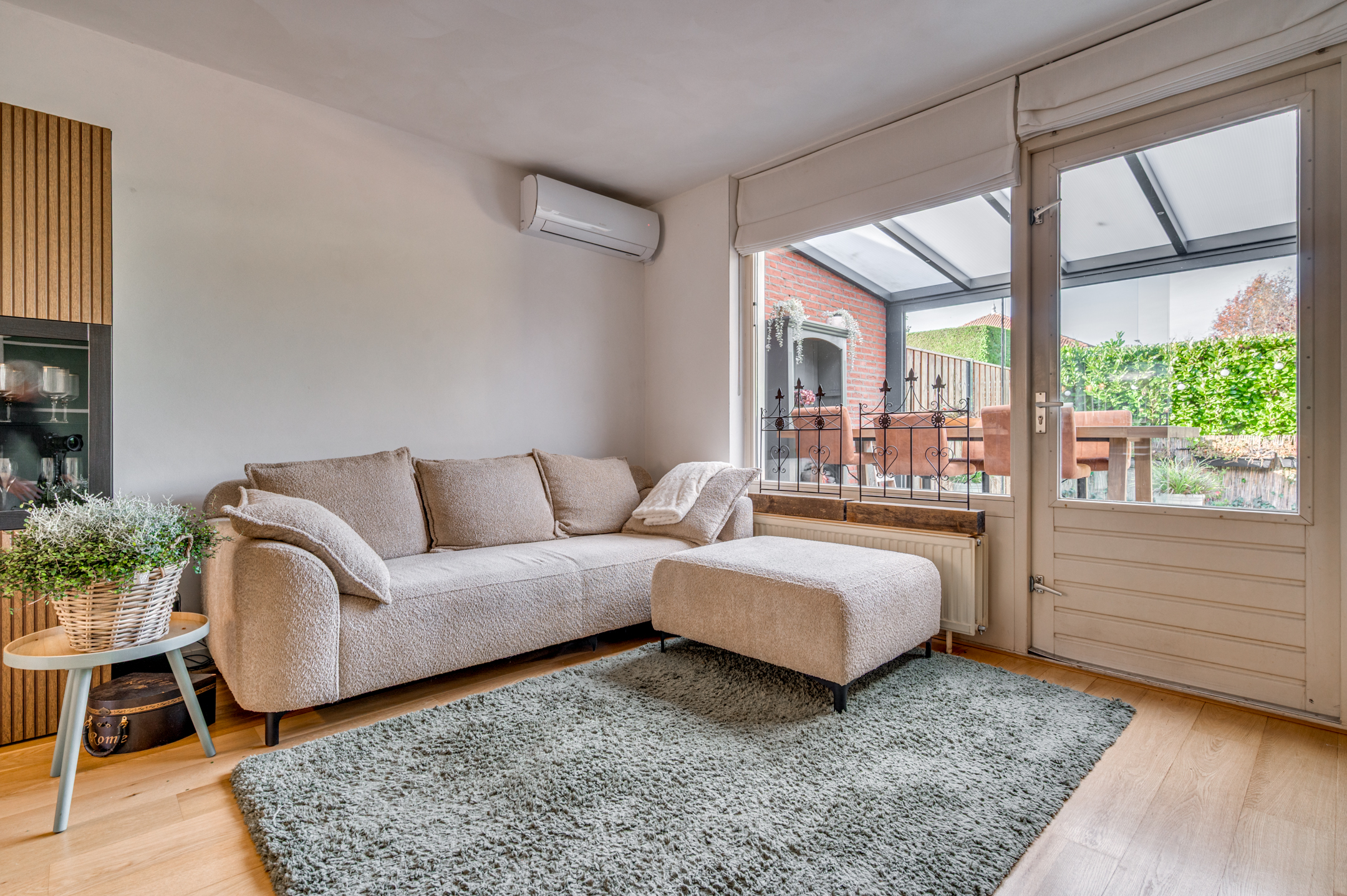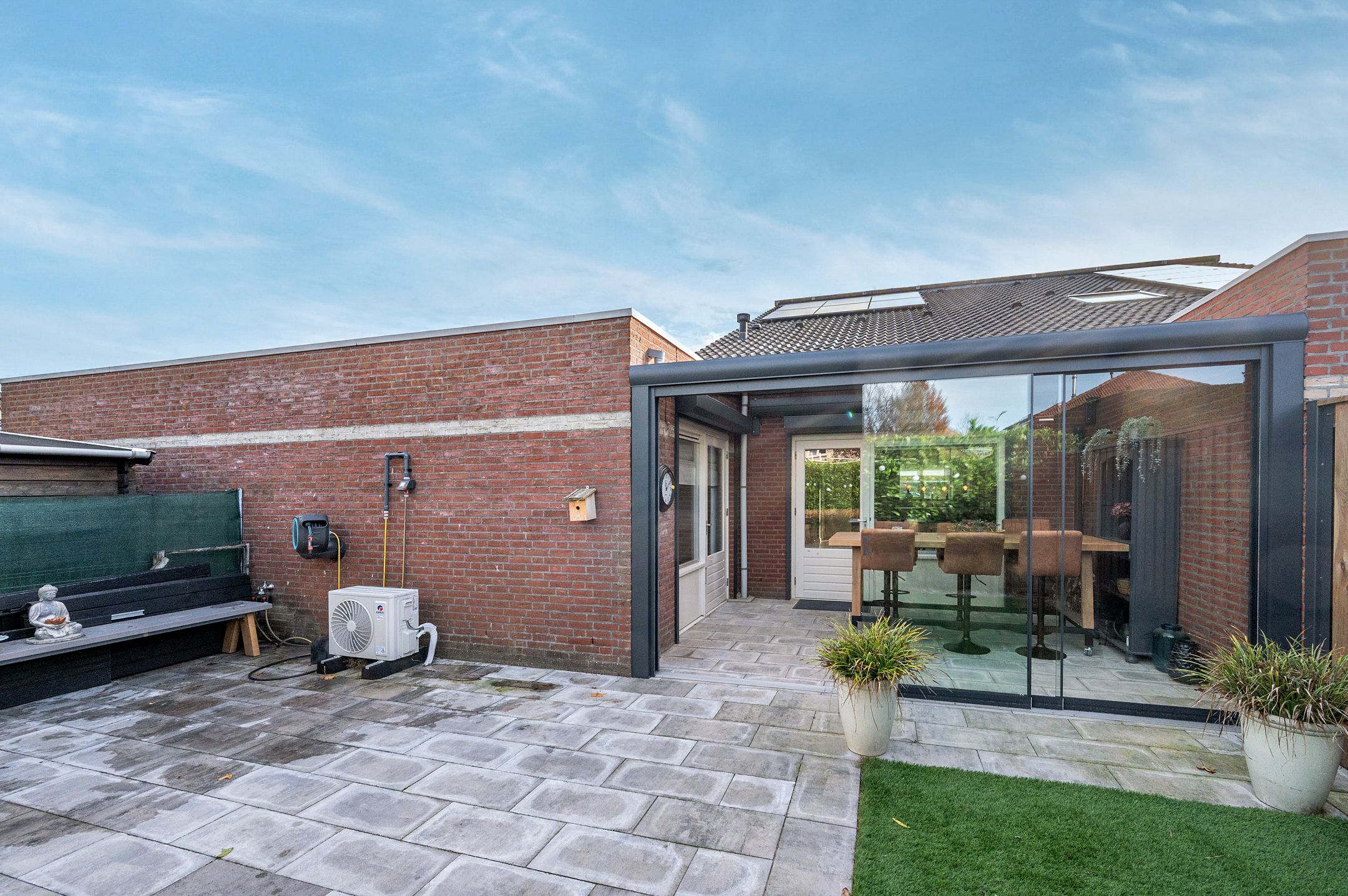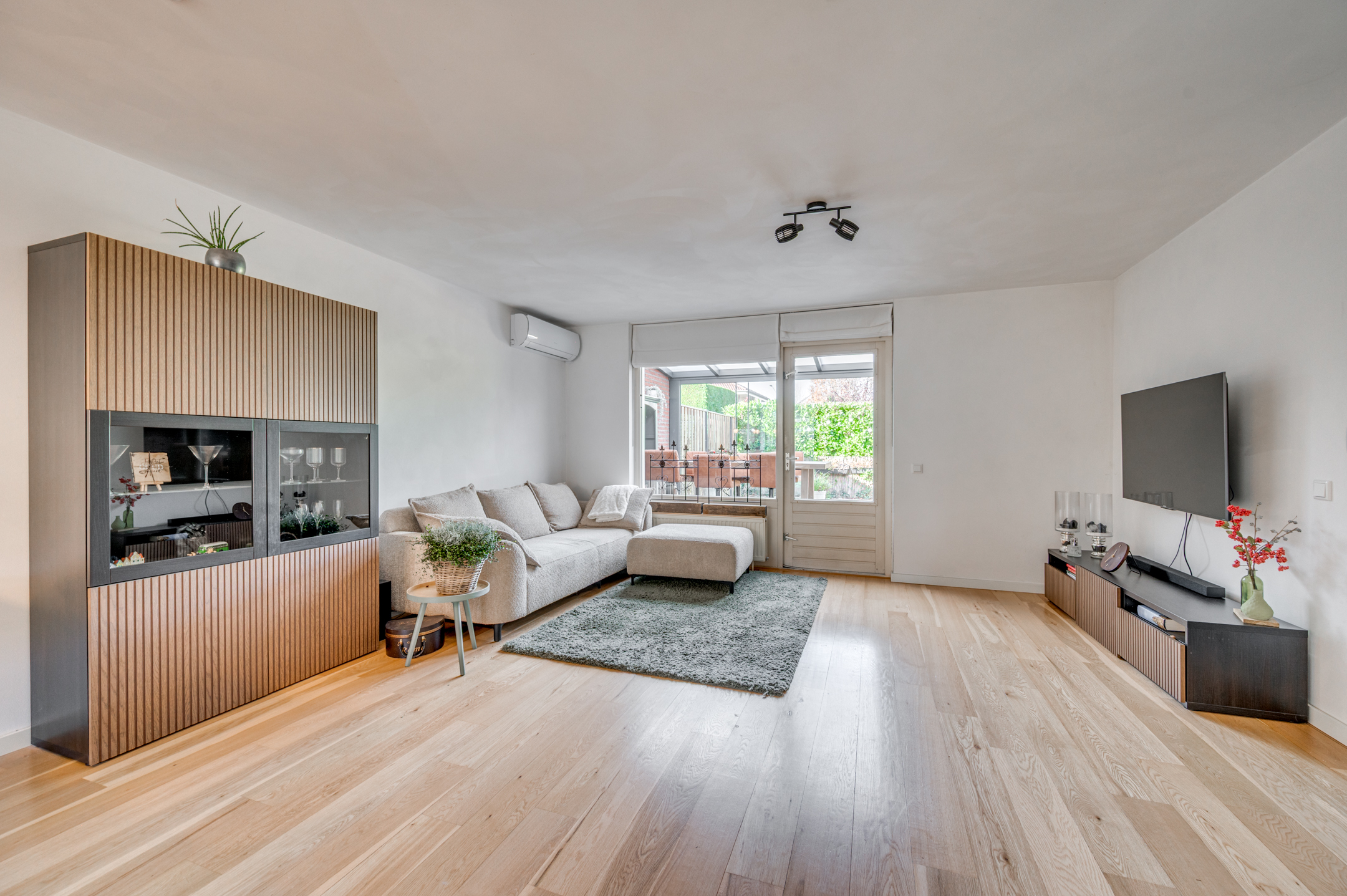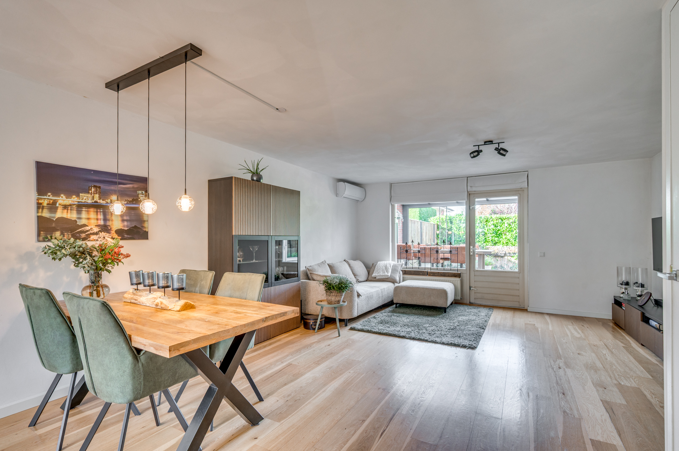 Vanuit de eigen oprit is de entree van de woning en de berging te bereiken. De entree/hal geeft toegang tot de trapopgang naar de 1e verdieping, meterkast, separate toiletruimte en de woonkamer. De geheel betegelde toiletruimte is voorzien van een zwevend toilet, fonteintje en mechanische ventilatie. Middels een loopdeur is er toegang tot de woonkamer met open keuken. De woonkamer is aan de achterzijde ingericht met de zithoek en loopdeur naar de overkapping. De keuken met eethoek is aan de voorzijde gelegen. De keuken is voorzien van een inductiekookplaat met interne afzuiging, vaatwasmachine, koelkast, combioven/ magnetron en spoelbak. De woonkamer beschikt verder over veel lichtinval en een airco. Verder is er een trapkast aanwezig en is er middels een loopdeur toegang tot de hal. De hal geeft de mogelijkheid om de riante slaapkamer, badkamer en inpandige berging te betreden. De slaapkamer is ca. 16m² groot en geeft middels een loopdeur wederom toegang tot de tuin met overkapping welke middels glazen schuifwanden afsluitbaar is. De mooie riante badkamer is modern, volledig betegeld en voorzien van een inloopdouche, wastafel met meubel, zwevend toilet, mechanische ventilatie en een designradiator. De inpandige berging geeft de mogelijkheid om de fietsen etc. in te plaatsen.
