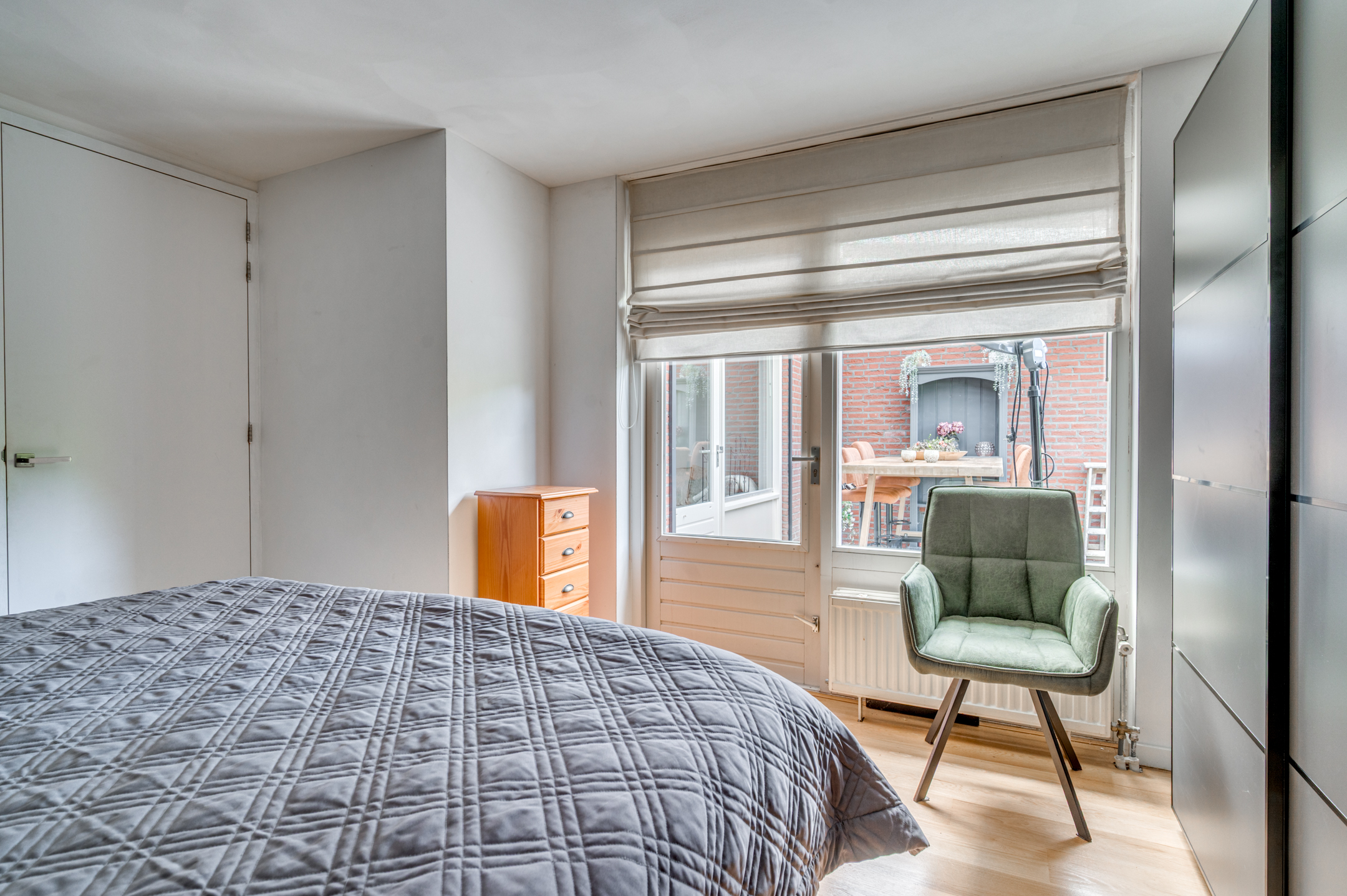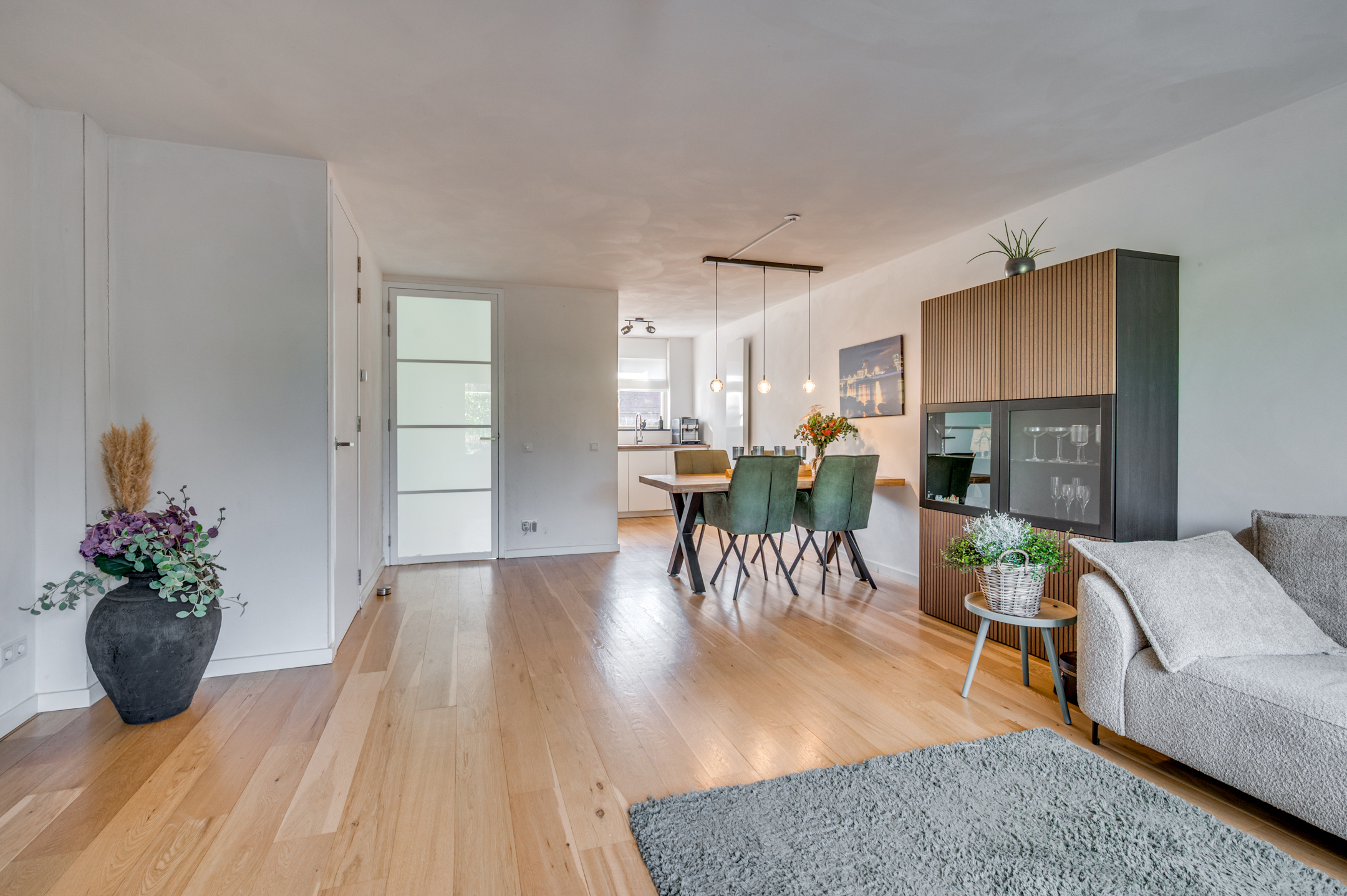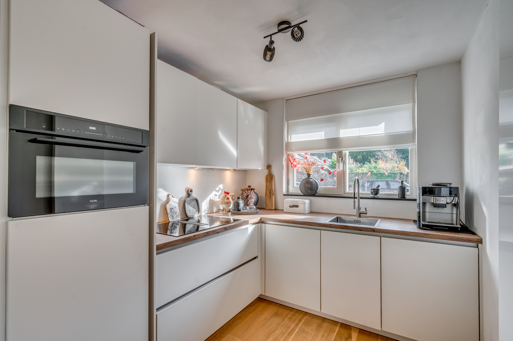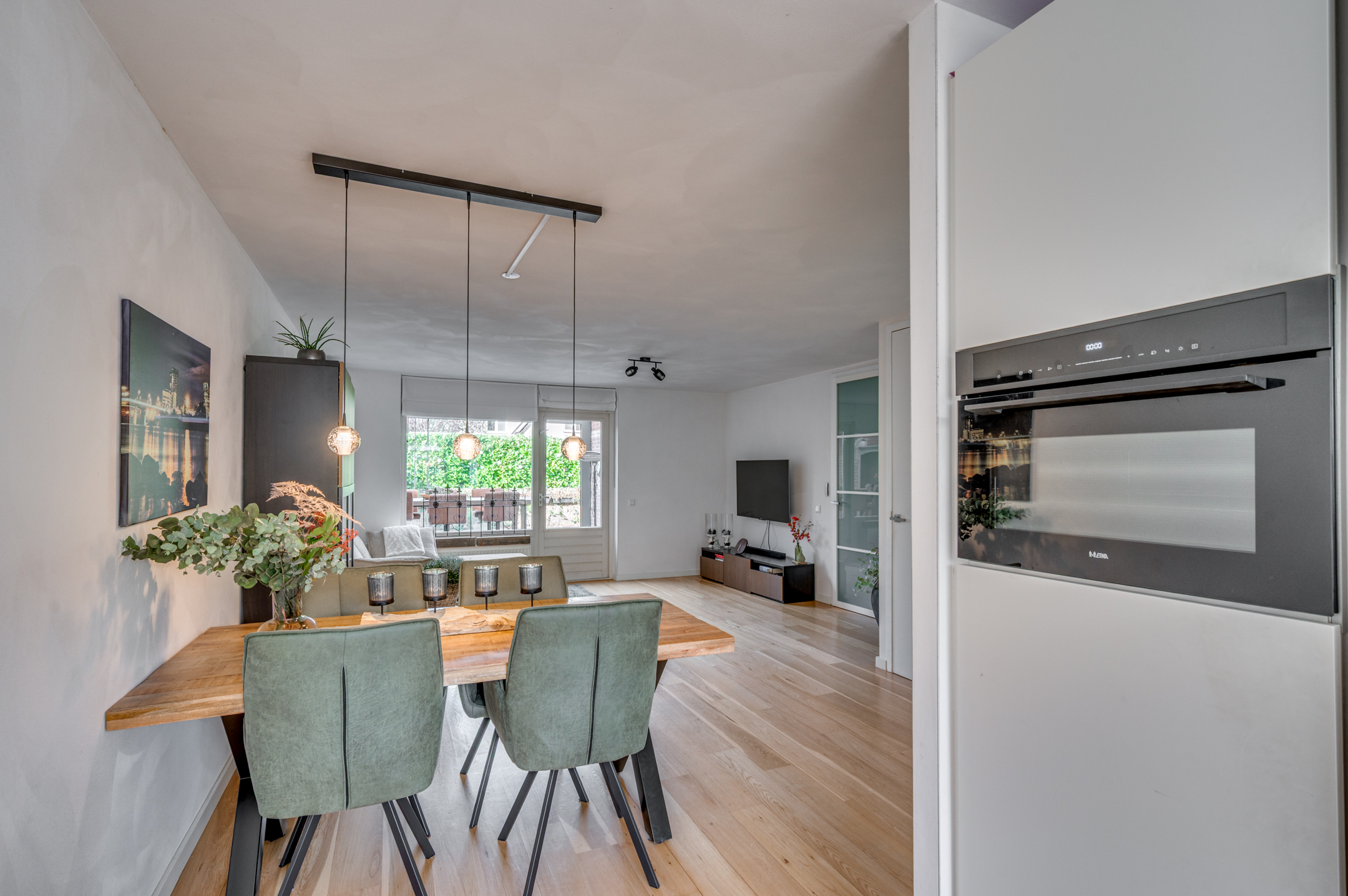 Vanuit de eigen oprit is de entree van de woning en de berging te bereiken. De entree/hal geeft toegang tot de trapopgang naar de 1e verdieping, meterkast, separate toiletruimte en de woonkamer. De geheel betegelde toiletruimte is voorzien van een zwevend toilet, fonteintje en mechanische ventilatie. Middels een loopdeur is er toegang tot de woonkamer met open keuken. De woonkamer is aan de achterzijde ingericht met de zithoek en loopdeur naar de overkapping. De keuken met eethoek is aan de voorzijde gelegen. De keuken is voorzien van een inductiekookplaat met interne afzuiging, vaatwasmachine, koelkast, combioven/ magnetron en spoelbak. De woonkamer beschikt verder over veel lichtinval en een airco. Verder is er een trapkast aanwezig en is er middels een loopdeur toegang tot de hal. De hal geeft de mogelijkheid om de riante slaapkamer, badkamer en inpandige berging te betreden. De slaapkamer is ca. 16m² groot en geeft middels een loopdeur wederom toegang tot de tuin met overkapping welke middels glazen schuifwanden afsluitbaar is. De mooie riante badkamer is modern, volledig betegeld en voorzien van een inloopdouche, wastafel met meubel, zwevend toilet, mechanische ventilatie en een designradiator. De inpandige berging geeft de mogelijkheid om de fietsen etc. in te plaatsen.