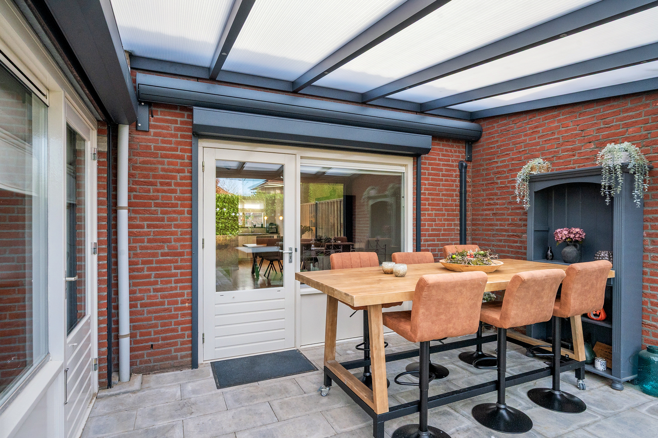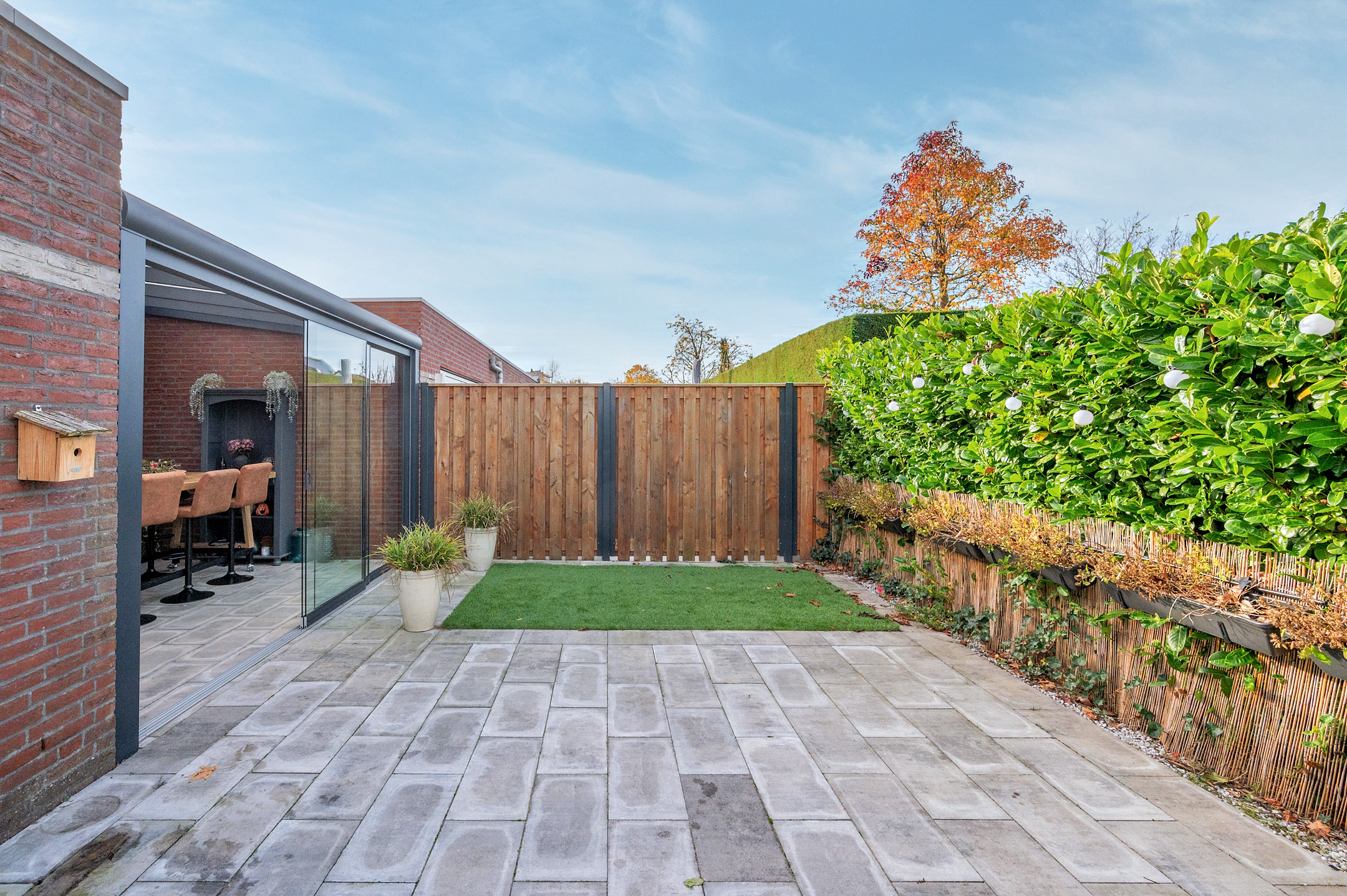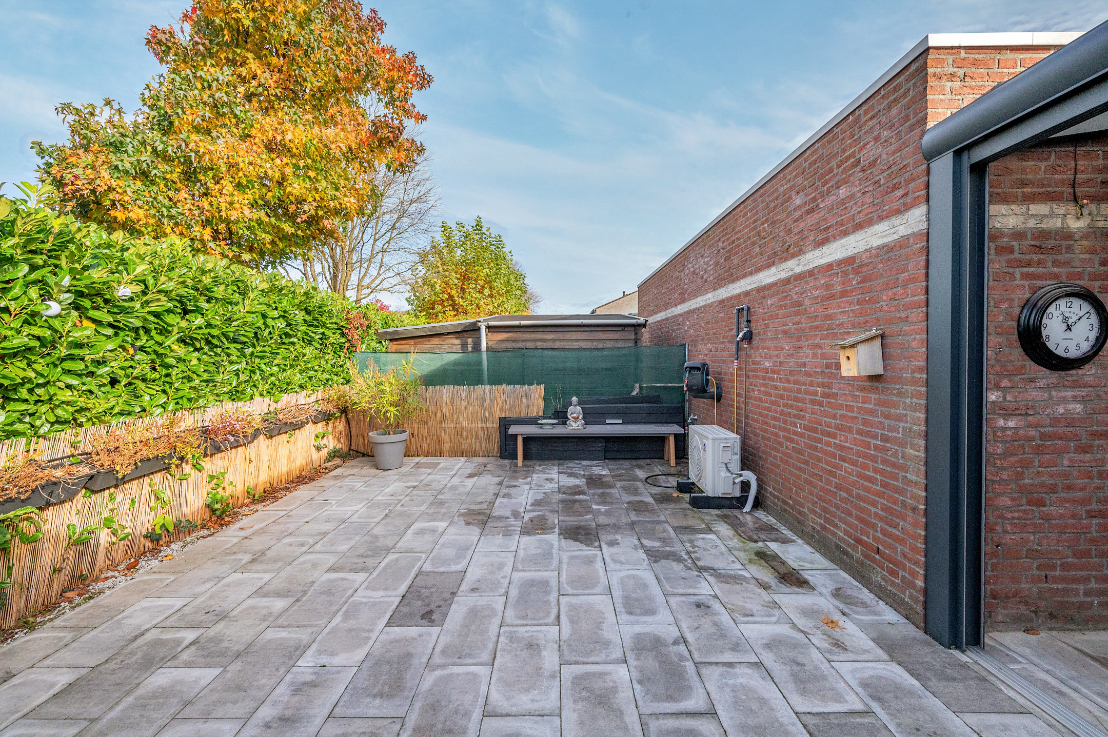 De achtertuin is geheel omheind en geniet veel privacy. De tuin is gelegen op het noordwesten en voorzien van ruim terras met overkapping, welke middels glazenschuifwanden afsluitbaar is. De tuin is verder betegeld en voorzien van kunstgras.