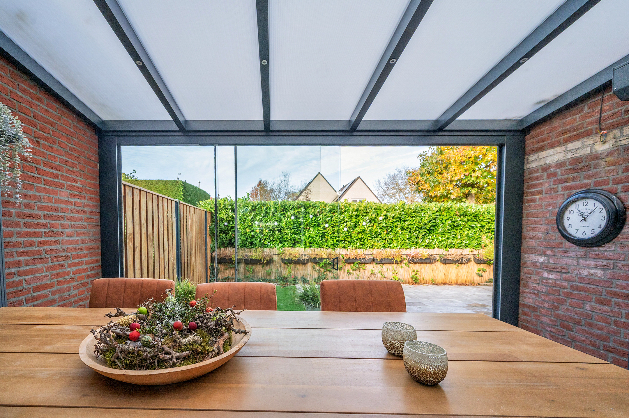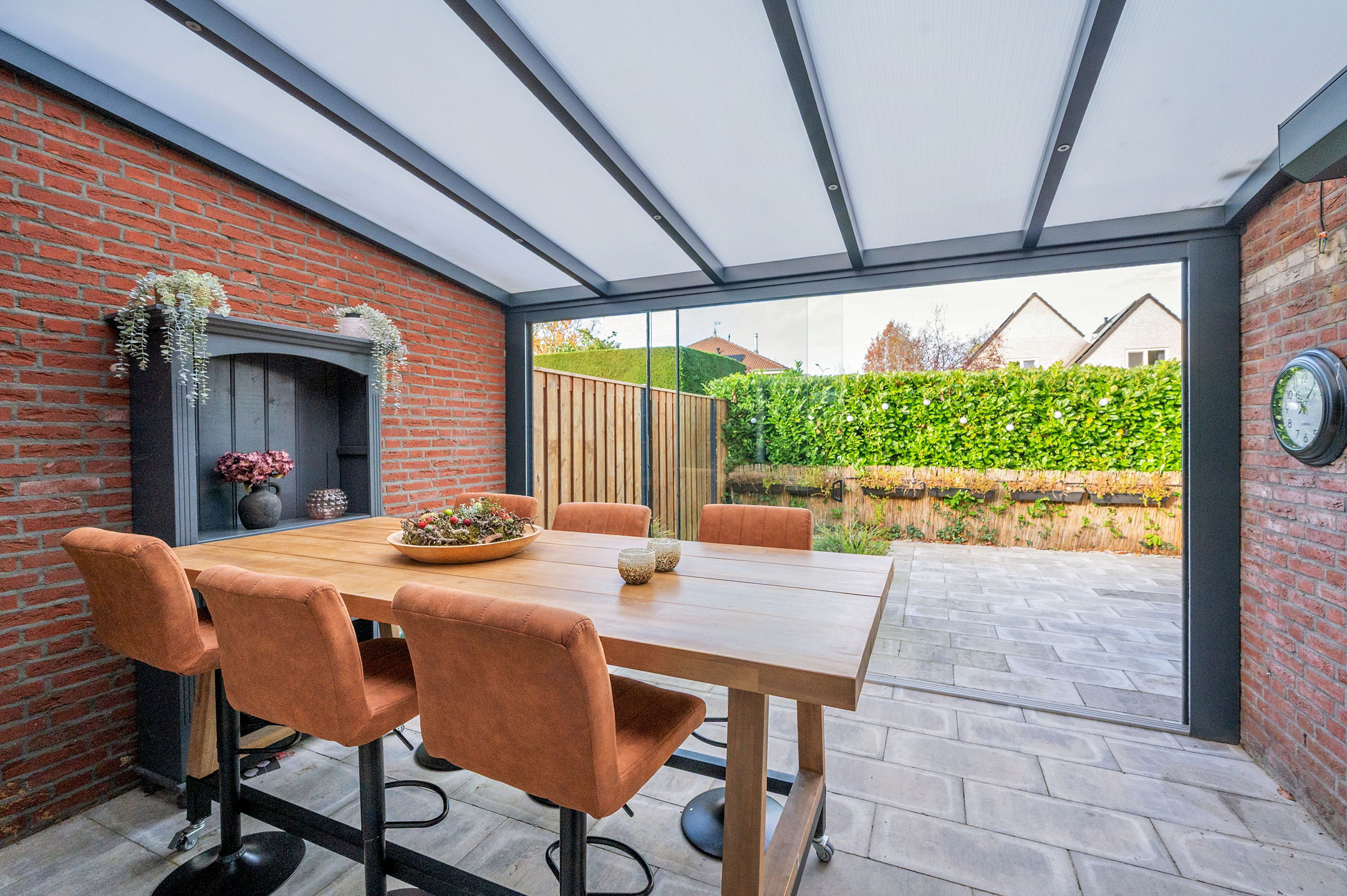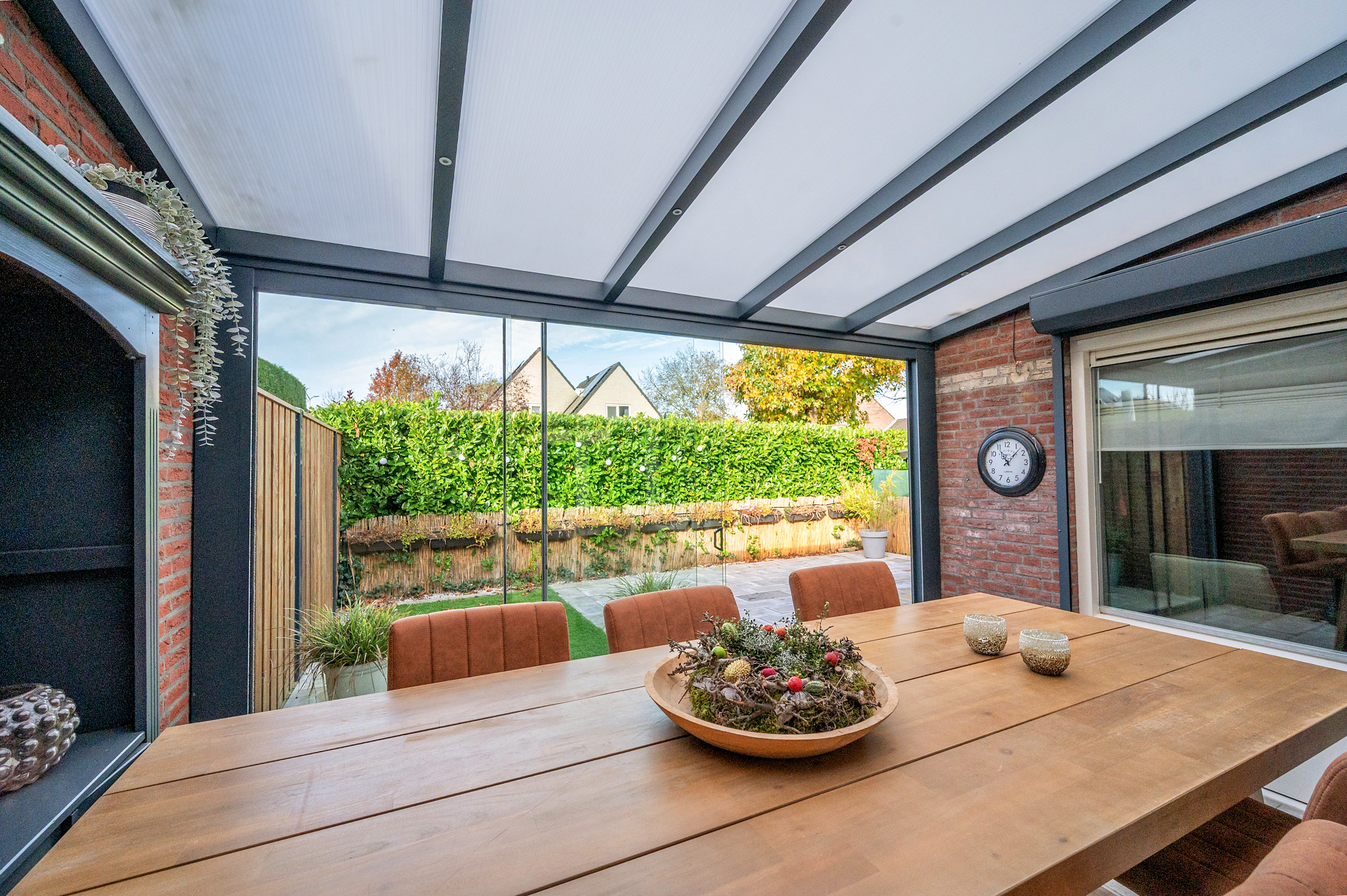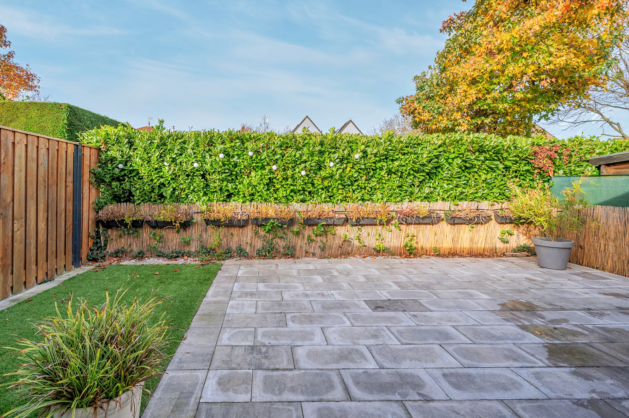 De achtertuin is geheel omheind en geniet veel privacy. De tuin is gelegen op het noordwesten en voorzien van ruim terras met overkapping, welke middels glazenschuifwanden afsluitbaar is. De tuin is verder betegeld en voorzien van kunstgras.