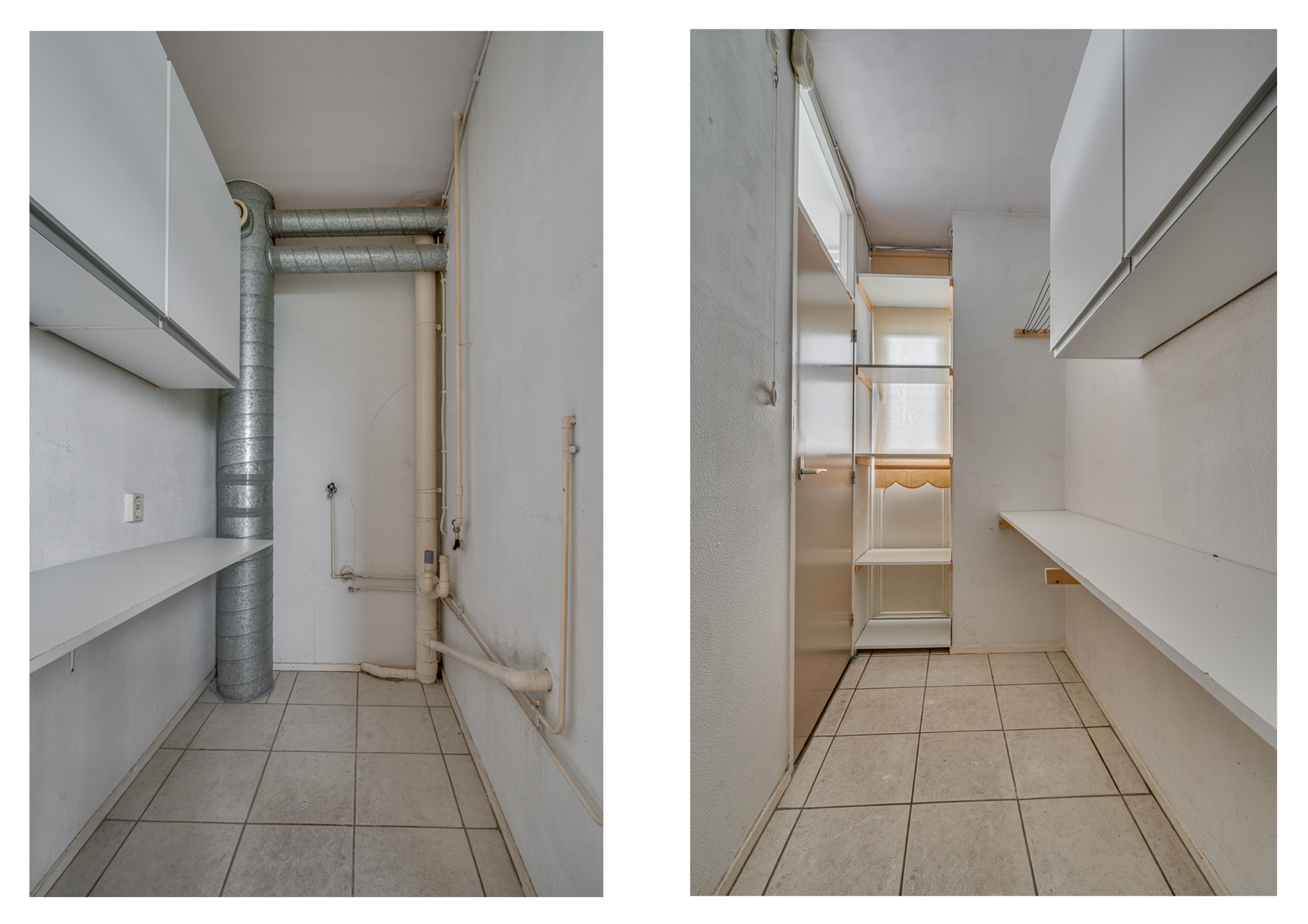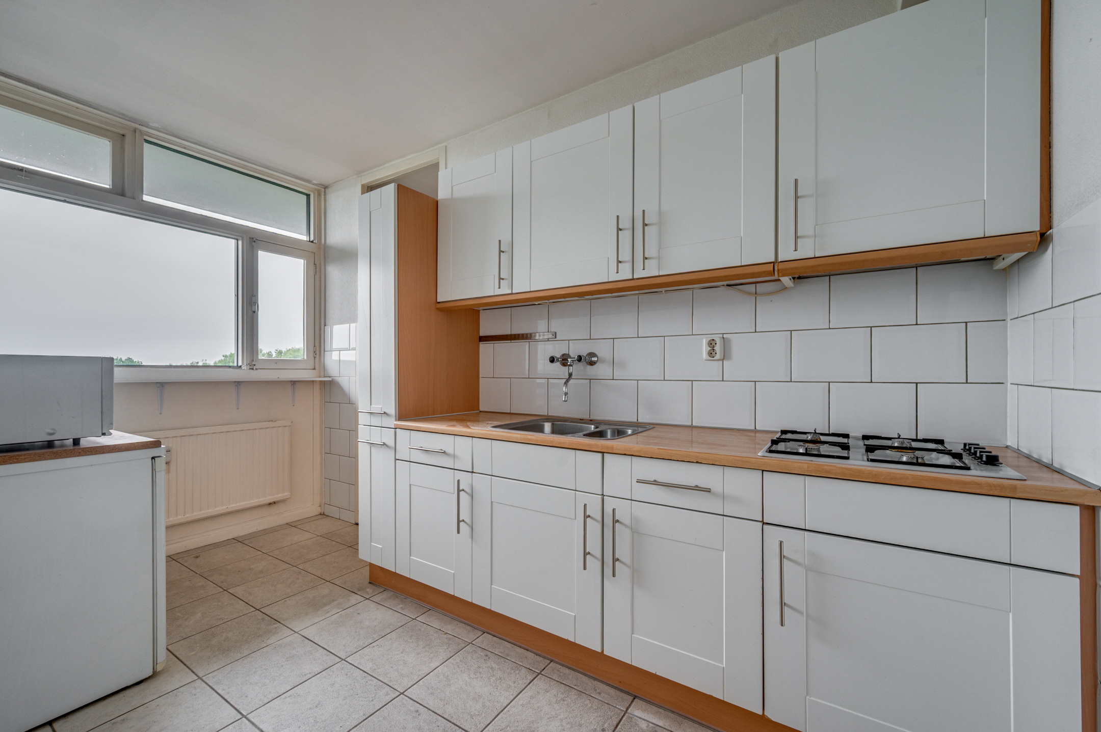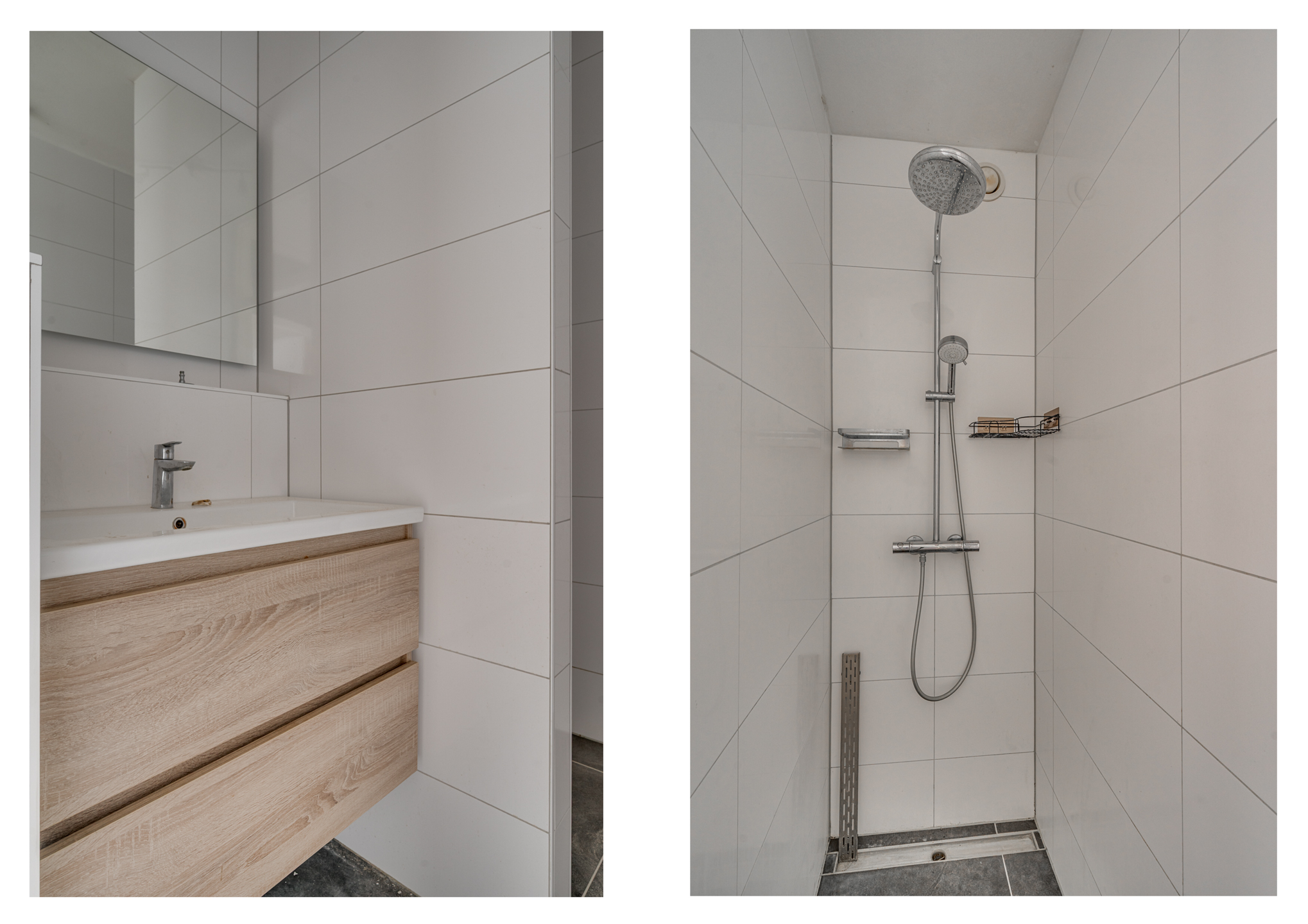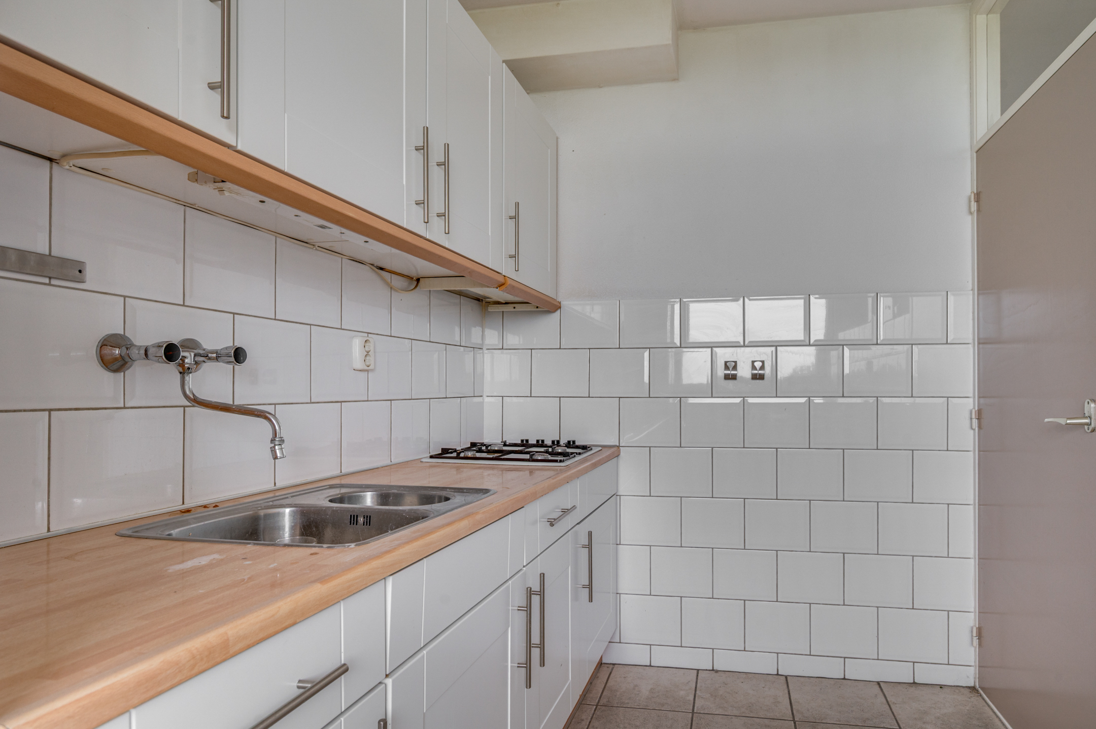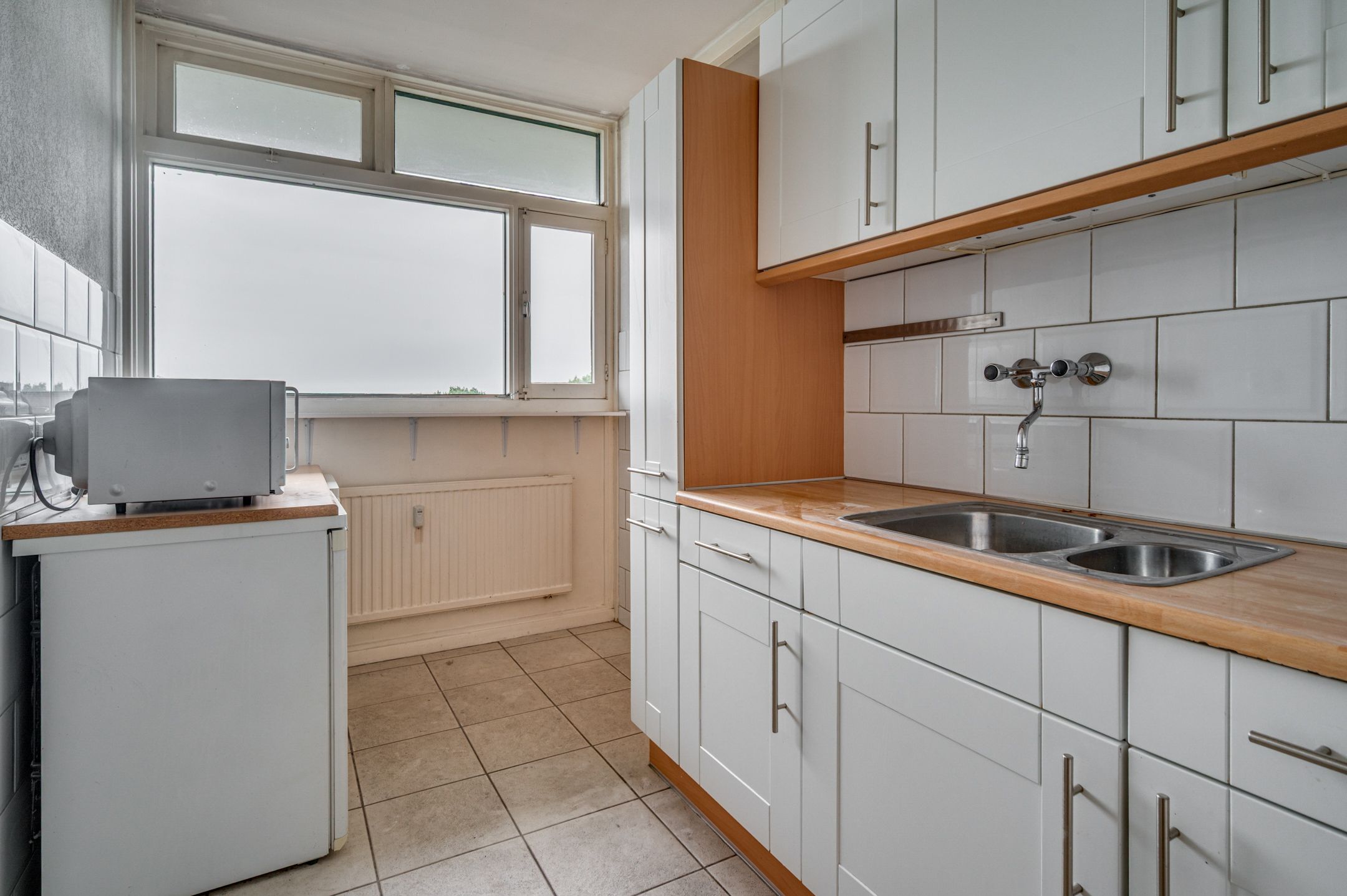 De keuken is aan de linkerzijde van het appartement gelegen en geeft toegang tot de berging/ bijkeuken waar de witgoedaansluitingen te vinden zijn. De keuken is ruim van opzet en voorzien van een tegelvloer, 4-pits gasfornuis, afzuigkap, spoelbak en veel opbergruimte. De toiletruimte is deels betegeld en voorzien van een zwevend toilet en fonteintje. De badkamer is recent vernieuwd en geheel betegeld en voorzien van een inloopdouche, wastafel met meubel en mechanische ventilatie.