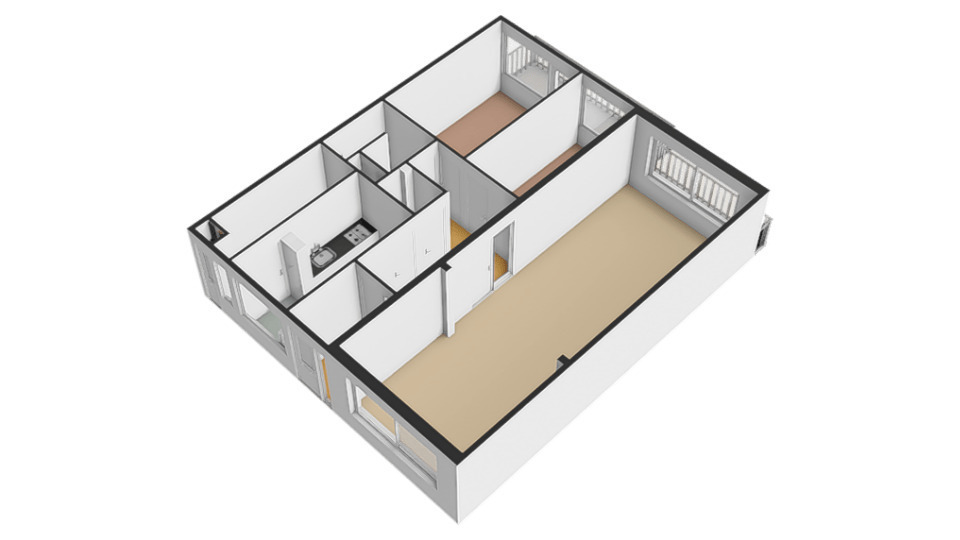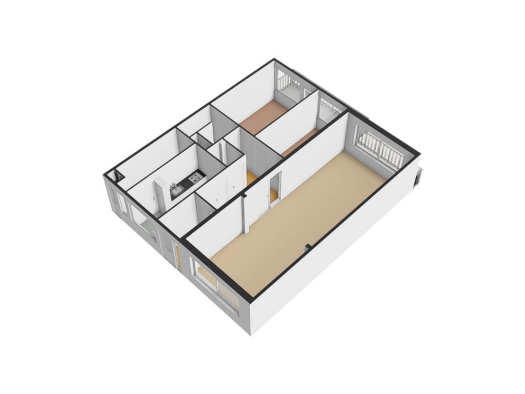 De 2 slaapkamers zijn aan de achterzijde van het appartement gelegen en ca. 8m² en 12,5m² groot. Middels de master bedroom is het ruime balkon gelegen. Aan de rechterzijde van het appartement is over de gehele lengte van het appartement de woonkamer gelegen. Deze is ca. 38,5m² groot en geniet veel lichtinval. Het appartement geeft de mogelijkheid om geheel naar eigen smaak in te richten.