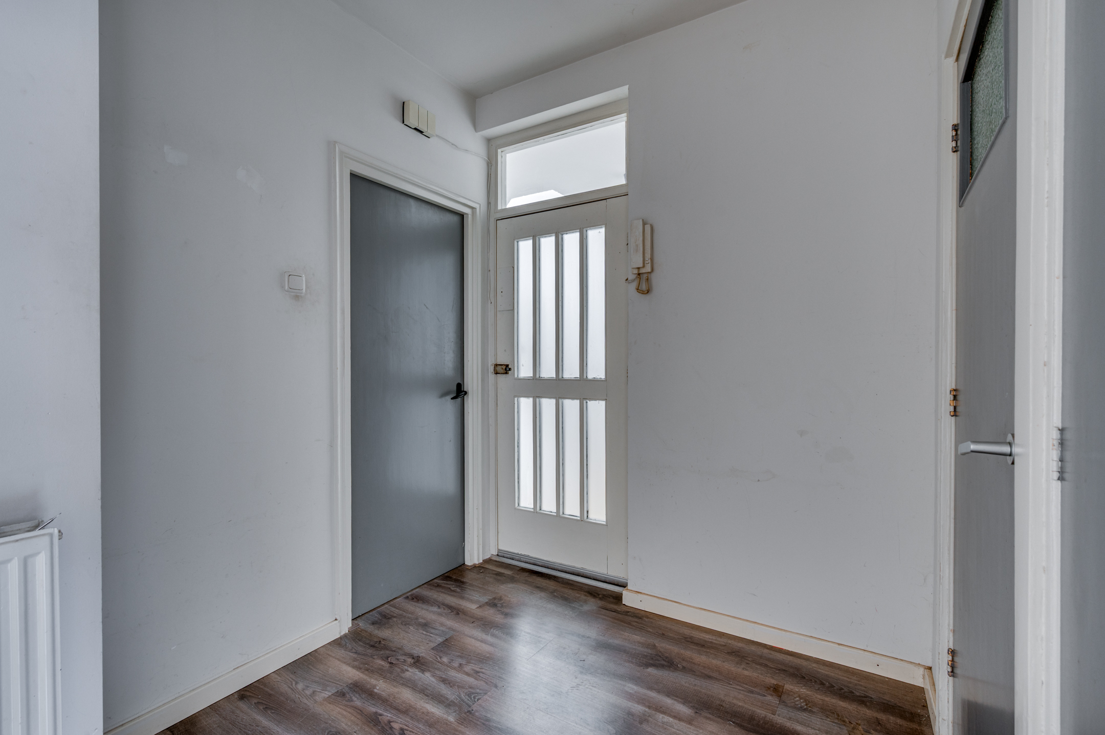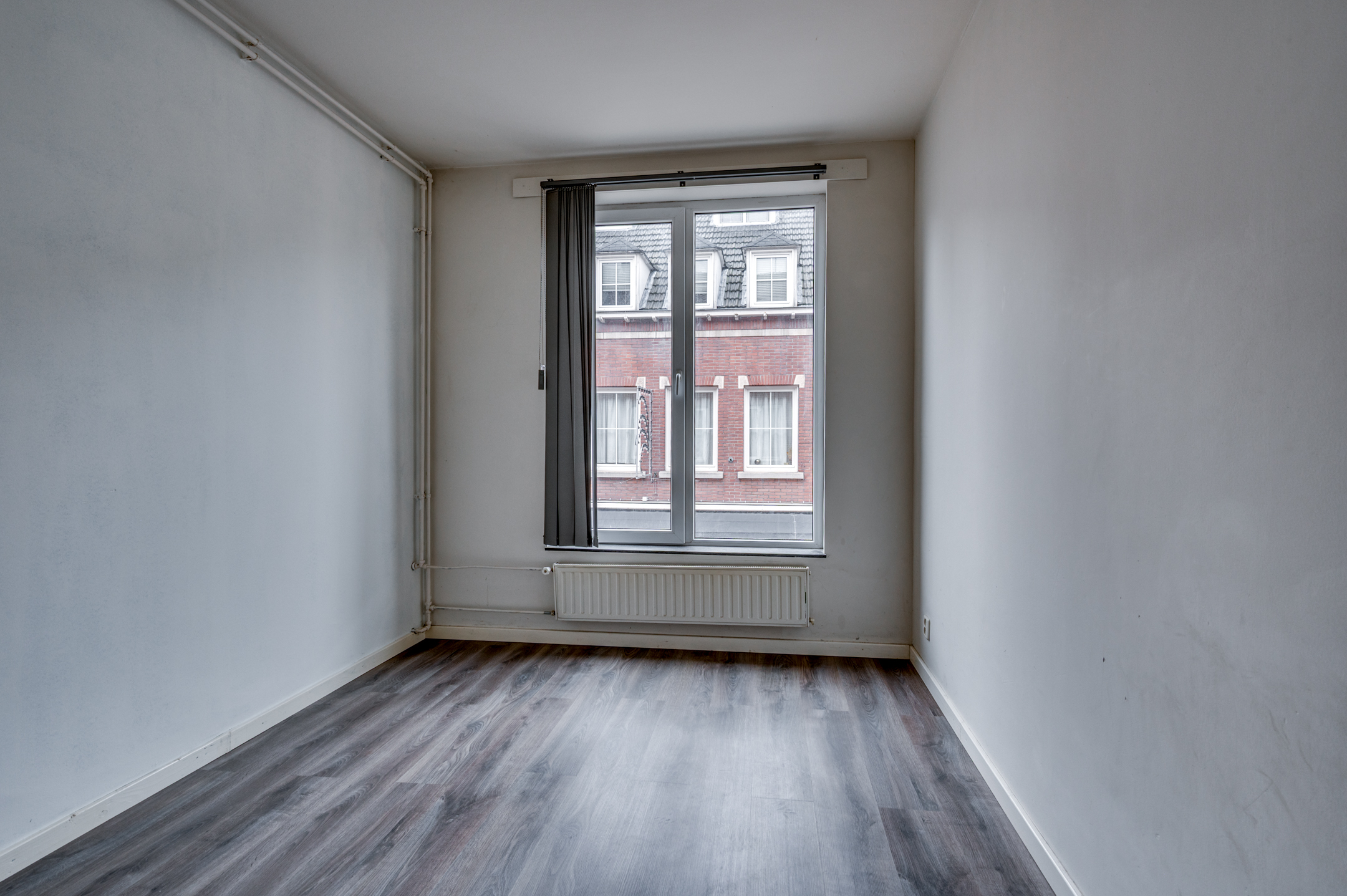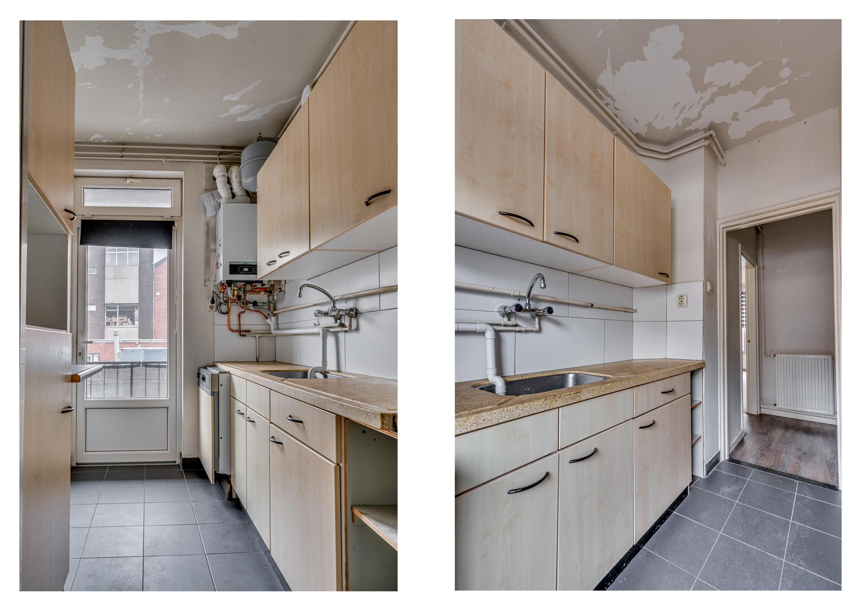 De ruime hal geeft toegang tot de slaapkamer, separate toiletruimte, keuken en de woonkamer. De slaapkamer welke aan de voorzijde is gelegen is ca. 10,5m² groot en voorzien van een muurkast. De separate toiletruimte is deels betegeld en voorzien van een toilet met fonteintje. De keuken is ruim van opzet en beschikt over een loopdeur naar het balkon, loopdeur naar de badkamer en verder is hier de CV-ketel (Nefit 2025 eigendom) gepositioneerd. De badkamer beschikt over een inloopdouche, wastafel, verwarming en buitenraam. De eigenaar heeft het plafond in de badkamer en de keuken afgestoken zoals op de foto's is te zien. De ruime doorzonwoonkamer geniet veel lichtinval door de grote raampartijen. Aan de achterzijde is het mogelijk het balkon te betreden. Het gehele appartement is voorzien van kunststof kozijnen en een laminaatvloer.