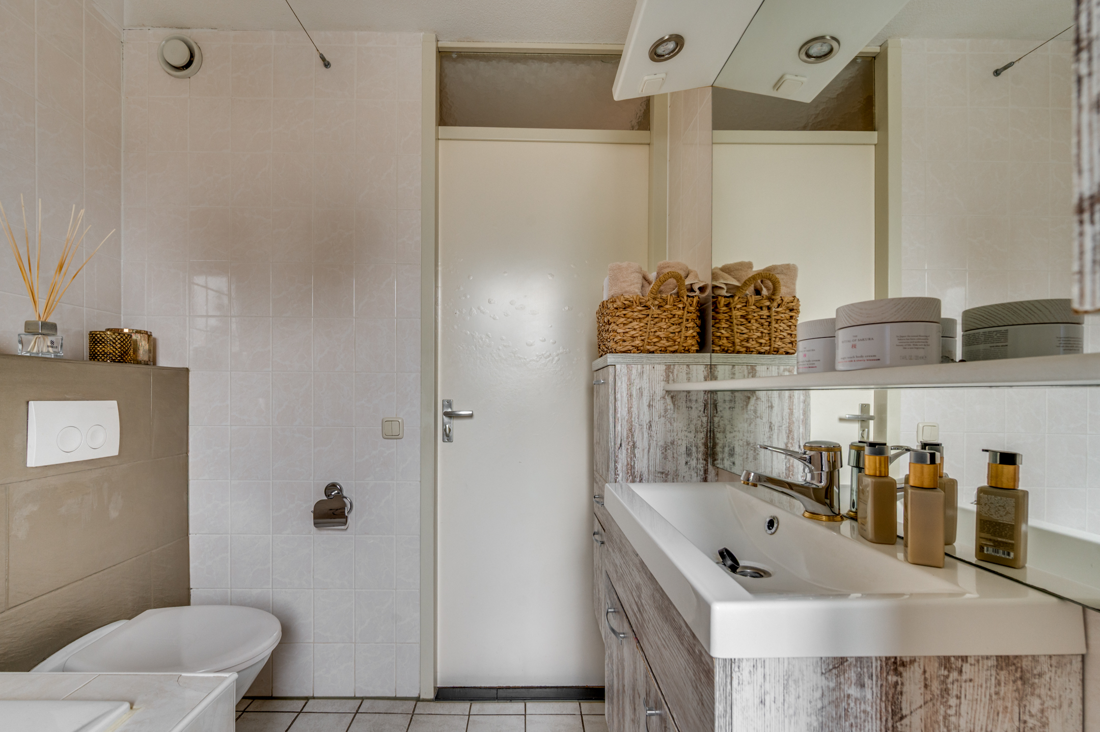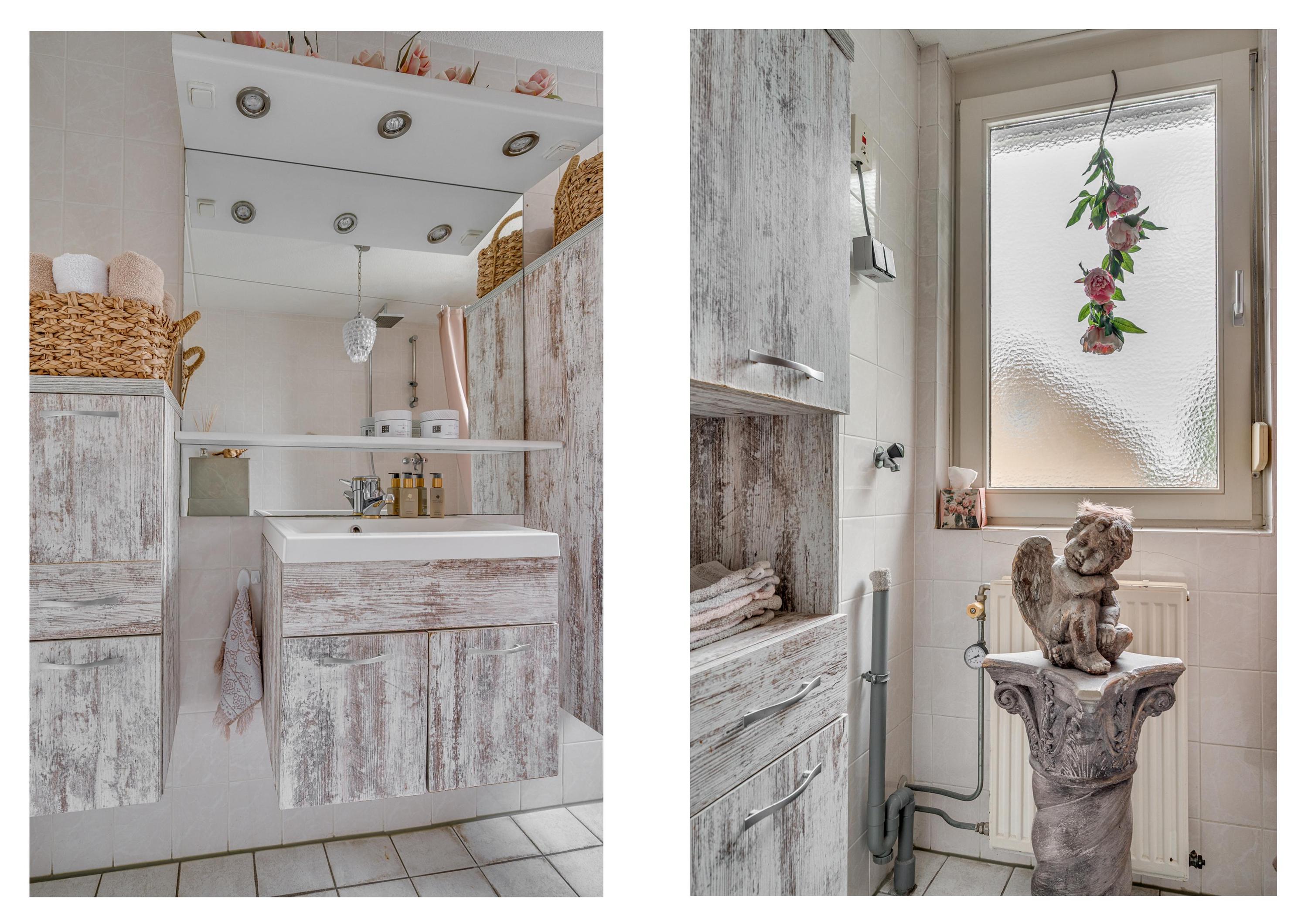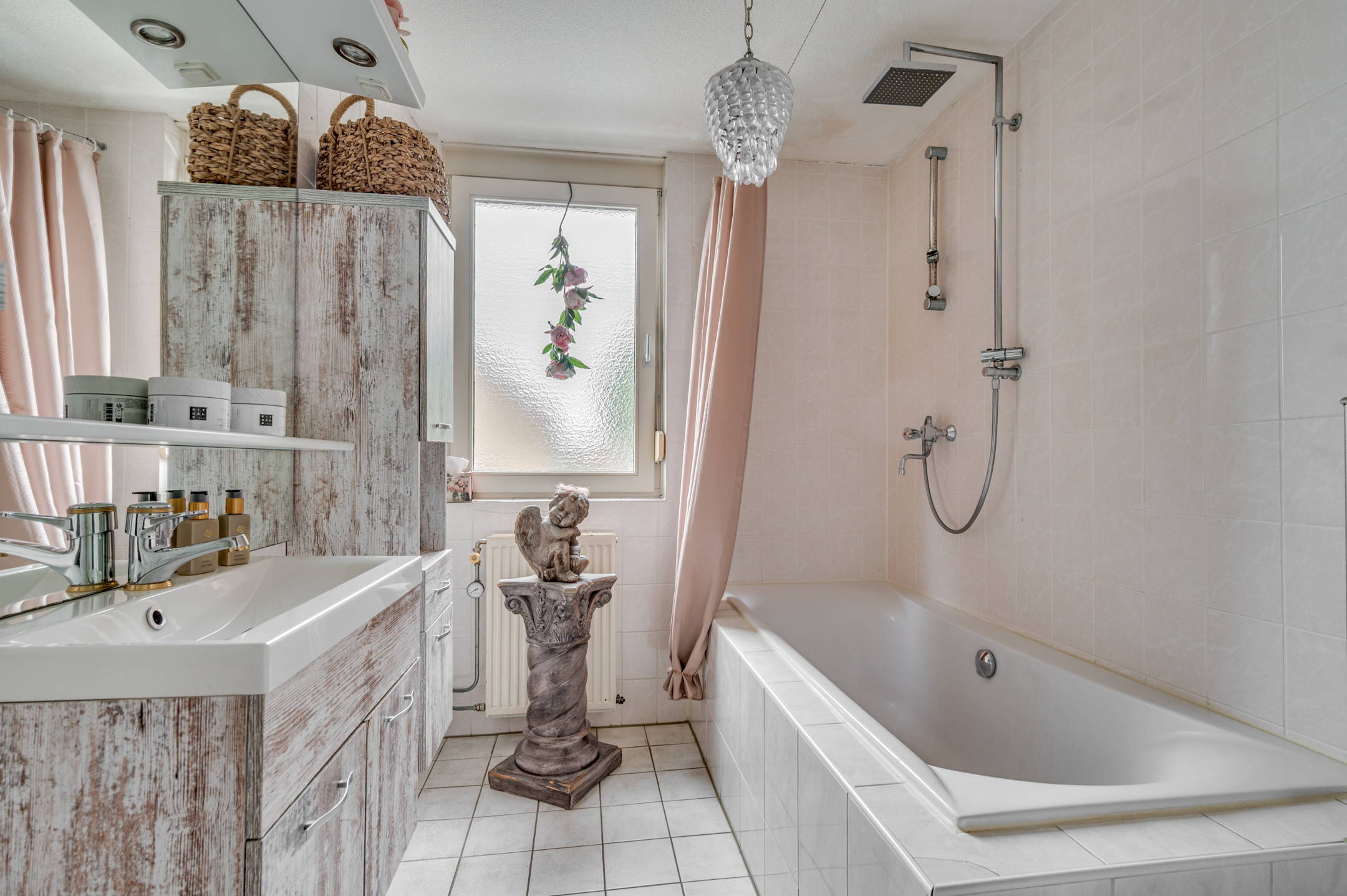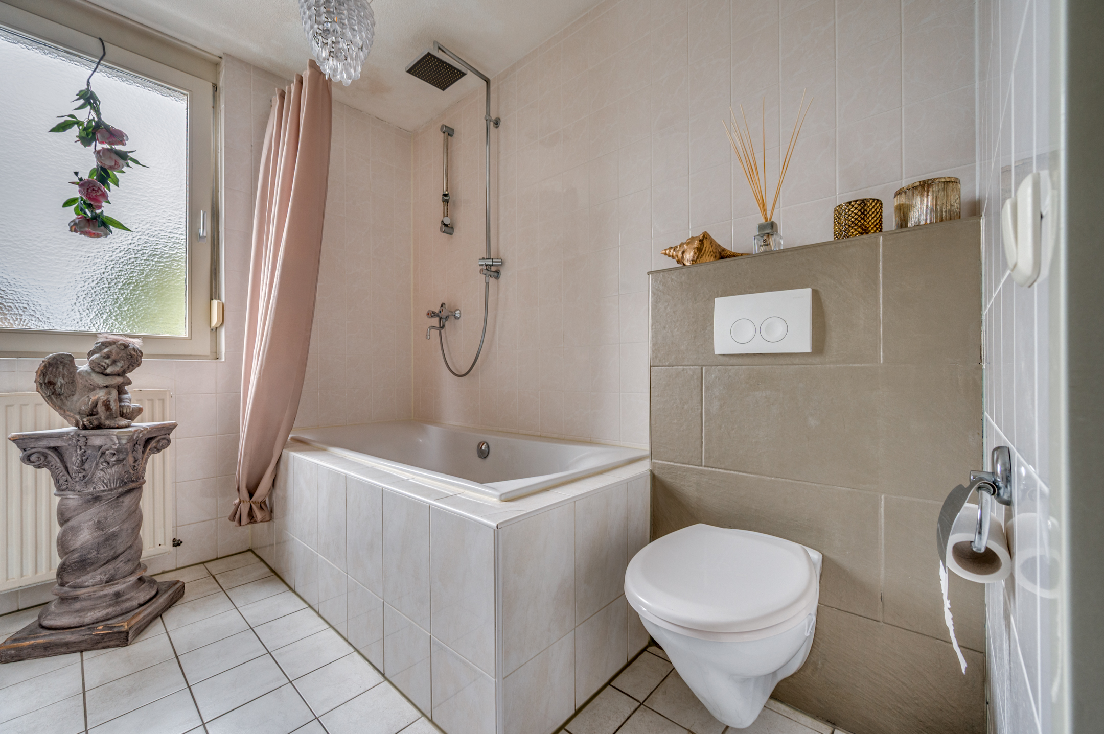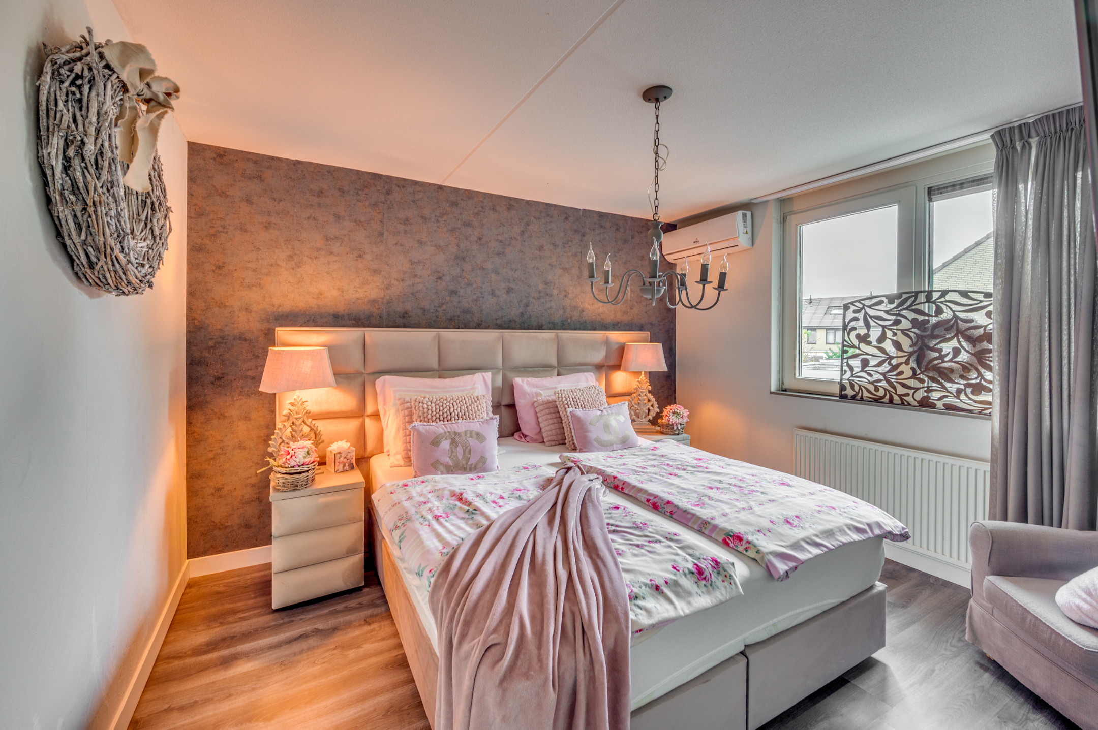 De overloop geeft toegang tot de 3 slaapkamers en badkamer. De slaapkamers zijn ca. 6,5m², 11,5m² en 12,5m² groot en allen voorzien van eenzelfde laminaatlover en rolluiken. De masterbedroom heeft verder de beschikking over een airco. De badkamer is volledig betegeld en voorzien van een ligbad met douchefaciliteit, wastafel met meubel, zwevend toilet, verwarming, mechanische ventilatie, buitenraam en een rolluik.