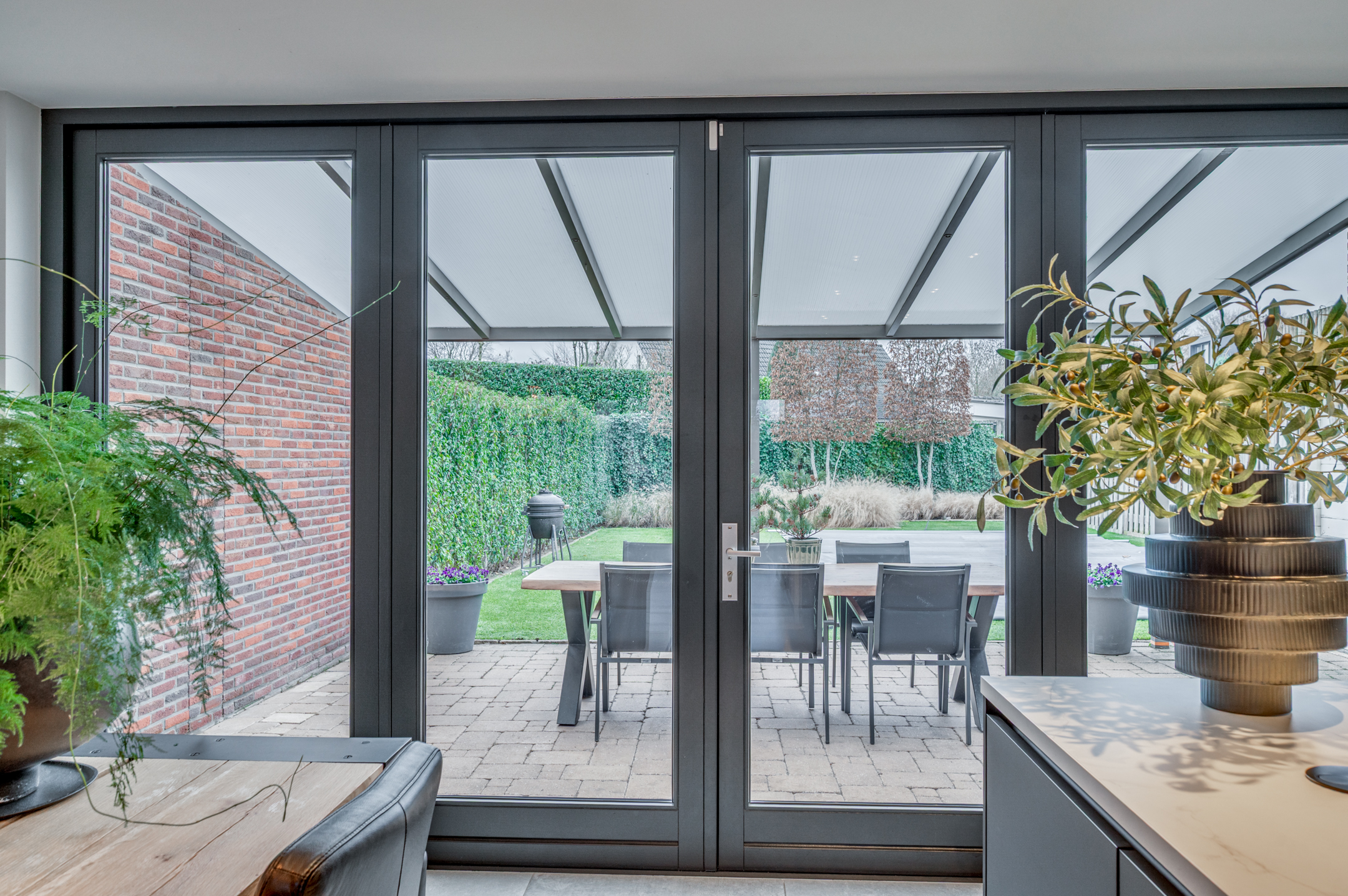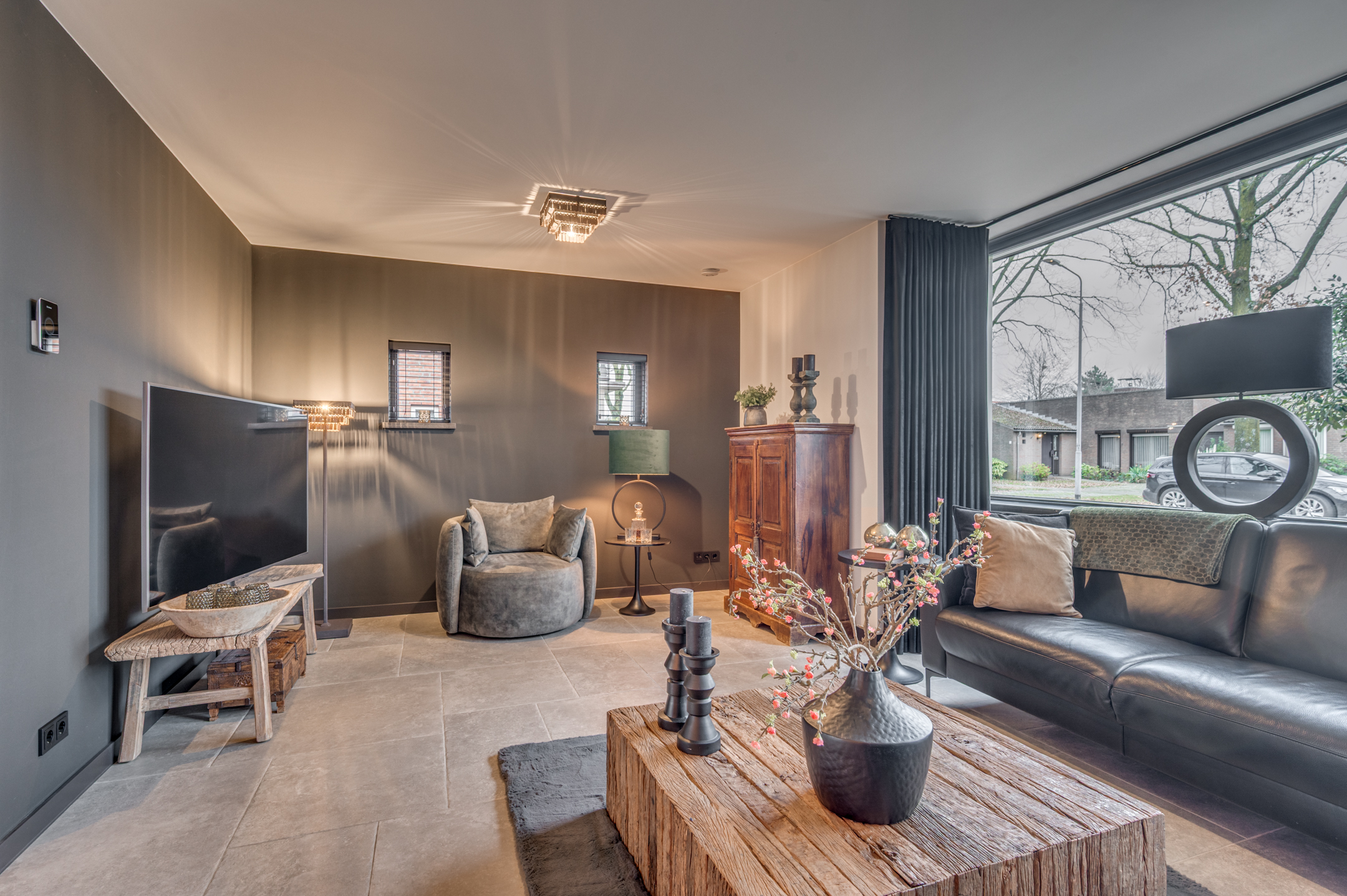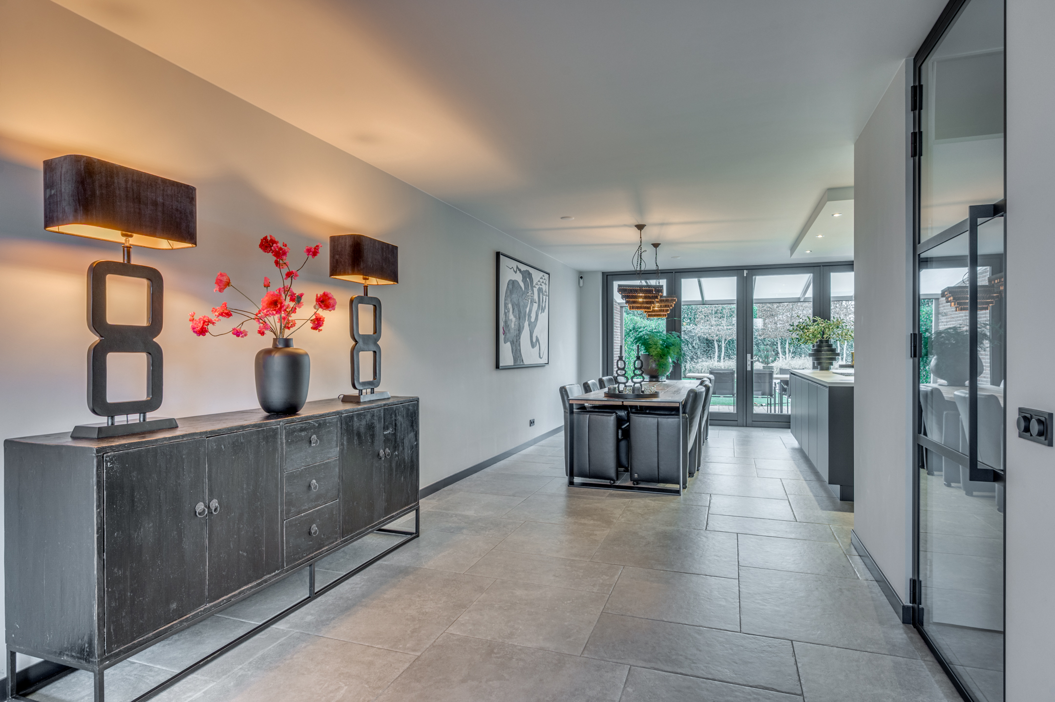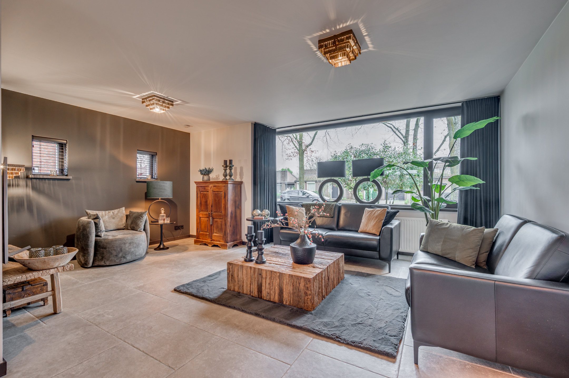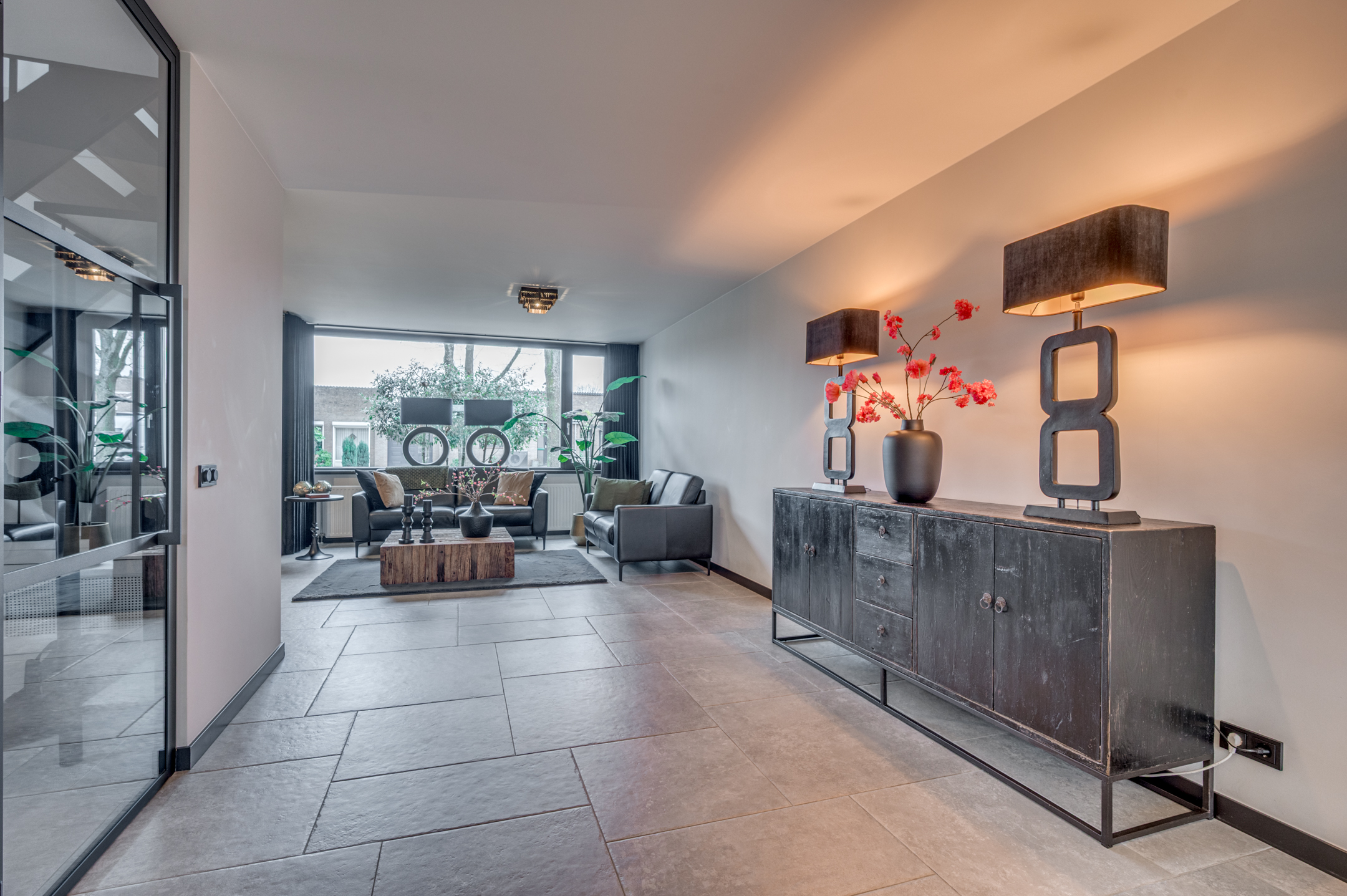 Vanuit de eigen oprit welke plek biedt aan 3 auto's is de garage en de entree tot de woning te bereiken. De overdekte entree geeft toegang tot de ontvangsthal. De hal geeft toegang tot de meterkast, toiletruimte, trapopgang naar de 1e verdieping en loopdeur naar de woonkamer. De half betegelde toiletruimte is voorzien van een zwevend toilet, fonteintje en mechanische ventilatie. De sfeervolle stalen deur geeft toegang tot de zeer ruime woonkamer, Door de grote ramen in de woning is er veel natuurlijk lichtinval. Aan de voorzijde is de zithoek gepositioneerd en aan de achterzijde de riante open keuken. De keuken beschikt over een kookeiland welke is voorzien van een BORA inductiekookplaat. Verder is de woning van alles voorzien zoals inbouw koffieapparaat, combioven/ magnetron, spoelbak, koelkast, vaatwasmachine en zeer veel opbergruimte. Alle apparaten zijn van het merk Bosch. Verder beschikt de keuken over een airco (2023) die de gehele keuken en woonkamer verkoeld en verwarmd, loopdeur naar de garage/wasruimte en 2 openslaande tuindeuren die volledig kunnen worden geopend over de gehele breedte van de woning om binnen met buiten te verbinden. De garage welke beschikt over een een elektrische poort is omgebouwd naar wasruimte en heeft genoeg ruimte voor opslag, fietsen etc. De gehele begane grond is voorzien van een tegelvloer. Tevens is de woonkamer met open keuken voorzien van vloerverwarming.