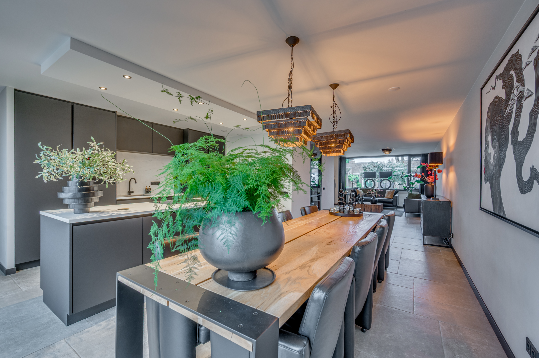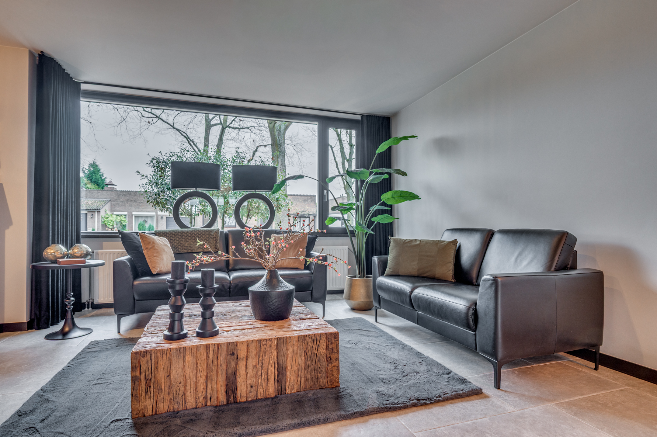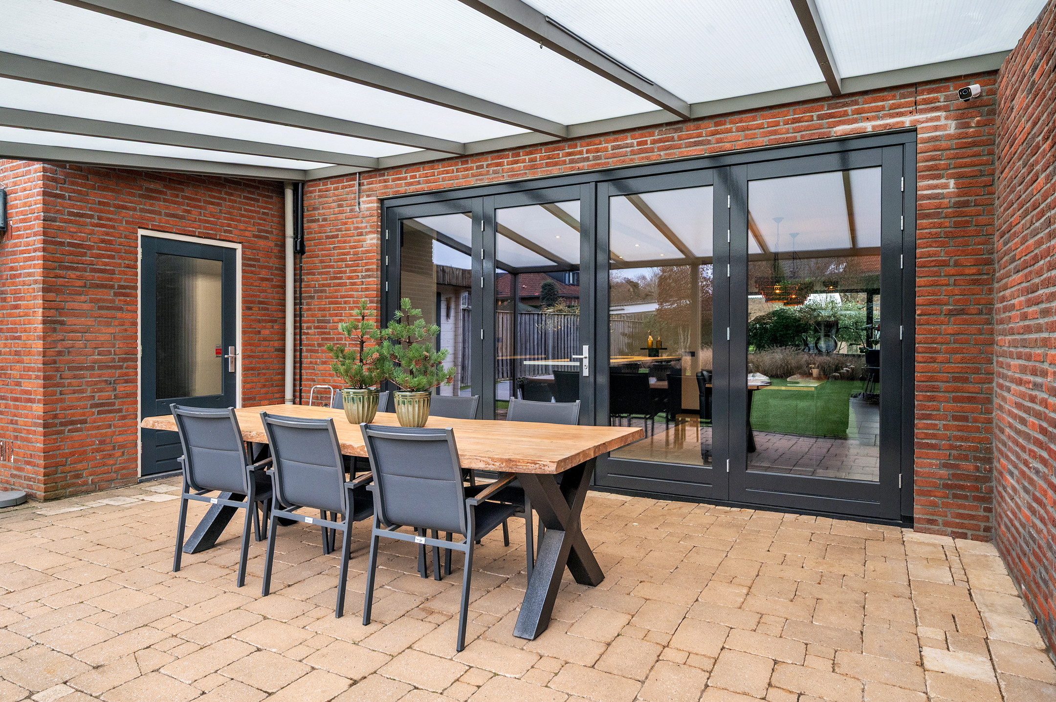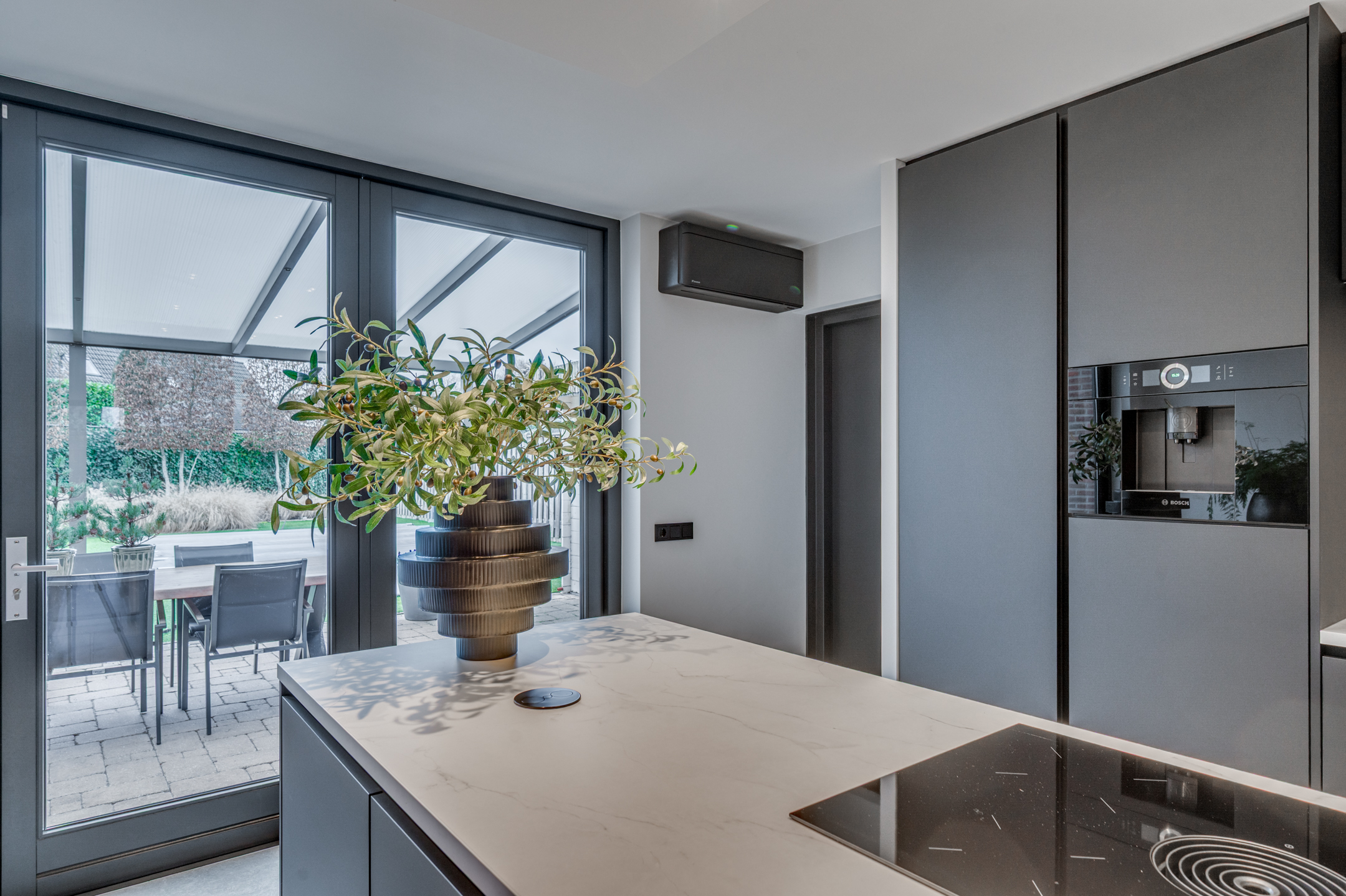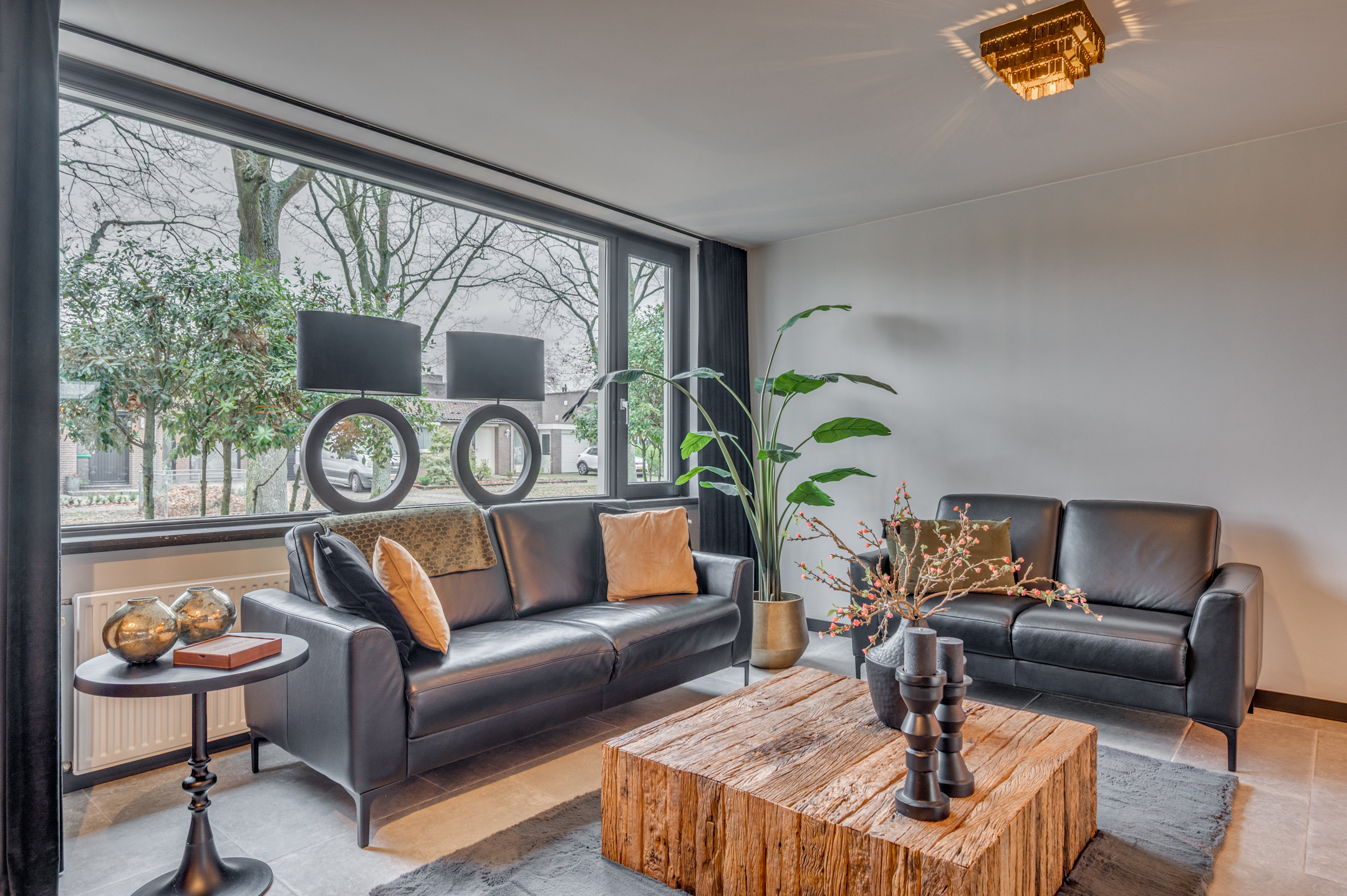 Vanuit de eigen oprit welke plek biedt aan 3 auto's is de garage en de entree tot de woning te bereiken. De overdekte entree geeft toegang tot de ontvangsthal. De hal geeft toegang tot de meterkast, toiletruimte, trapopgang naar de 1e verdieping en loopdeur naar de woonkamer. De half betegelde toiletruimte is voorzien van een zwevend toilet, fonteintje en mechanische ventilatie. De sfeervolle stalen deur geeft toegang tot de zeer ruime woonkamer, Door de grote ramen in de woning is er veel natuurlijk lichtinval. Aan de voorzijde is de zithoek gepositioneerd en aan de achterzijde de riante open keuken. De keuken beschikt over een kookeiland welke is voorzien van een BORA inductiekookplaat. Verder is de woning van alles voorzien zoals inbouw koffieapparaat, combioven/ magnetron, spoelbak, koelkast, vaatwasmachine en zeer veel opbergruimte. Alle apparaten zijn van het merk Bosch. Verder beschikt de keuken over een airco (2023) die de gehele keuken en woonkamer verkoeld en verwarmd, loopdeur naar de garage/wasruimte en 2 openslaande tuindeuren die volledig kunnen worden geopend over de gehele breedte van de woning om binnen met buiten te verbinden. De garage welke beschikt over een een elektrische poort is omgebouwd naar wasruimte en heeft genoeg ruimte voor opslag, fietsen etc. De gehele begane grond is voorzien van een tegelvloer. Tevens is de woonkamer met open keuken voorzien van vloerverwarming.