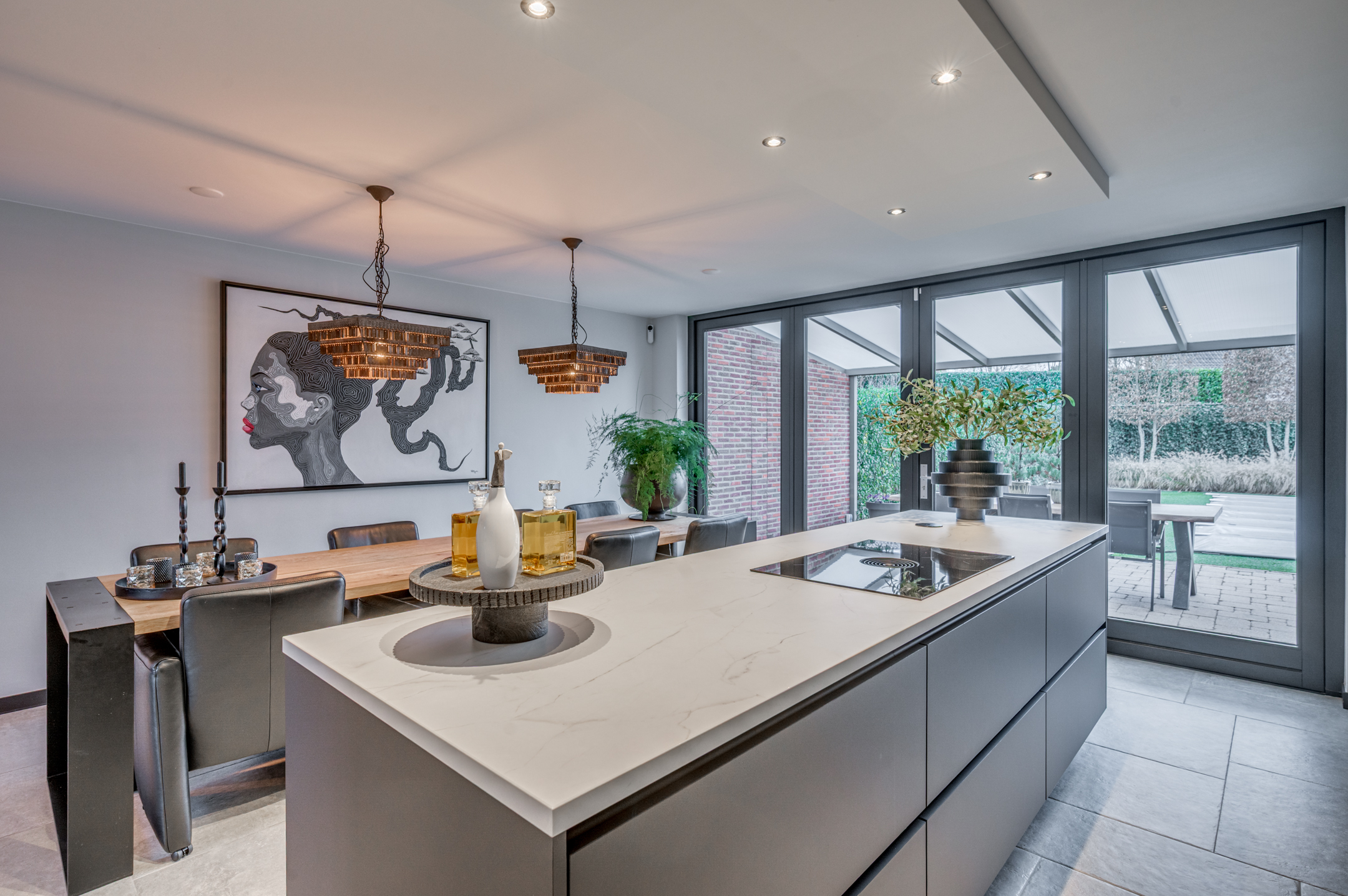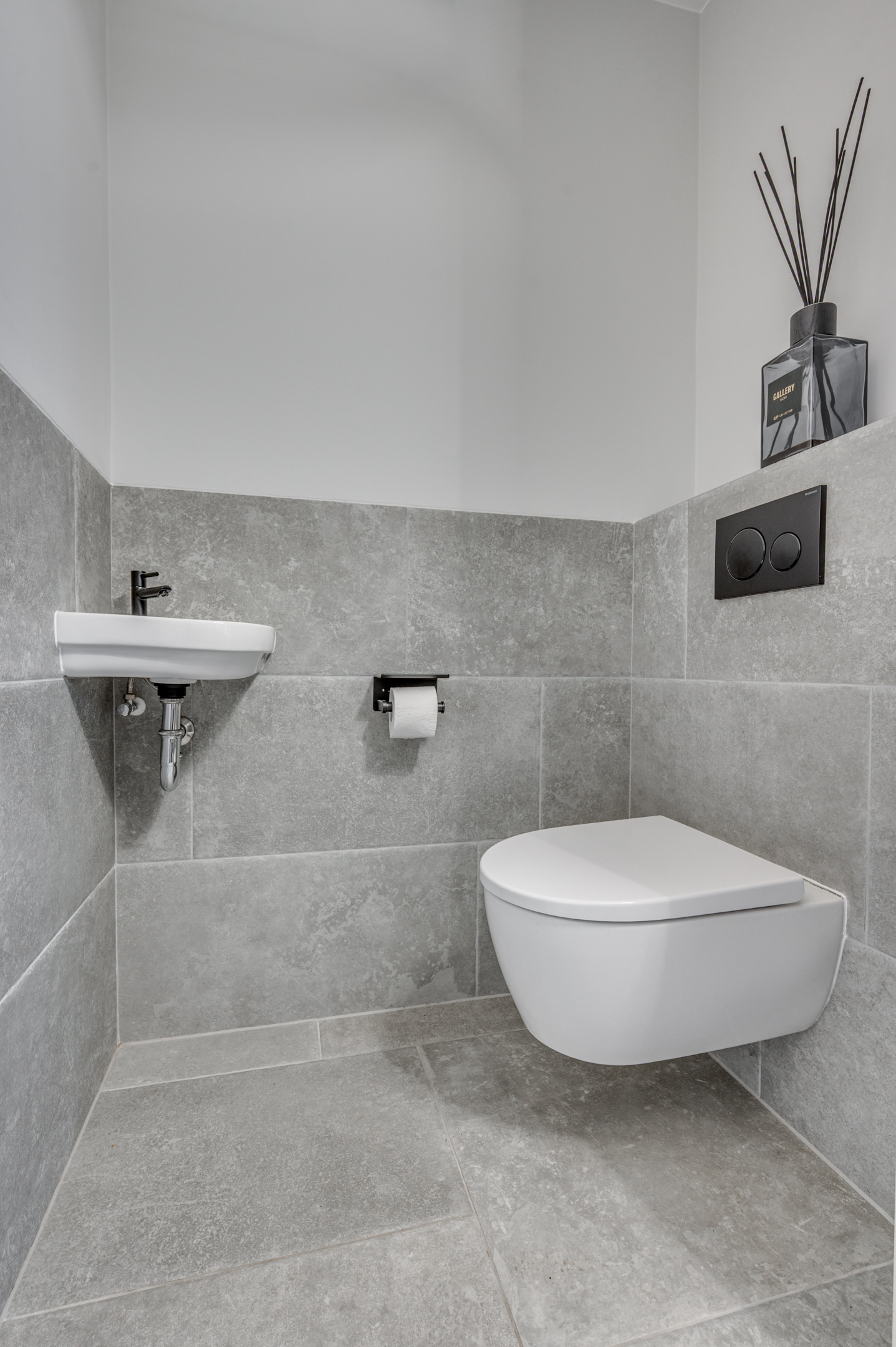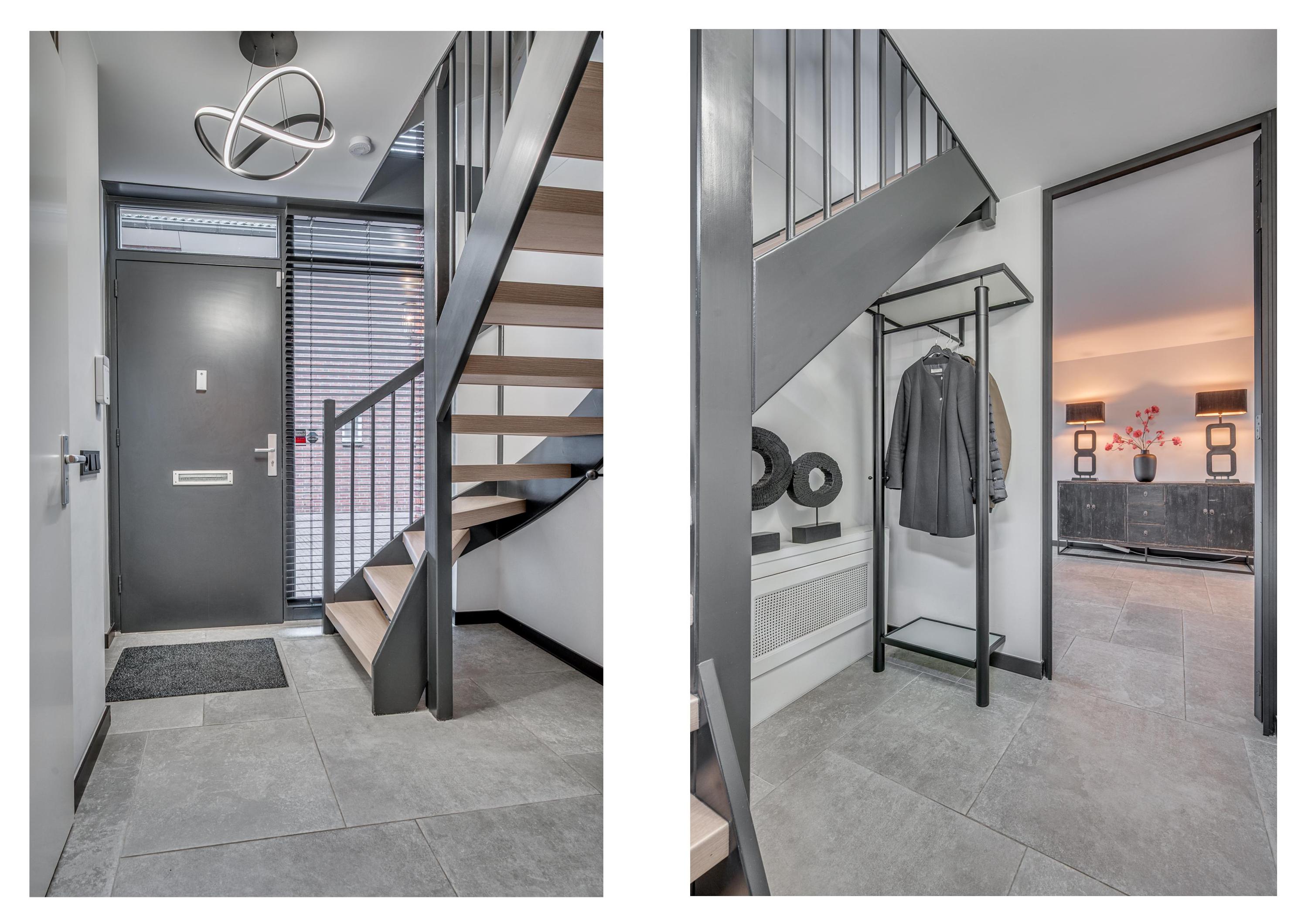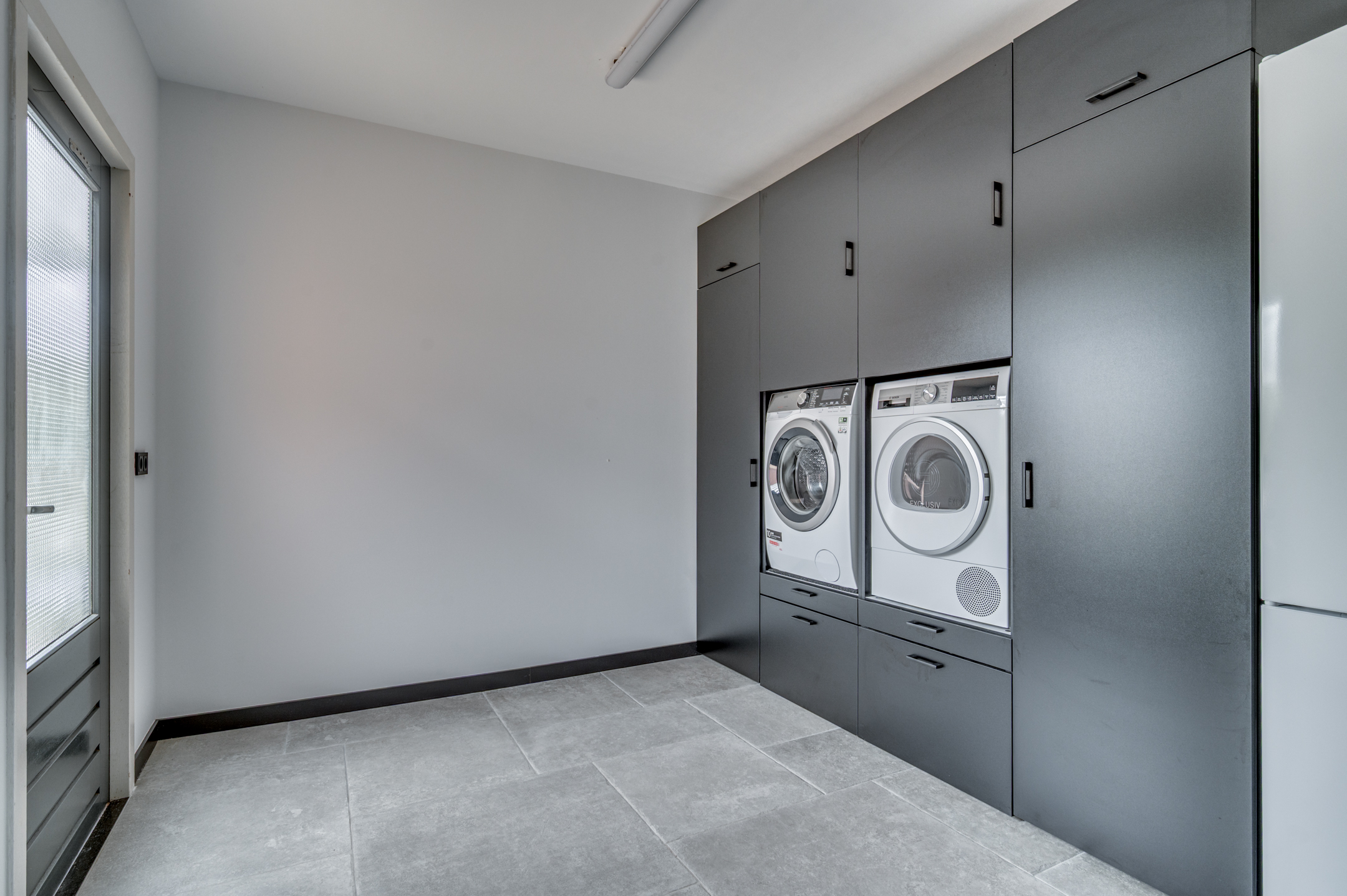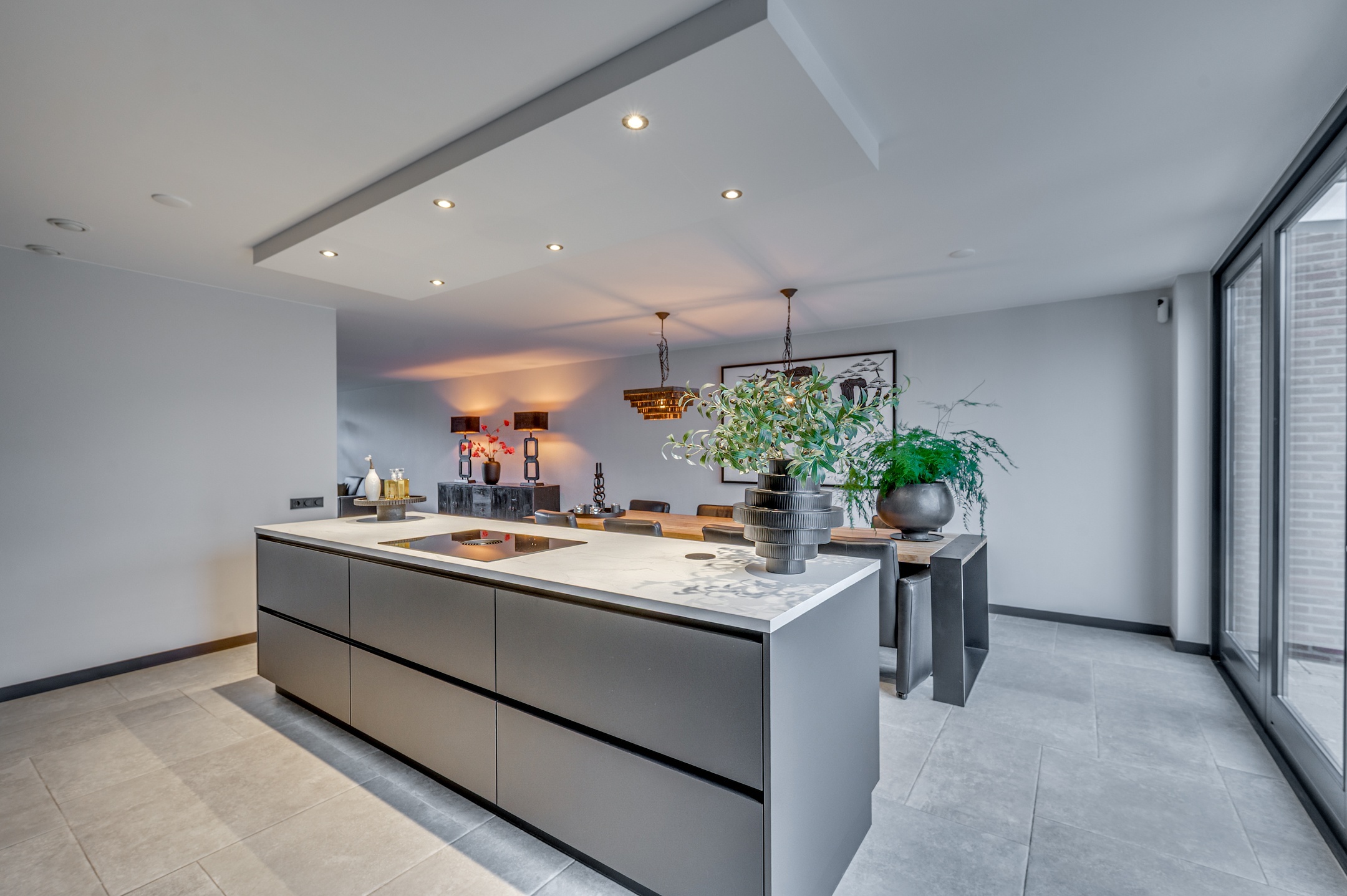 Vanuit de eigen oprit welke plek biedt aan 3 auto's is de garage en de entree tot de woning te bereiken. De overdekte entree geeft toegang tot de ontvangsthal. De hal geeft toegang tot de meterkast, toiletruimte, trapopgang naar de 1e verdieping en loopdeur naar de woonkamer. De half betegelde toiletruimte is voorzien van een zwevend toilet, fonteintje en mechanische ventilatie. De sfeervolle stalen deur geeft toegang tot de zeer ruime woonkamer, Door de grote ramen in de woning is er veel natuurlijk lichtinval. Aan de voorzijde is de zithoek gepositioneerd en aan de achterzijde de riante open keuken. De keuken beschikt over een kookeiland welke is voorzien van een BORA inductiekookplaat. Verder is de woning van alles voorzien zoals inbouw koffieapparaat, combioven/ magnetron, spoelbak, koelkast, vaatwasmachine en zeer veel opbergruimte. Alle apparaten zijn van het merk Bosch. Verder beschikt de keuken over een airco (2023) die de gehele keuken en woonkamer verkoeld en verwarmd, loopdeur naar de garage/wasruimte en 2 openslaande tuindeuren die volledig kunnen worden geopend over de gehele breedte van de woning om binnen met buiten te verbinden. De garage welke beschikt over een een elektrische poort is omgebouwd naar wasruimte en heeft genoeg ruimte voor opslag, fietsen etc. De gehele begane grond is voorzien van een tegelvloer. Tevens is de woonkamer met open keuken voorzien van vloerverwarming.