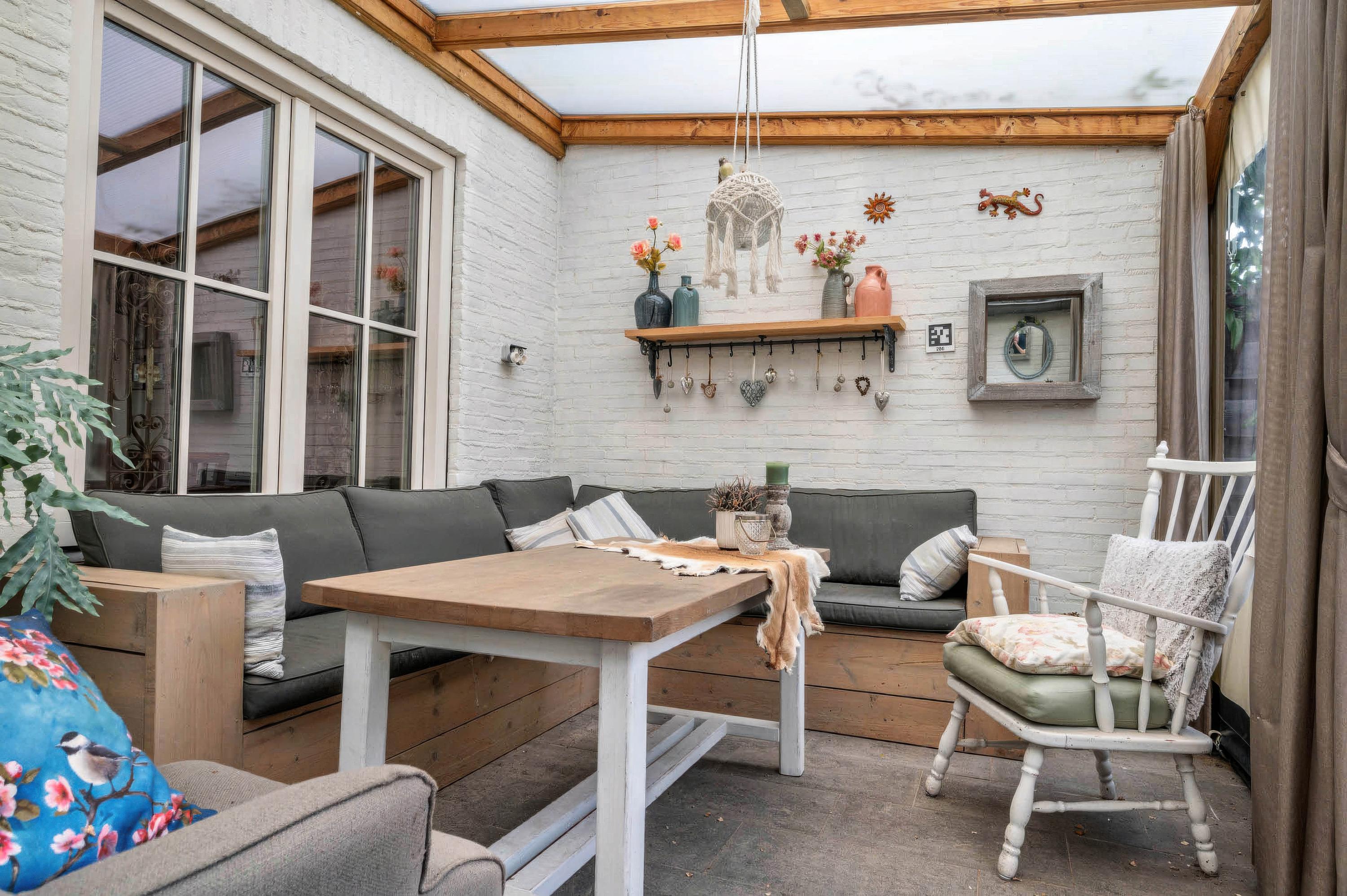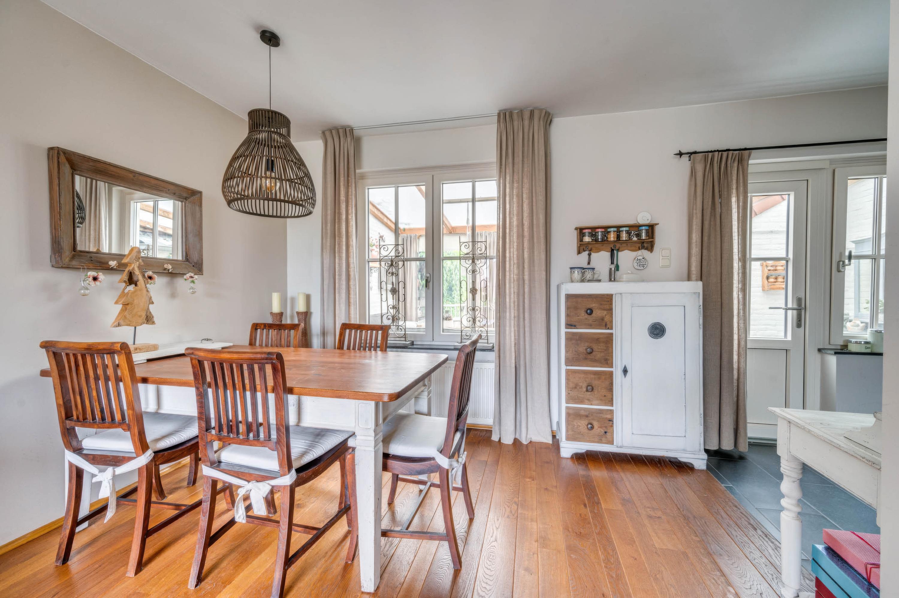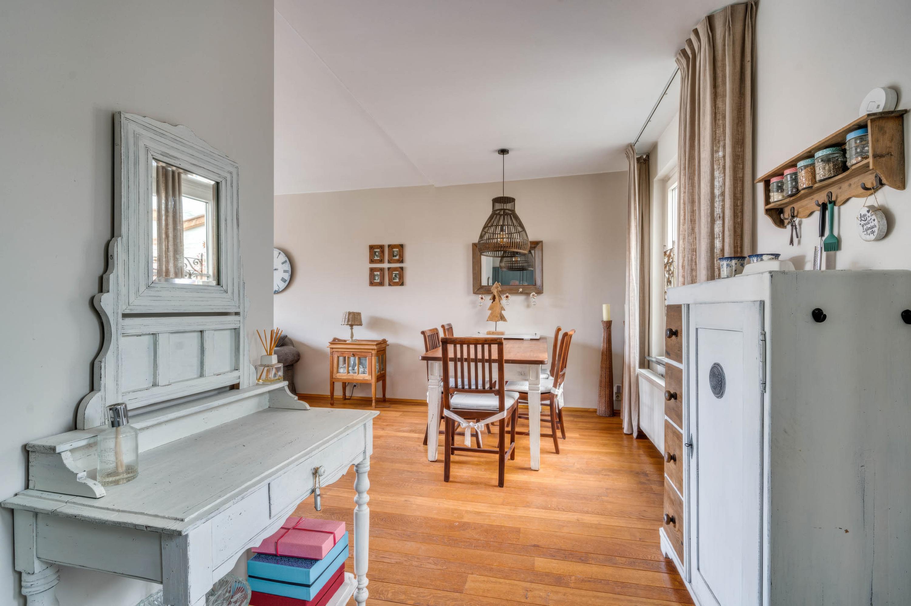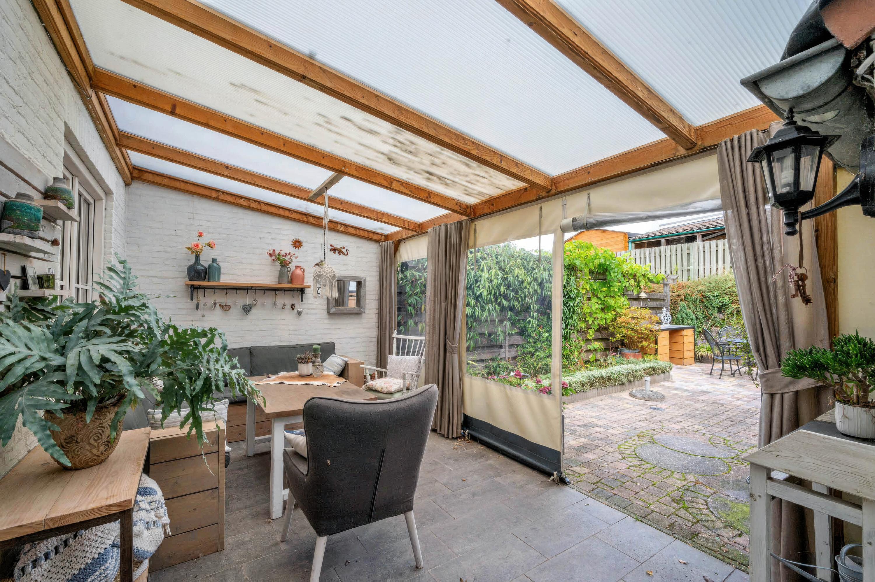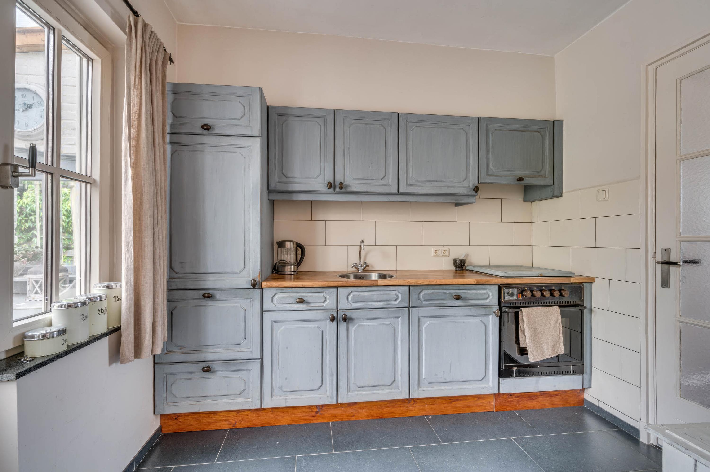 De deels betegelde toiletruimte is voorzien van een zwevend toilet en buitenraam. De keuken is voorzien van een tegelvloer en beschikt over elektrische kookplaat, oven, spoelbak, afzuigkap, koelkast en een loopdeur naar de tuin. De woonkamer is voorzien van een houten vloer en beschikt over een zit en eetgedeelte.