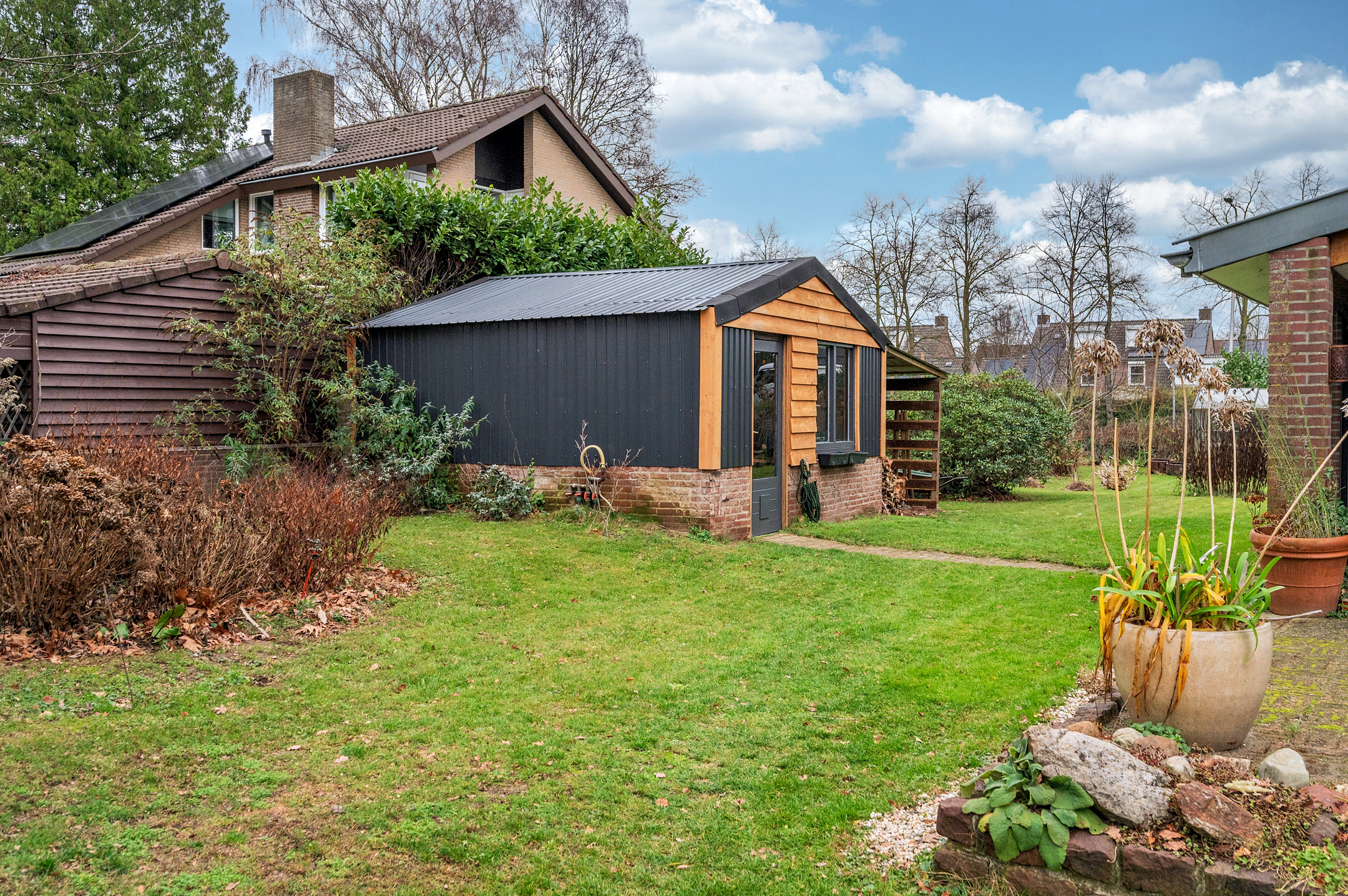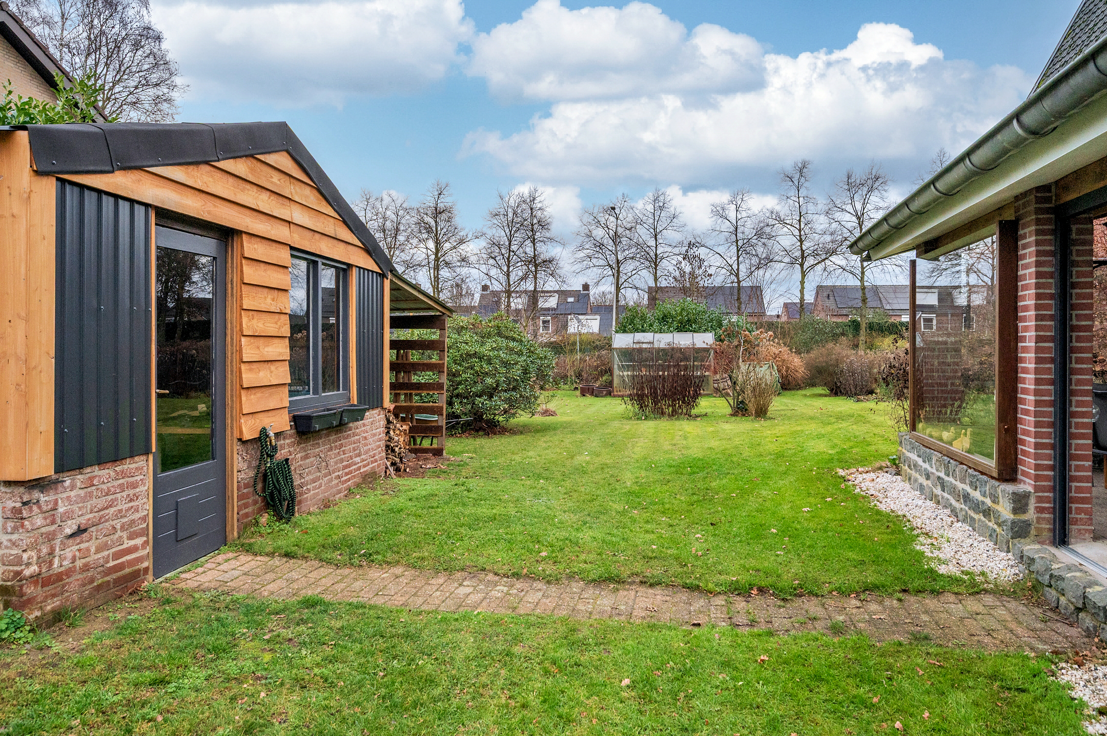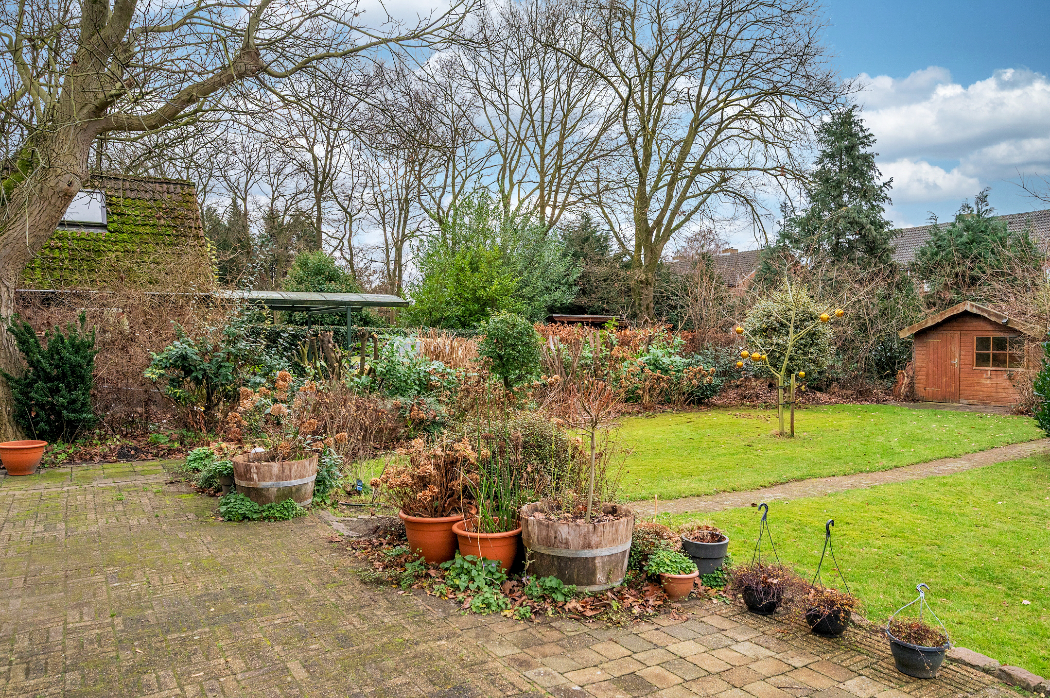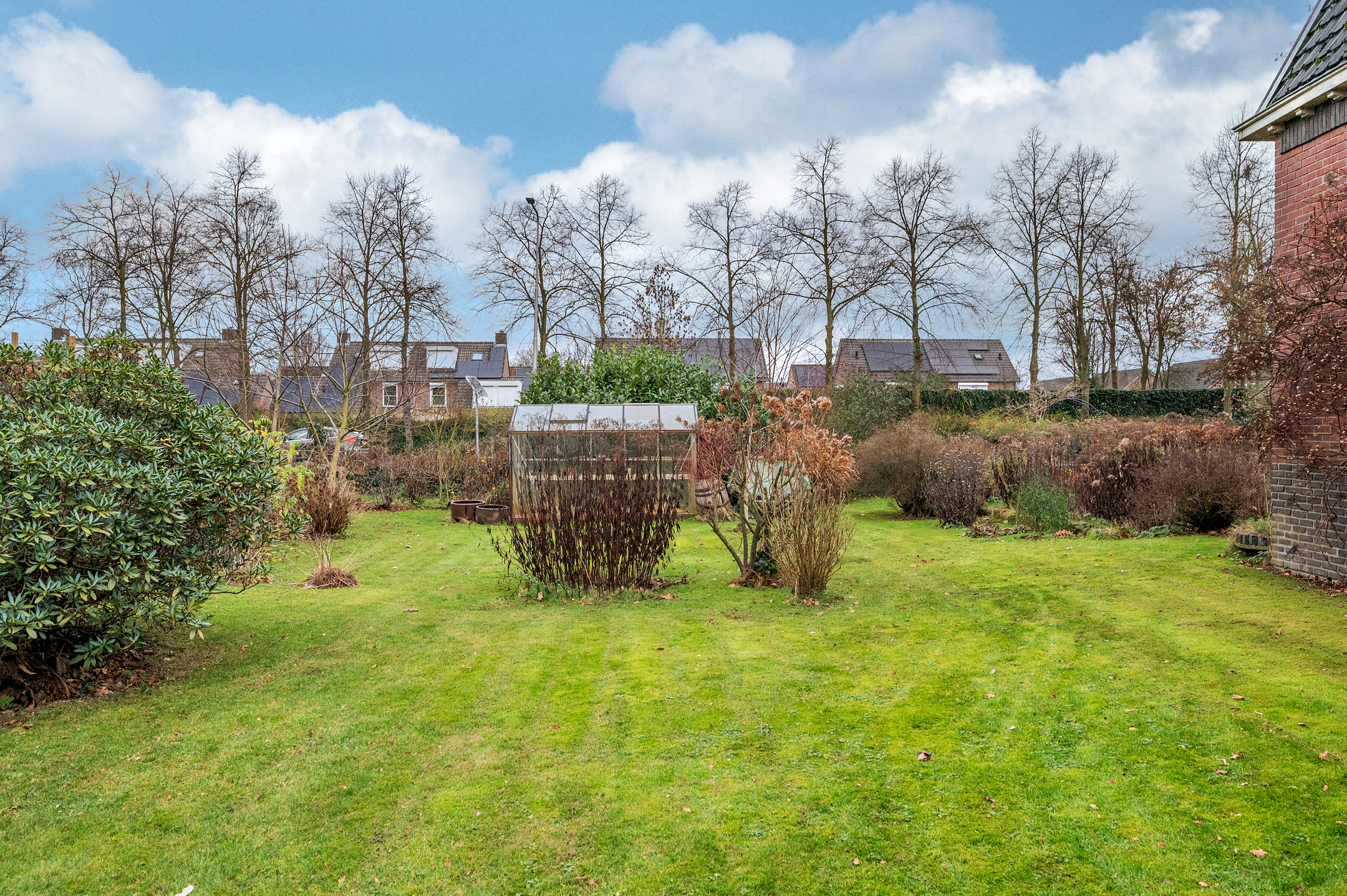 De woning is centraal op het perceel gelegen met aan de voorzijde een looppad van kiezel, borders met beplanting, gazon en een hobbykast van ca. 9m². Aan de achterzijde is een ruime overkapping geplaatst en is er een terras. Verder is er een betegeld looppad naar de carport en houten tuinhuis. De tuin biedt ontzettend veel mogelijkheden.
