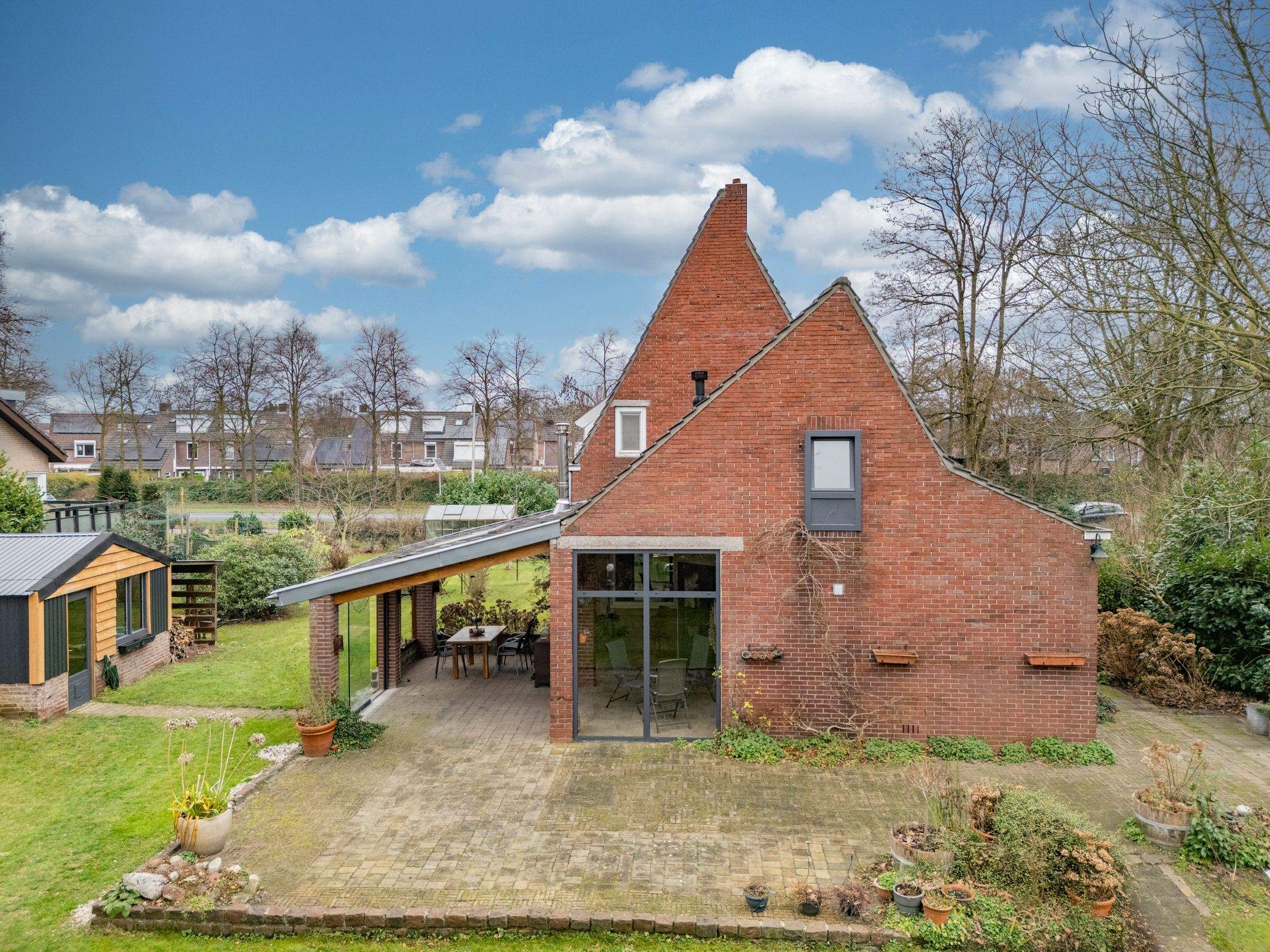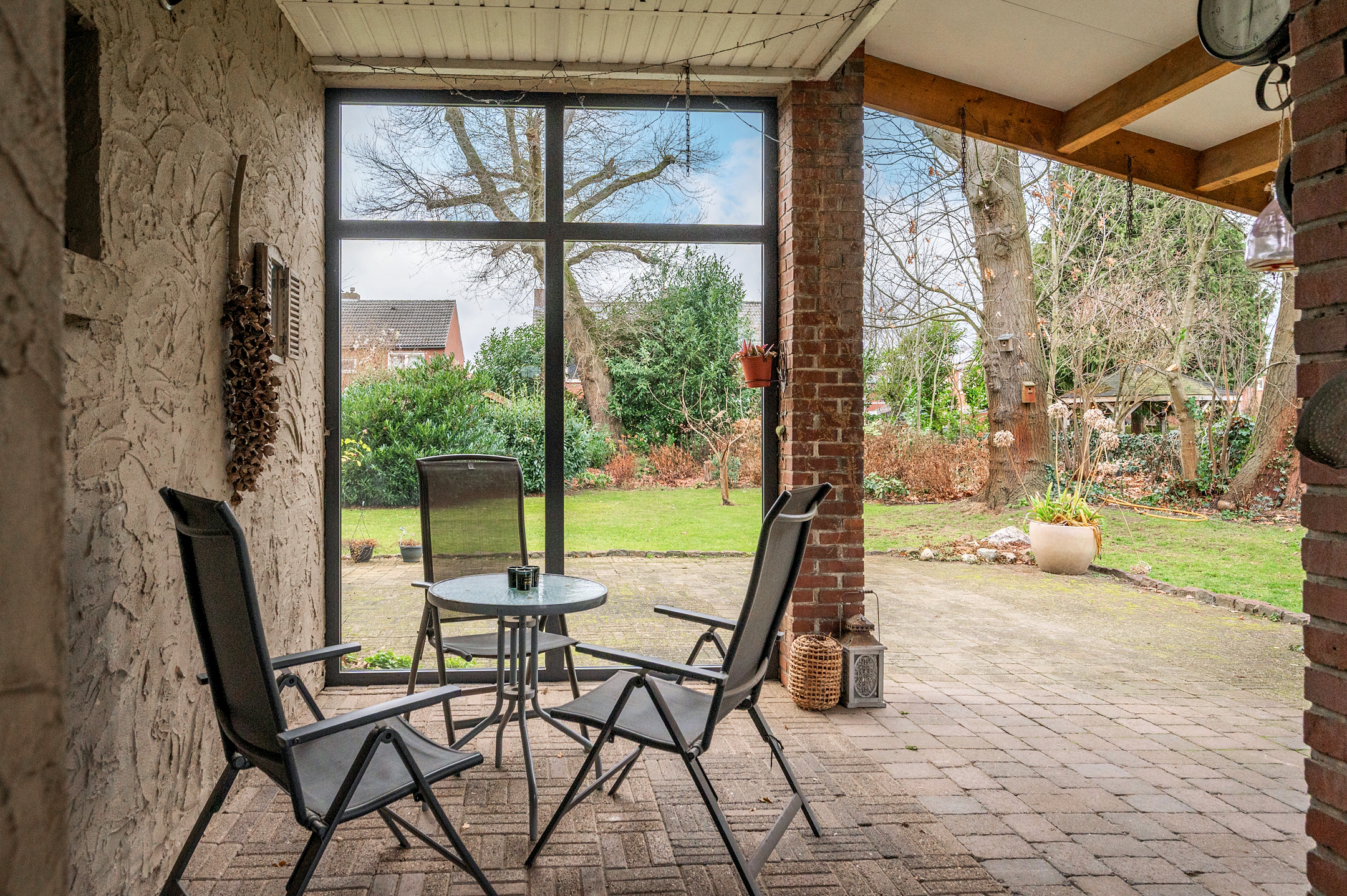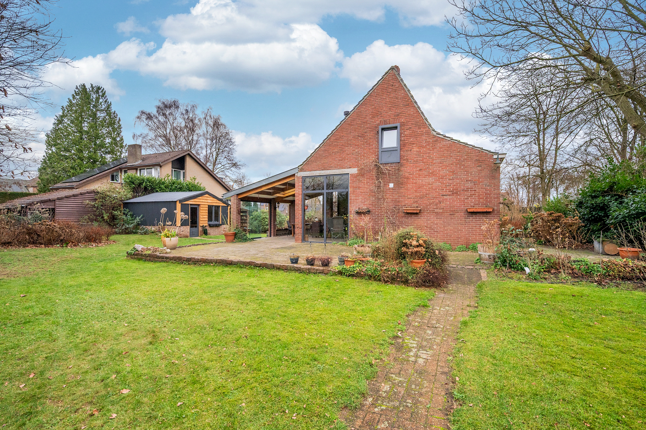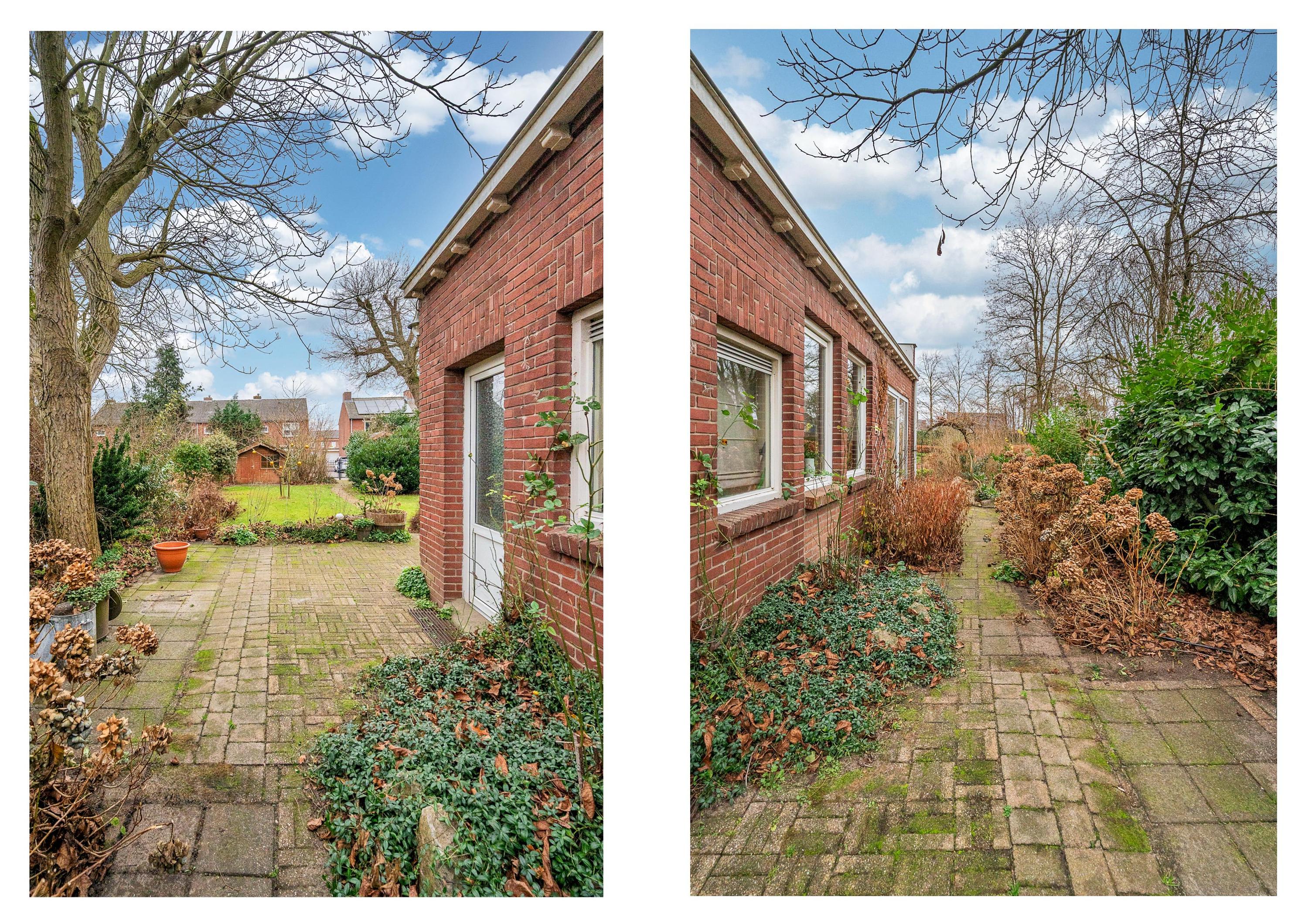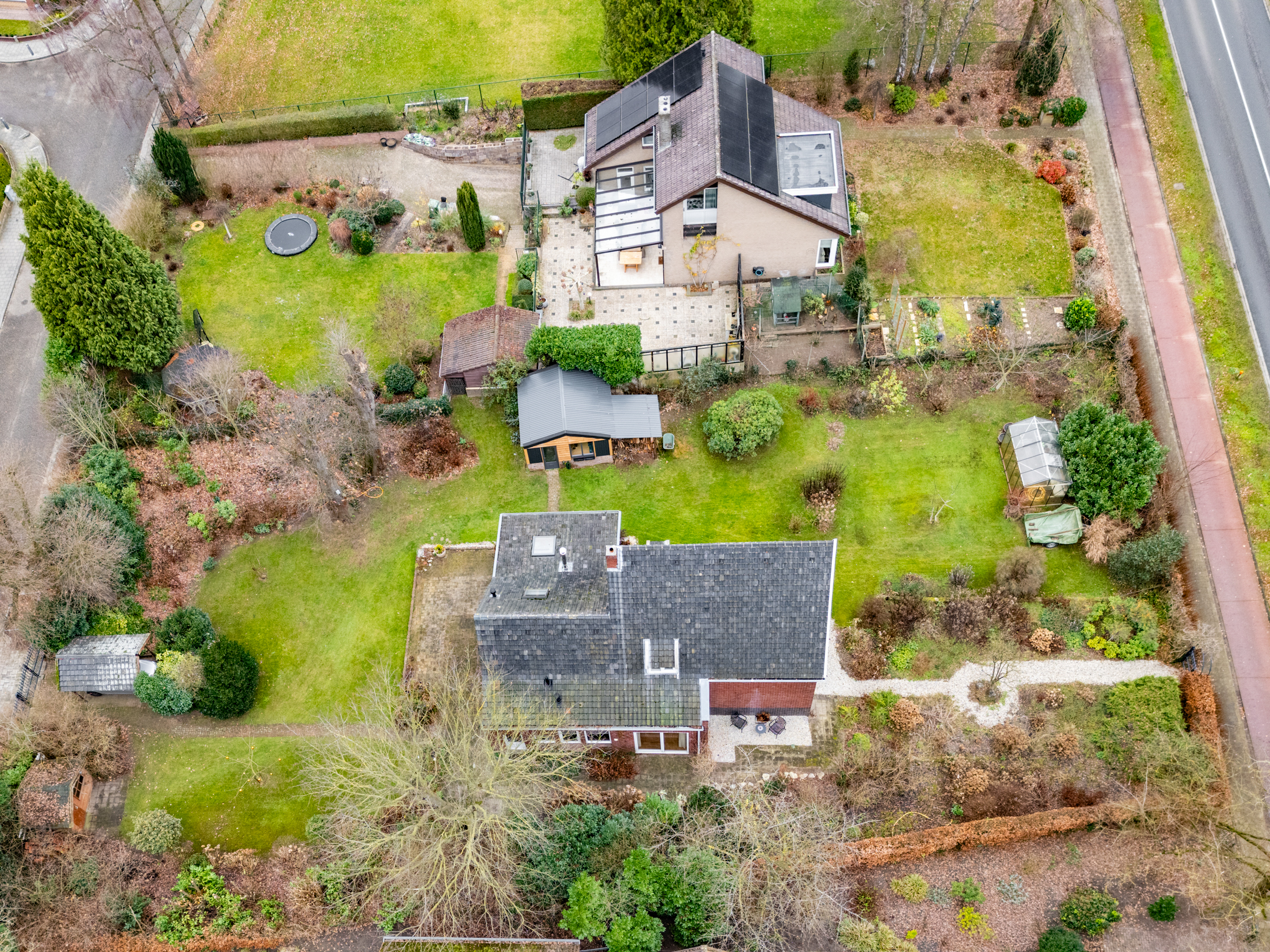 De woning is centraal op het perceel gelegen met aan de voorzijde een looppad van kiezel, borders met beplanting, gazon en een hobbykast van ca. 9m². Aan de achterzijde is een ruime overkapping geplaatst en is er een terras. Verder is er een betegeld looppad naar de carport en houten tuinhuis. De tuin biedt ontzettend veel mogelijkheden.