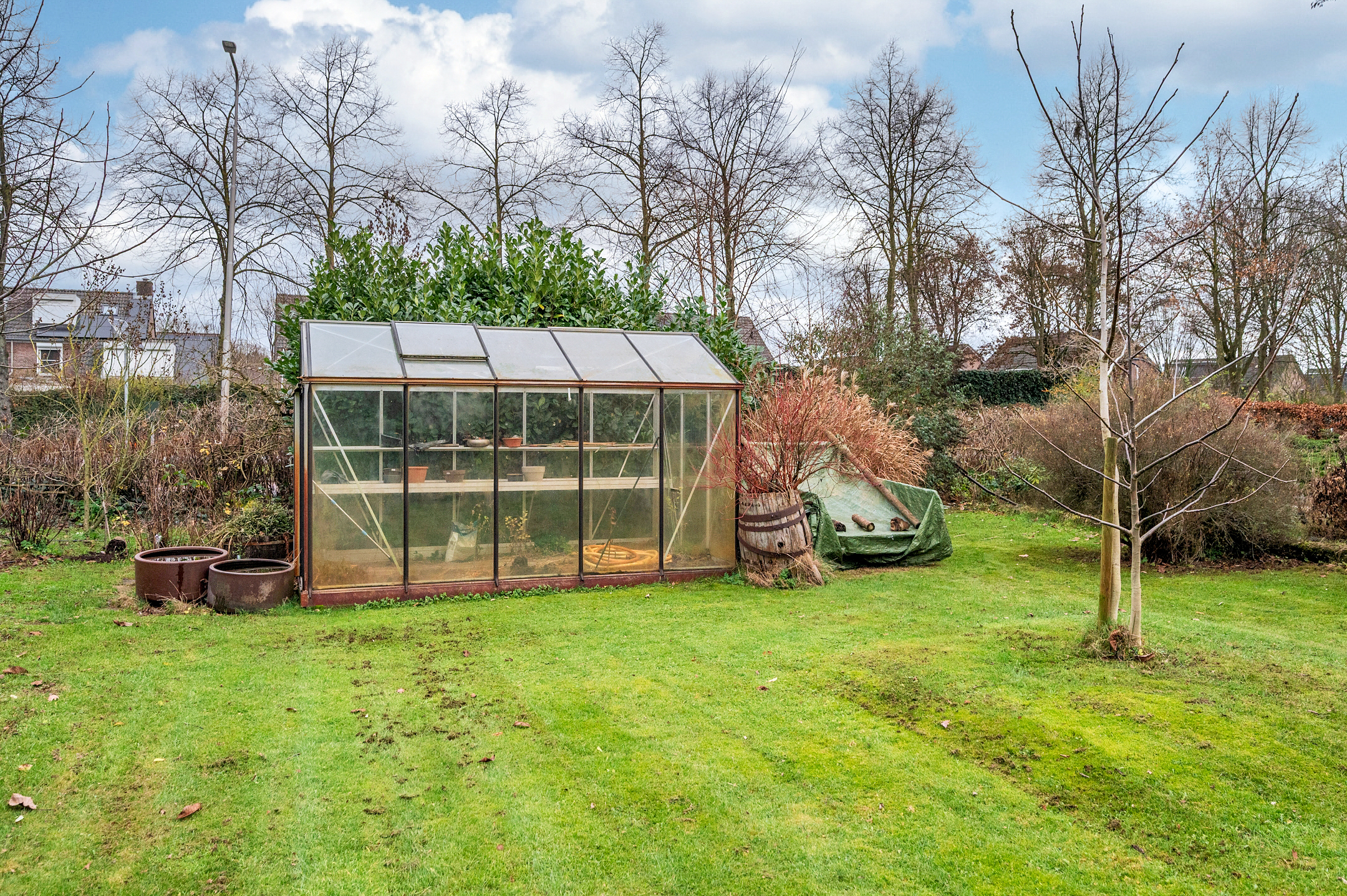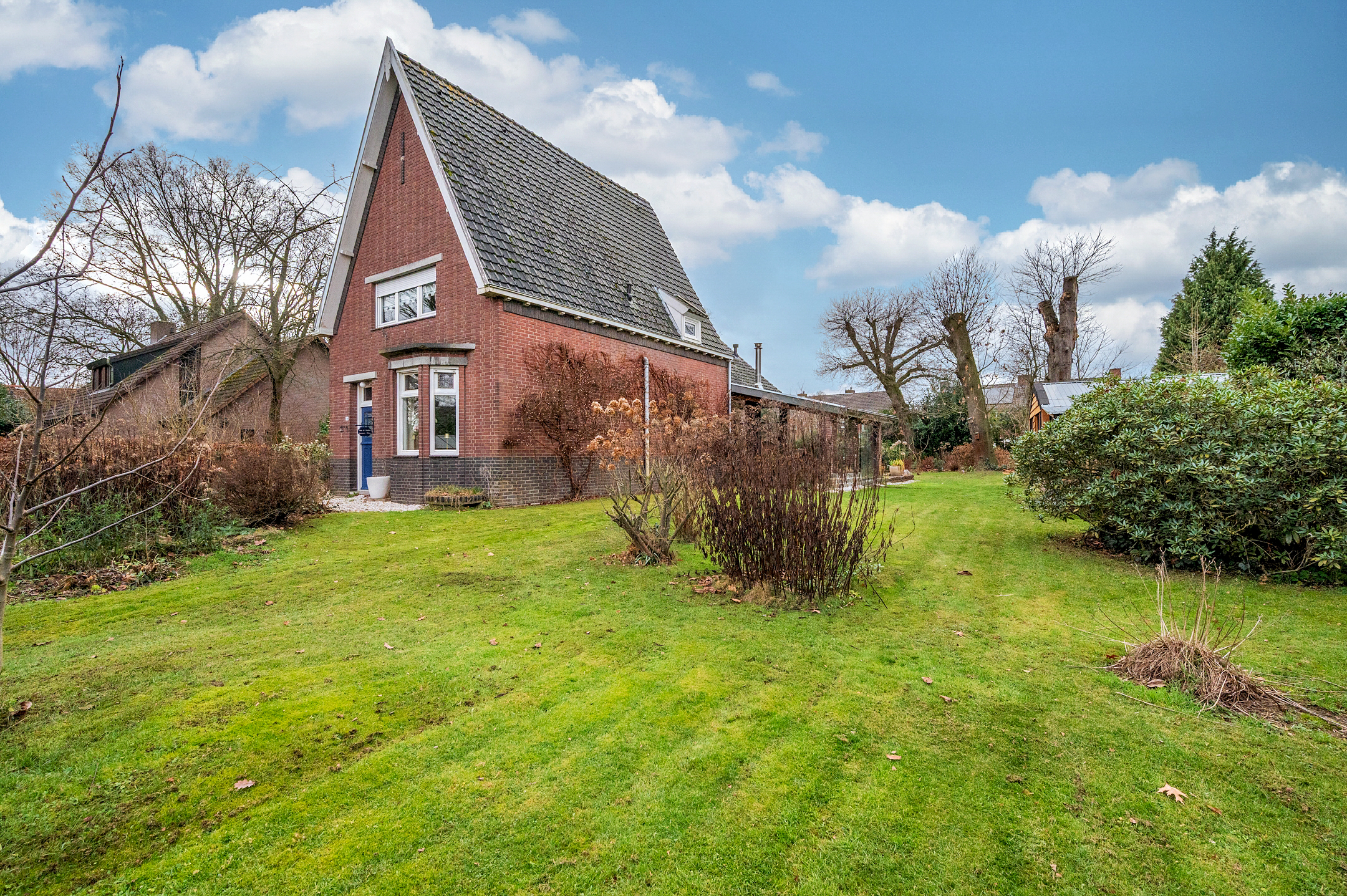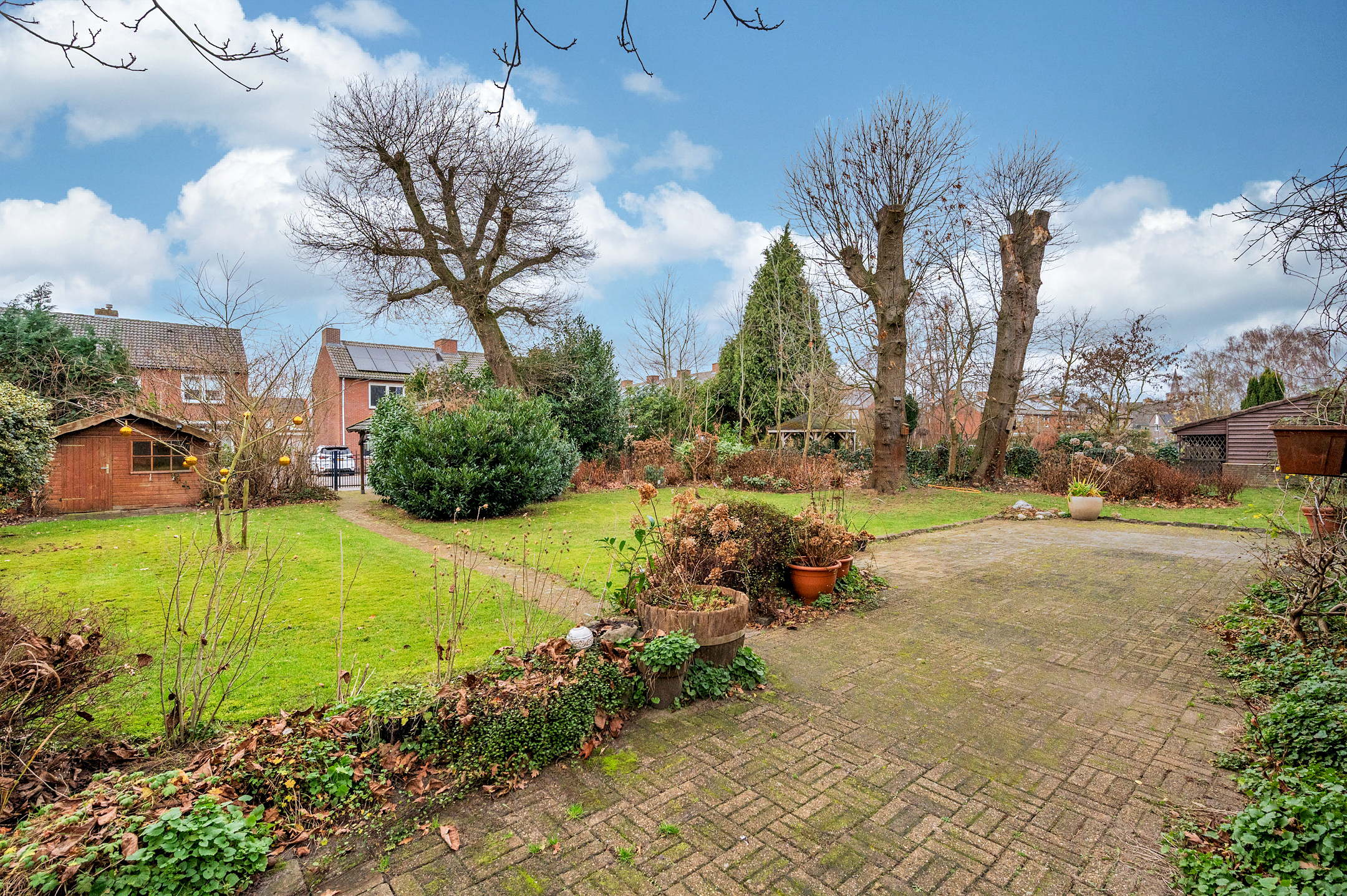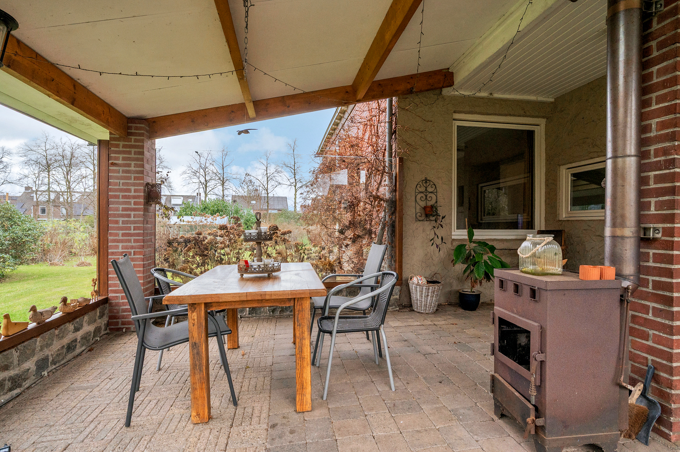 De woning is centraal op het perceel gelegen met aan de voorzijde een looppad van kiezel, borders met beplanting, gazon en een hobbykast van ca. 9m². Aan de achterzijde is een ruime overkapping geplaatst en is er een terras. Verder is er een betegeld looppad naar de carport en houten tuinhuis. De tuin biedt ontzettend veel mogelijkheden.