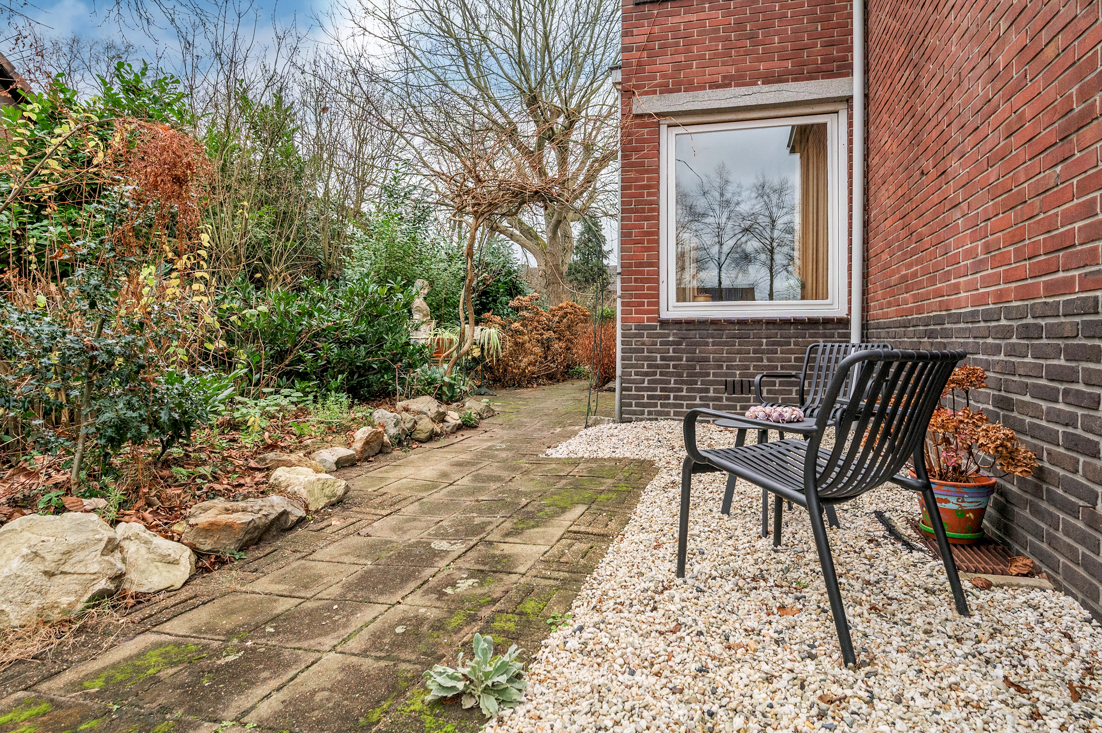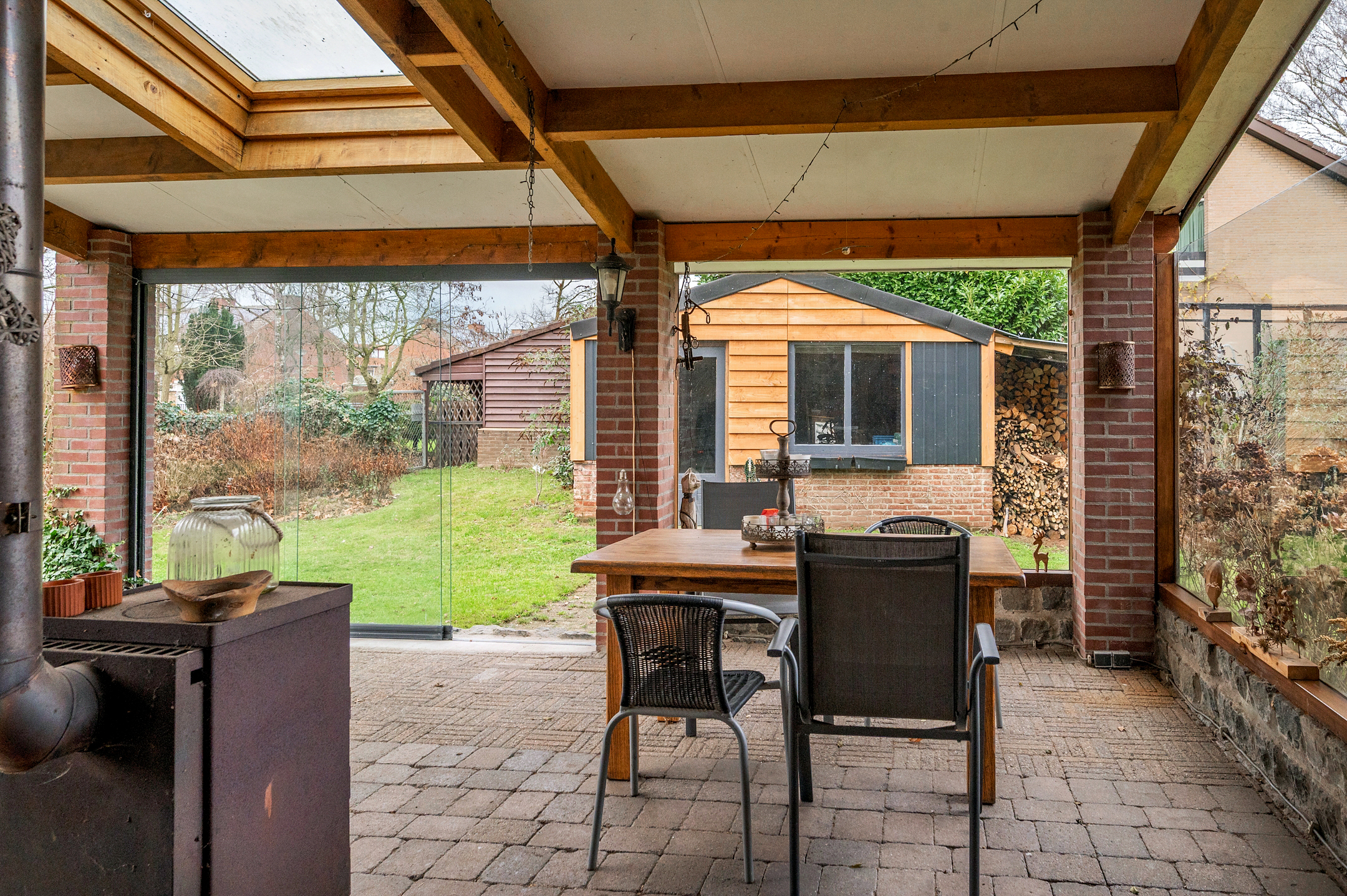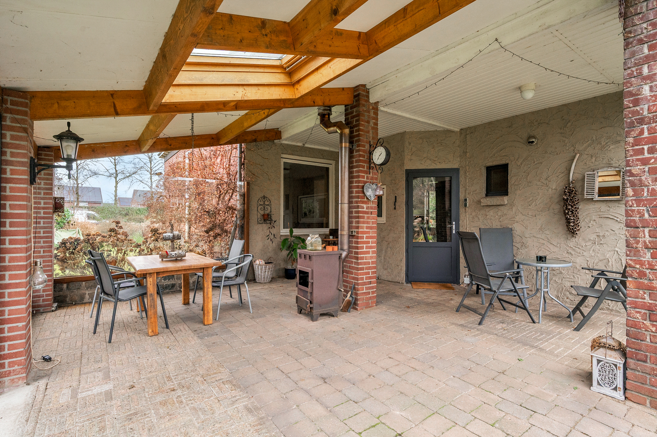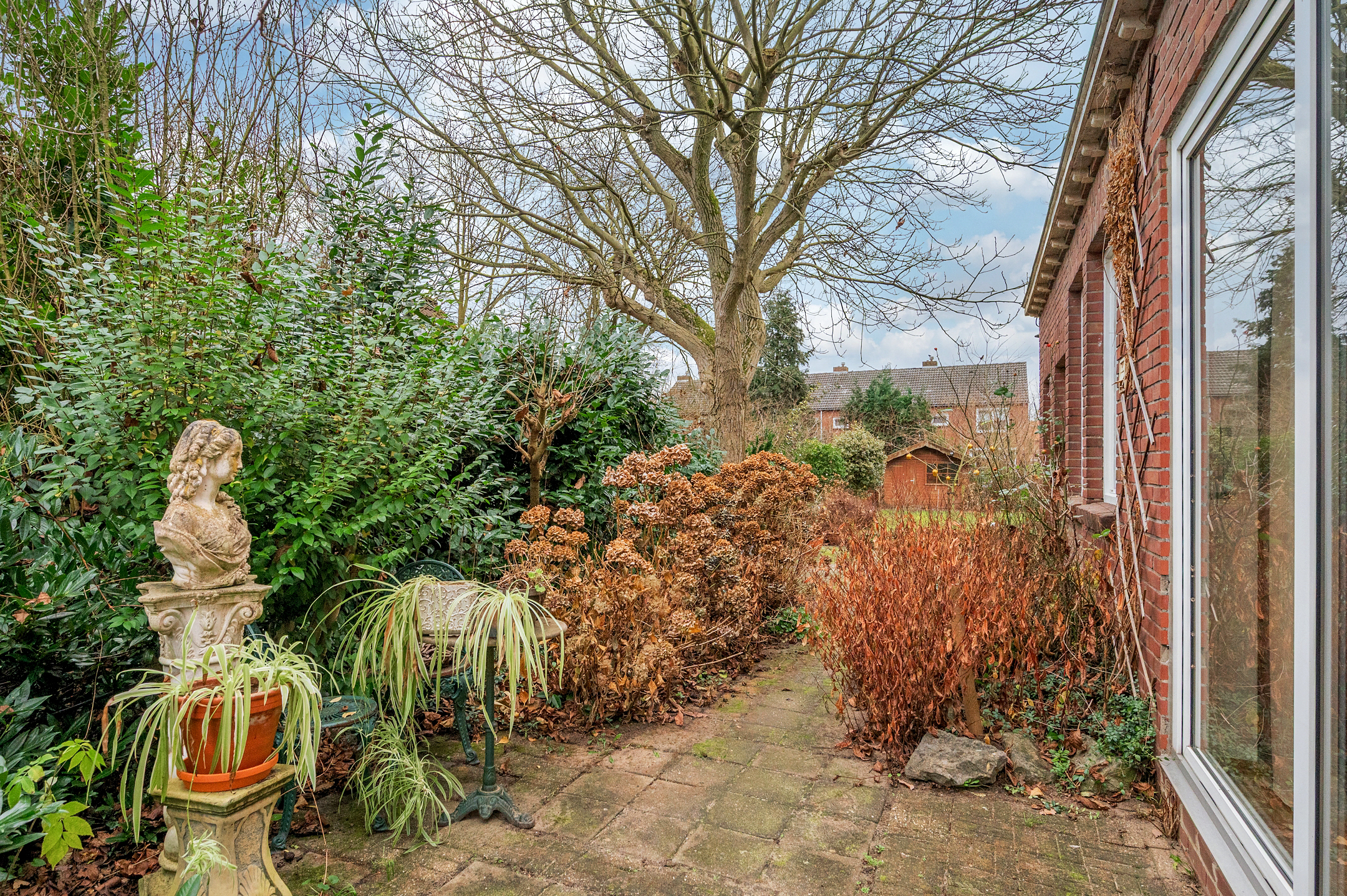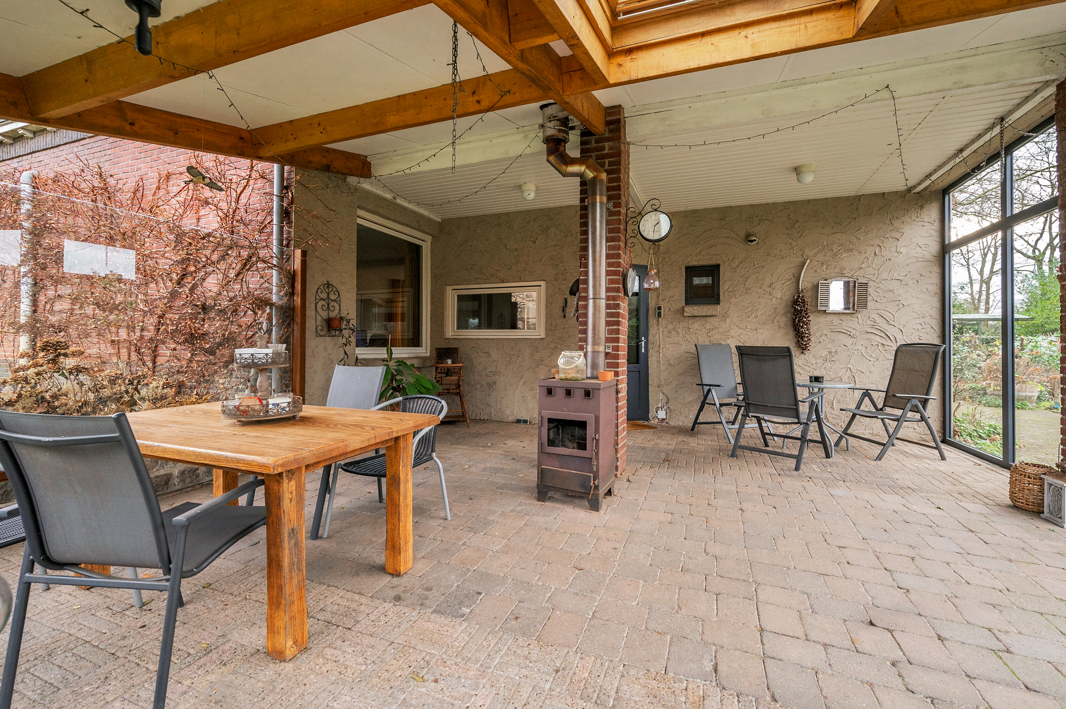 De woning is centraal op het perceel gelegen met aan de voorzijde een looppad van kiezel, borders met beplanting, gazon en een hobbykast van ca. 9m². Aan de achterzijde is een ruime overkapping geplaatst en is er een terras. Verder is er een betegeld looppad naar de carport en houten tuinhuis. De tuin biedt ontzettend veel mogelijkheden.