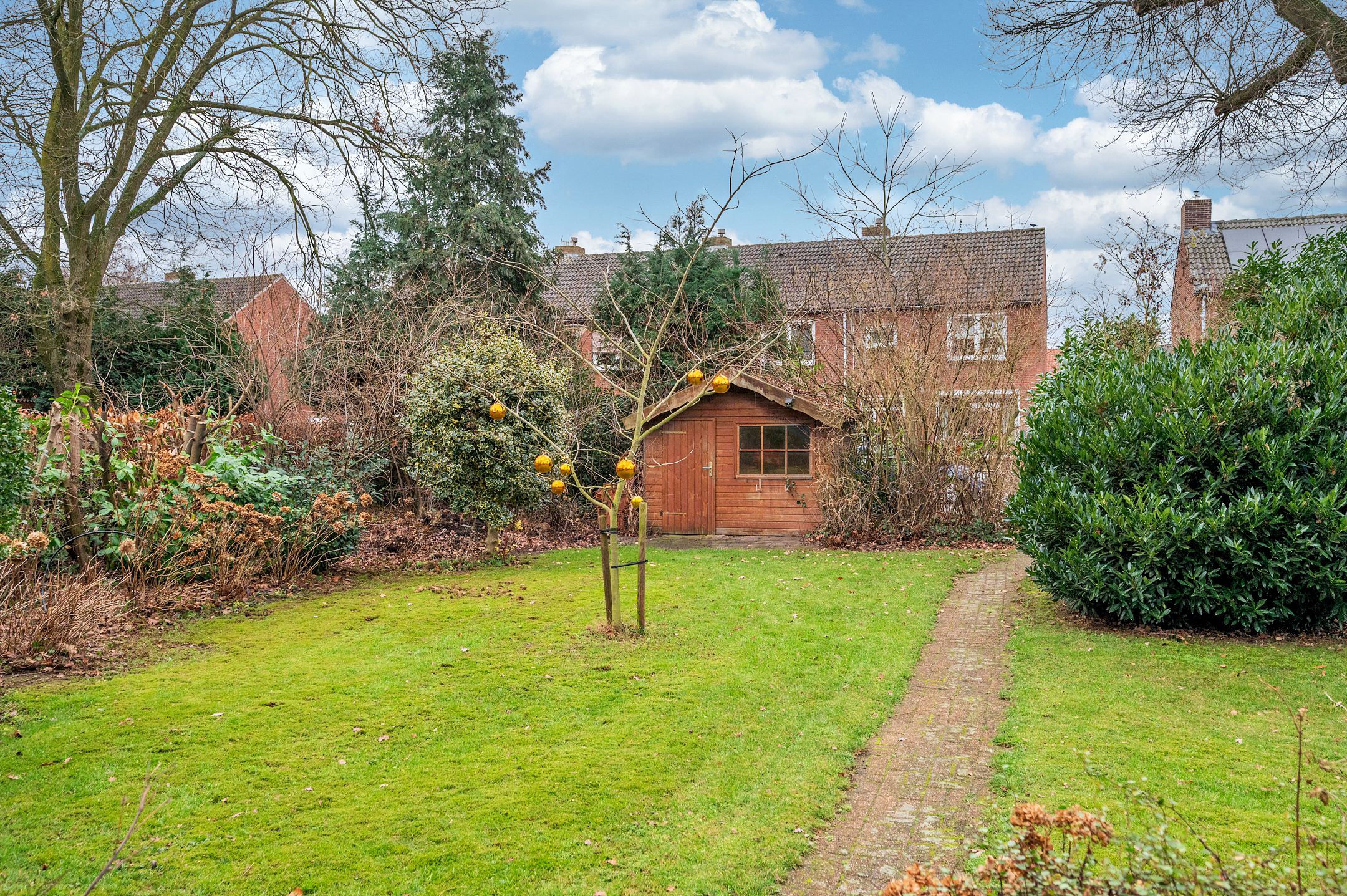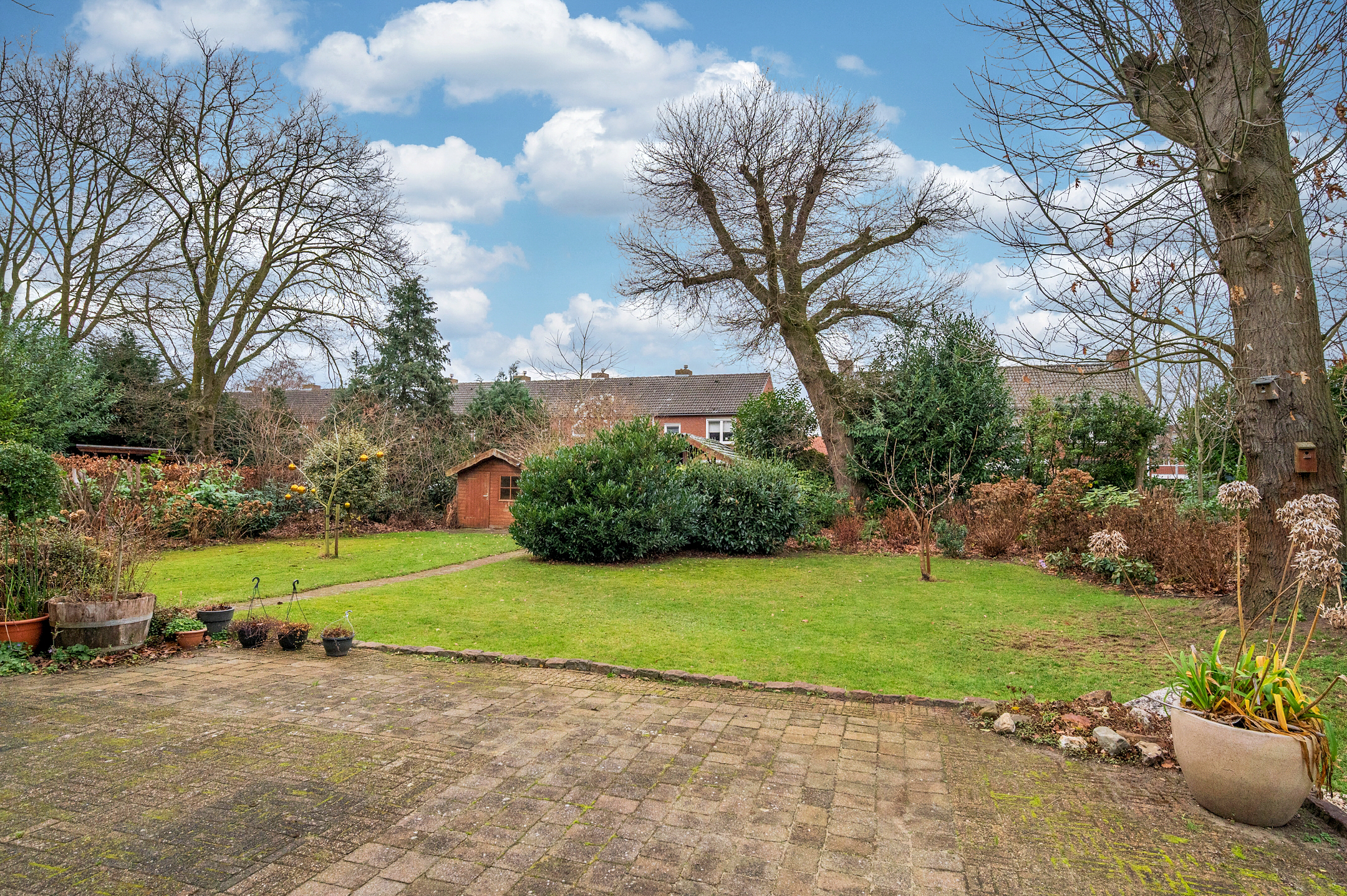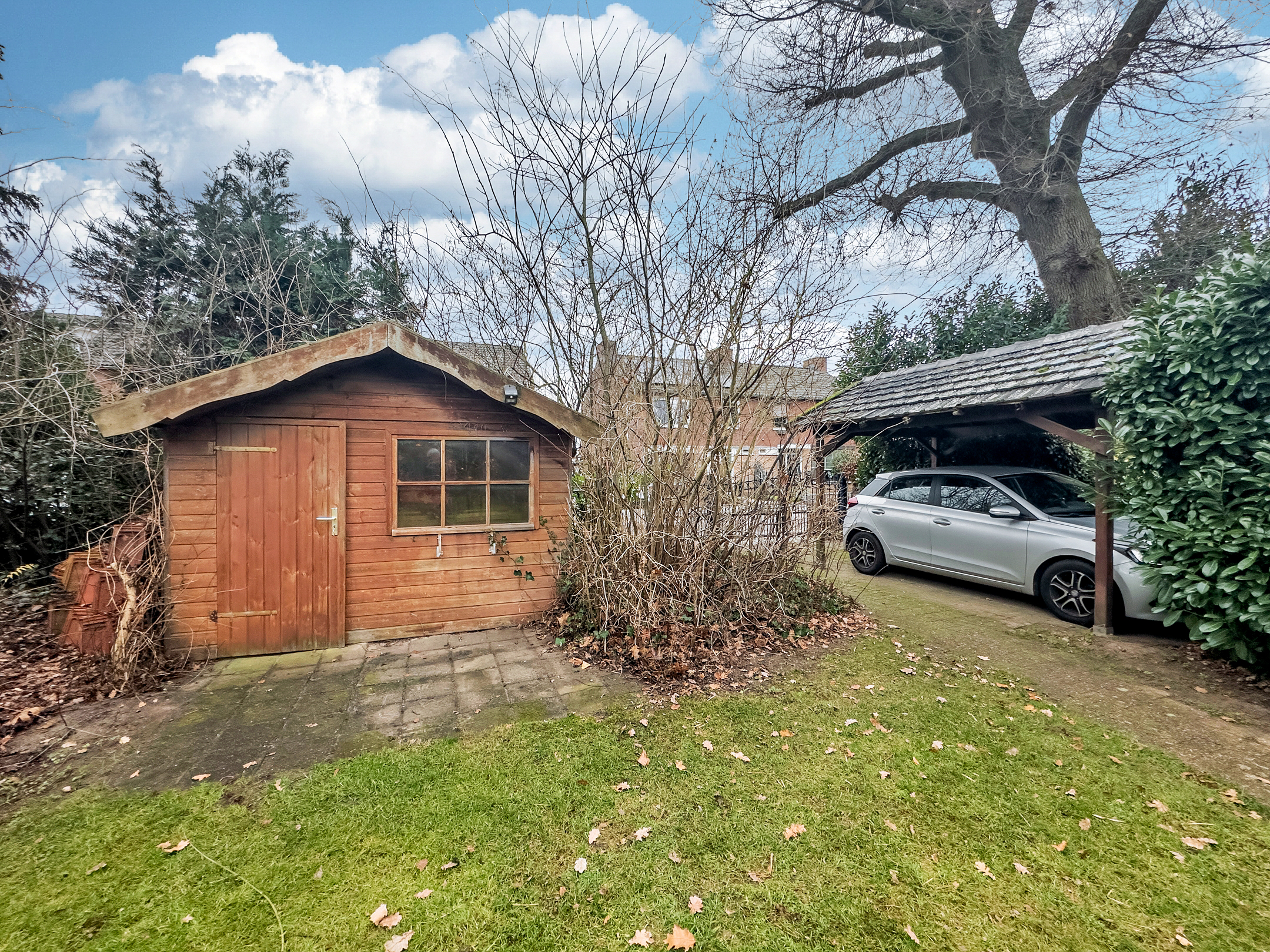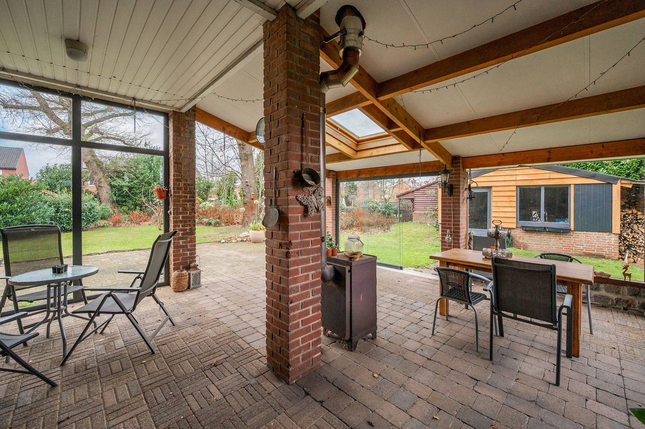 De woning is centraal op het perceel gelegen met aan de voorzijde een looppad van kiezel, borders met beplanting, gazon en een hobbykast van ca. 9m². Aan de achterzijde is een ruime overkapping geplaatst en is er een terras. Verder is er een betegeld looppad naar de carport en houten tuinhuis. De tuin biedt ontzettend veel mogelijkheden.