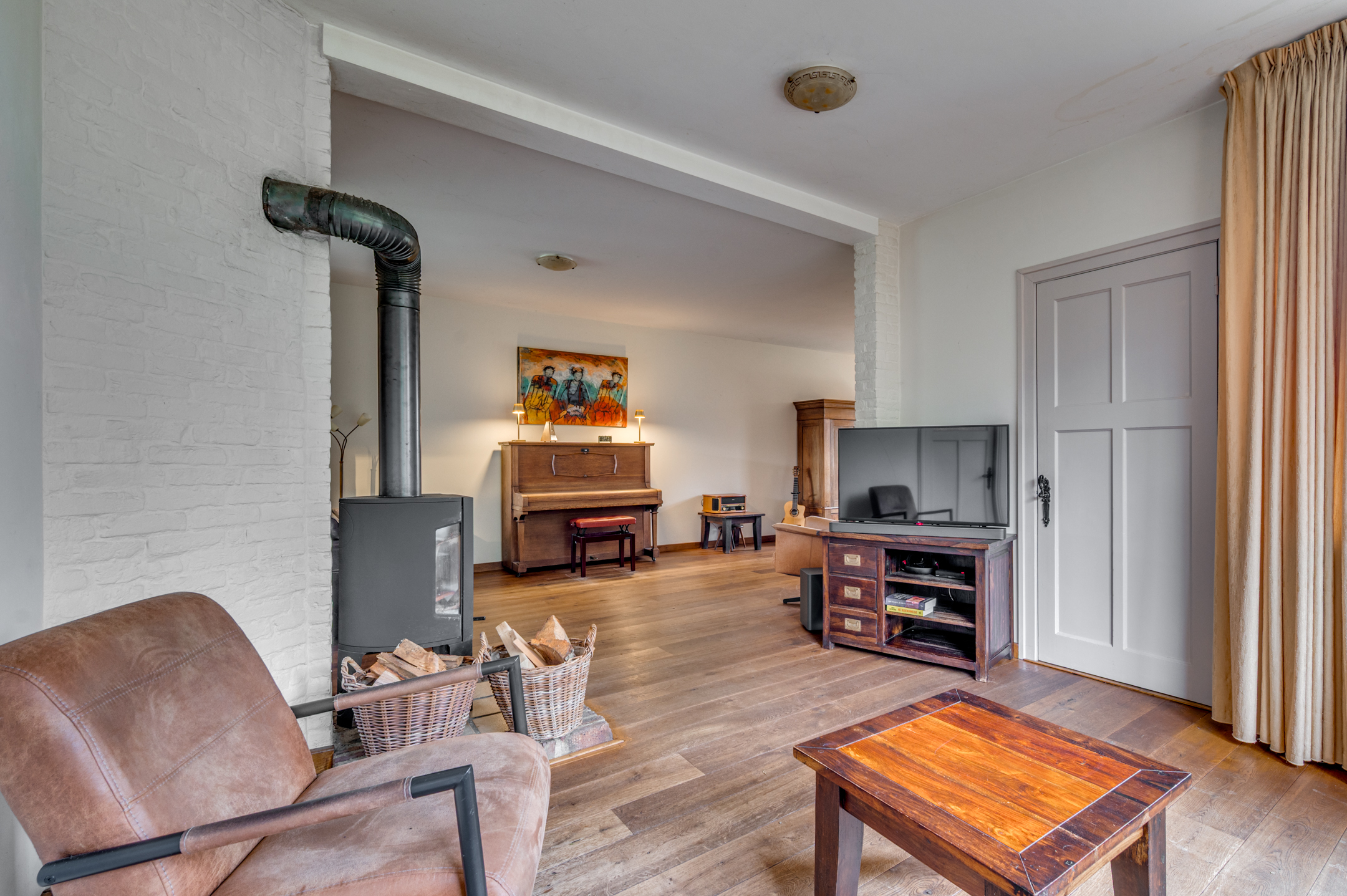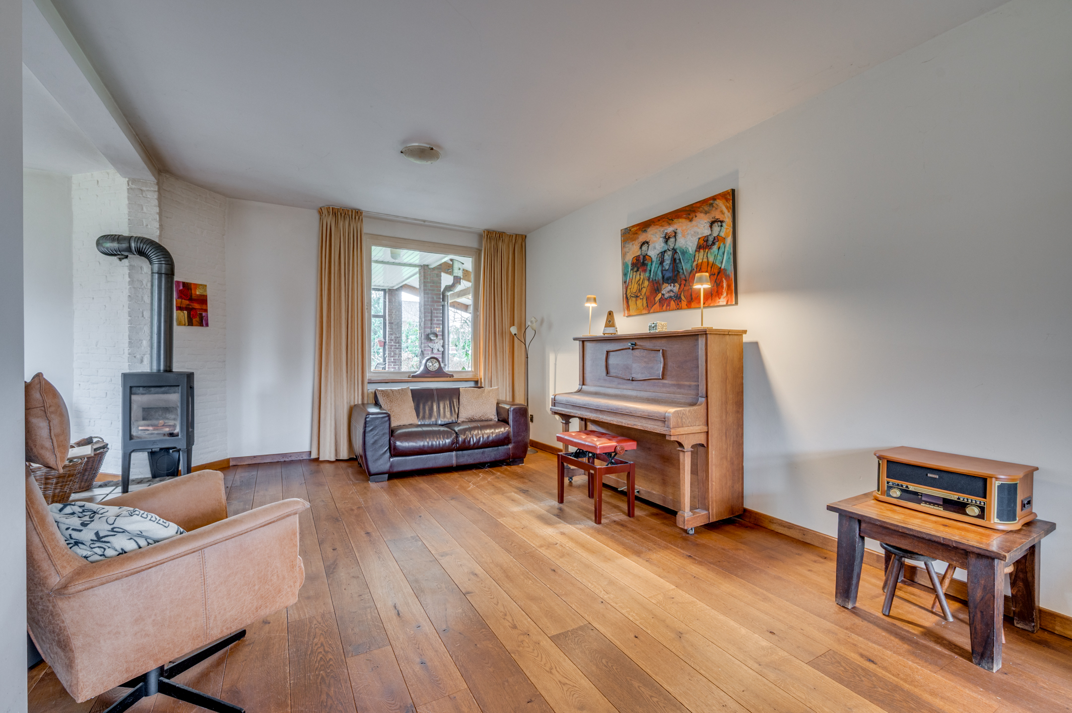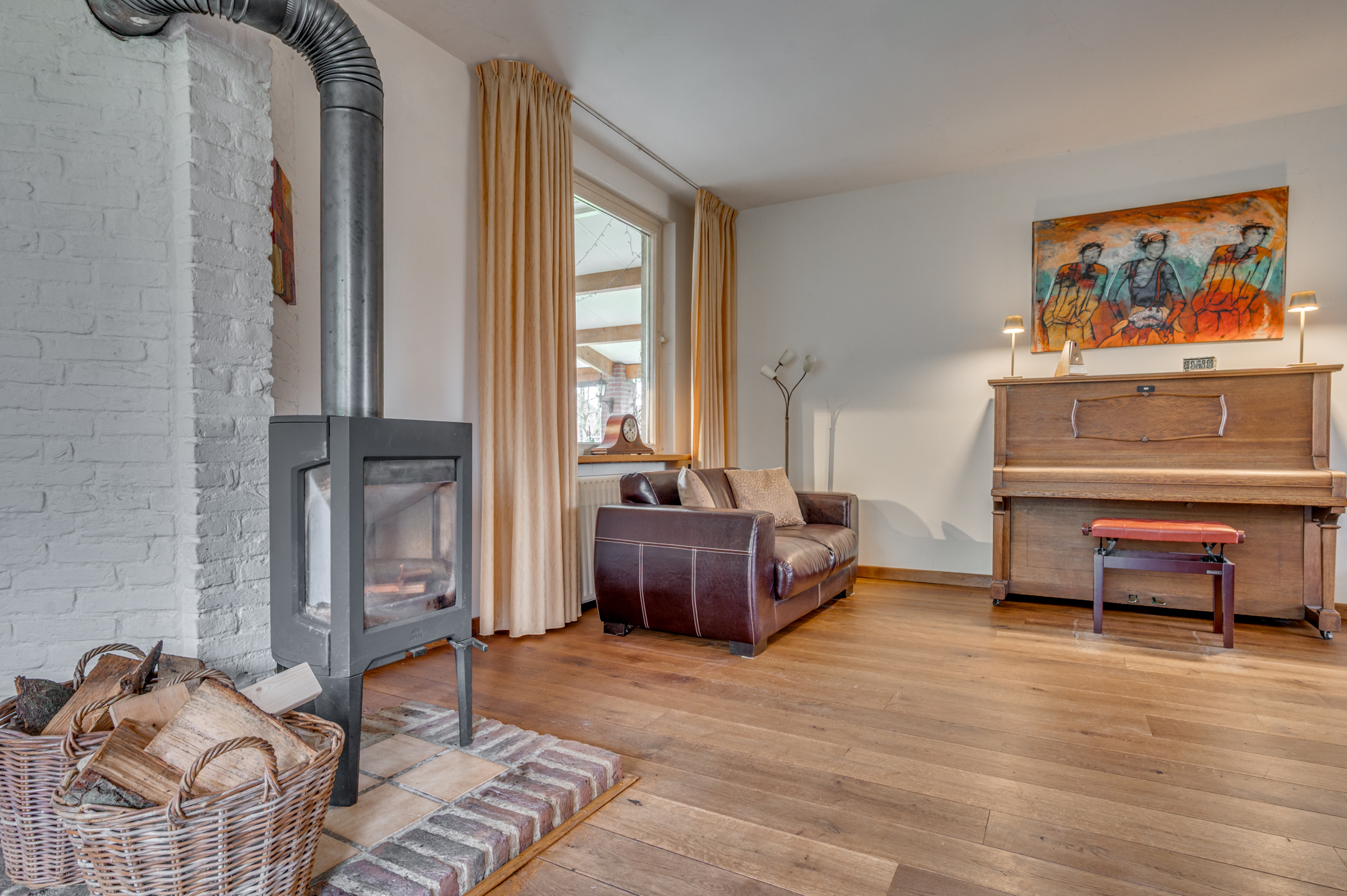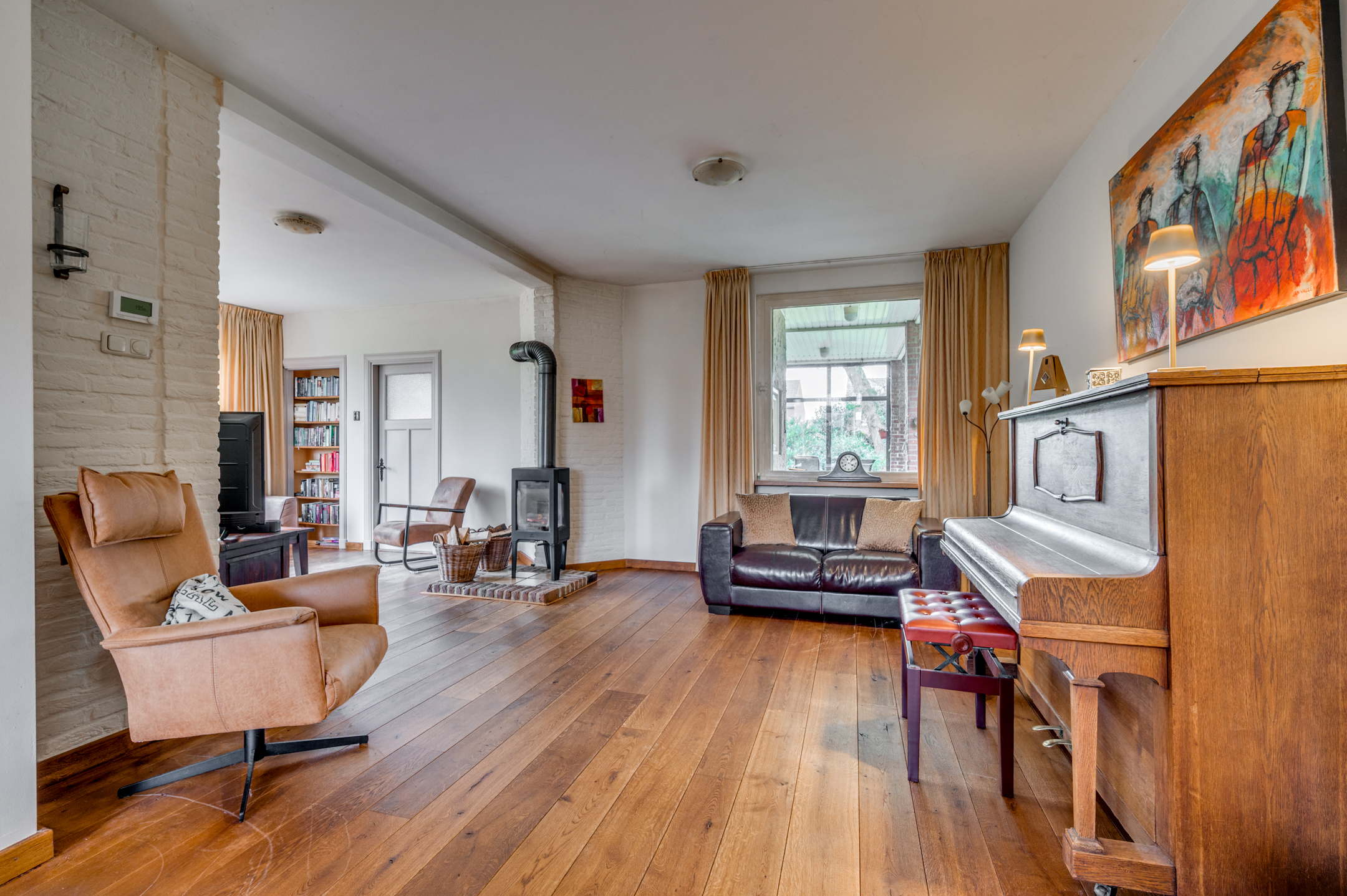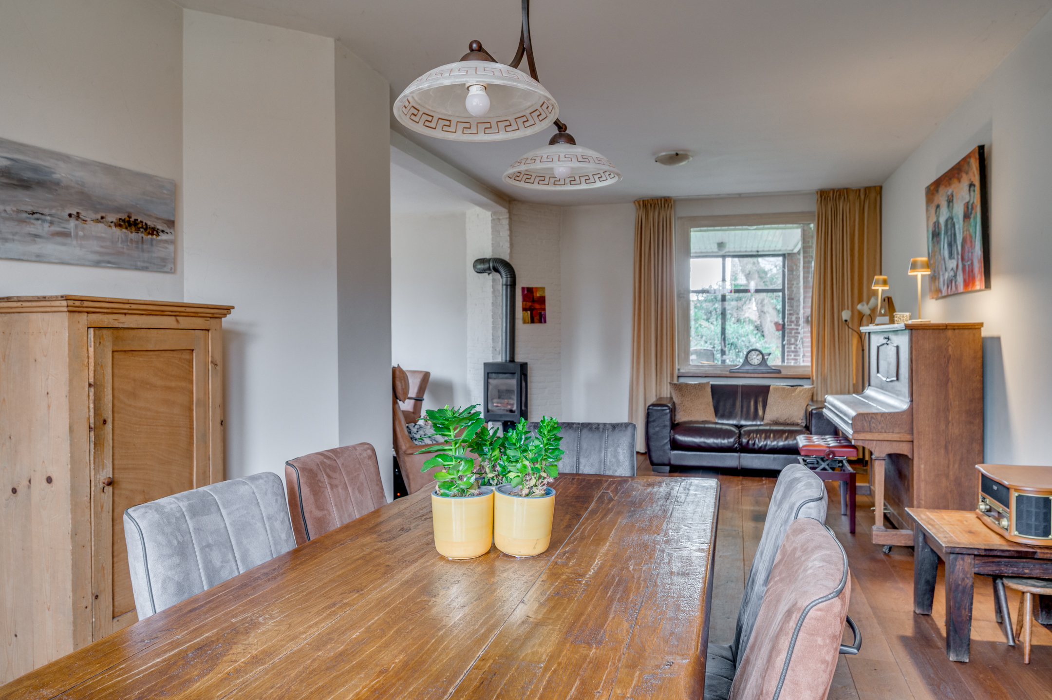 Een looppad van kiezel geeft toegang tot de entree van de woning. De ruime ontvangsthal geeft toegang tot de meterkast, woonkamer en trapopgang naar de verdieping. De woon/ eetkamer is ruim van opzet en voorzien van een eikenhouten plankenvloer. Aan de achterzijde is een houtkachel aanwezig, Middels een loopdeur in de woonkamer is er toegang tot de kelder en woonkeuken. De keuken is ruim van opzet en voorzien van een 5-pits gasfornuis, afzuigkap, spoelbak, vaatwasmachine, koelkast en diepvries. Vanuit de keuken is er toegang tot de overkapping en een loopdeur naar de 2e hal welke aan de achterzijde van de woning is gelegen. De hal geeft toegang tot de separate toiletruimte, badkamer, trapopgang en kastruimte waar de witgoedaansluitingen zijn geplaatst. De toiletruimte is deels betegeld en voorzien van een zwevend toilet met fonteintje. De badkamer is voorzien van een inloopdouche, wastafel met meubel, designradiator en mechanische ventilatie.