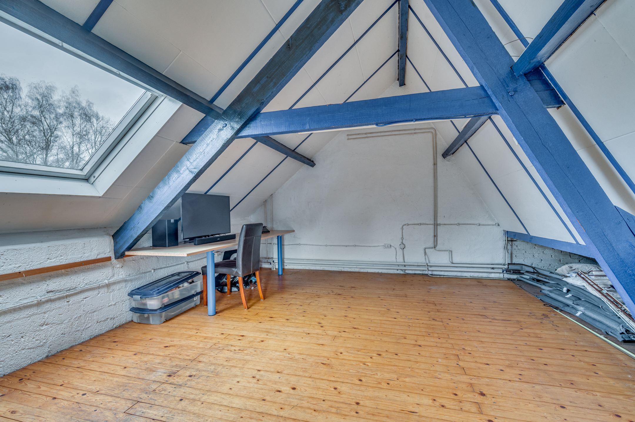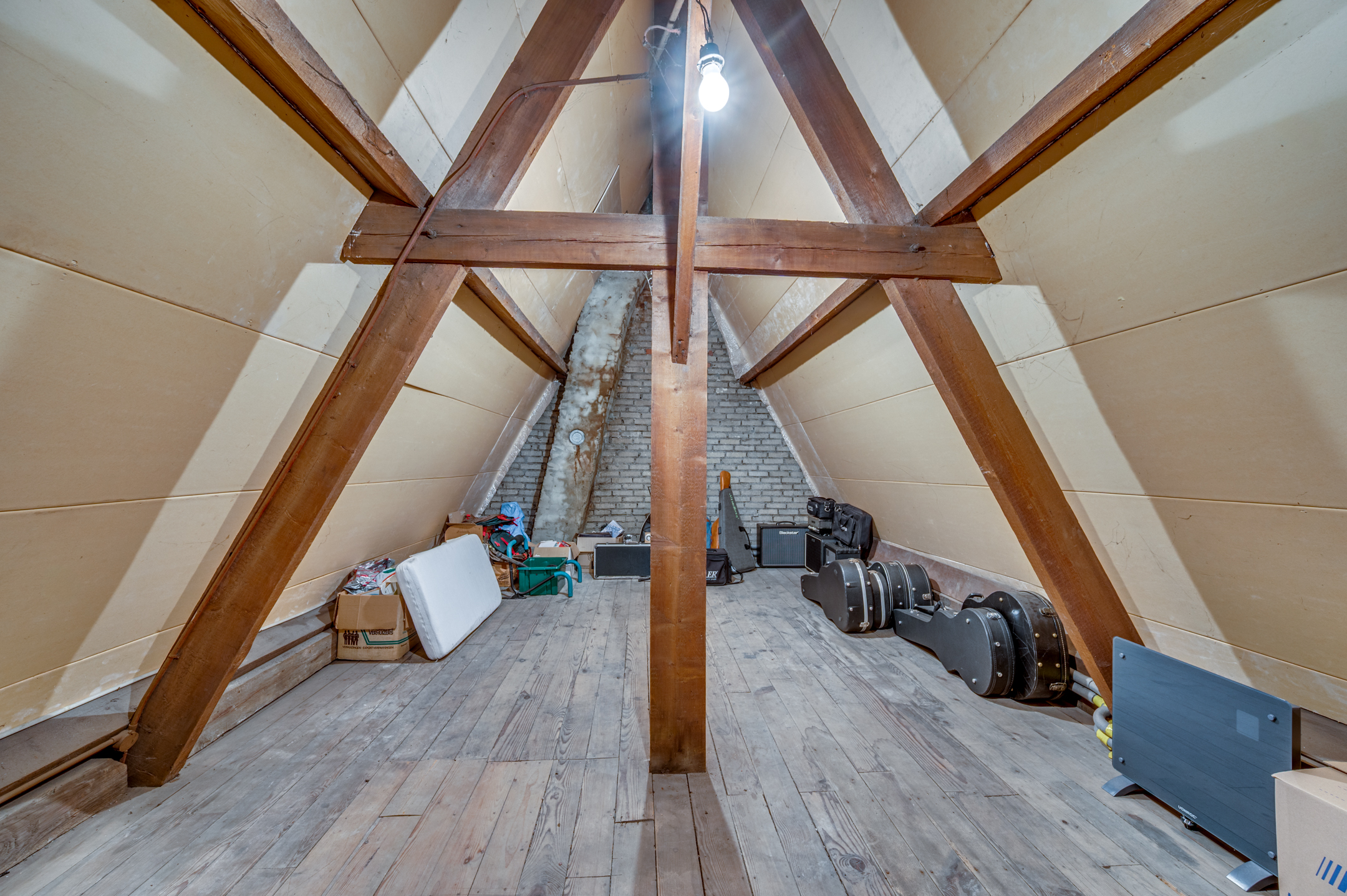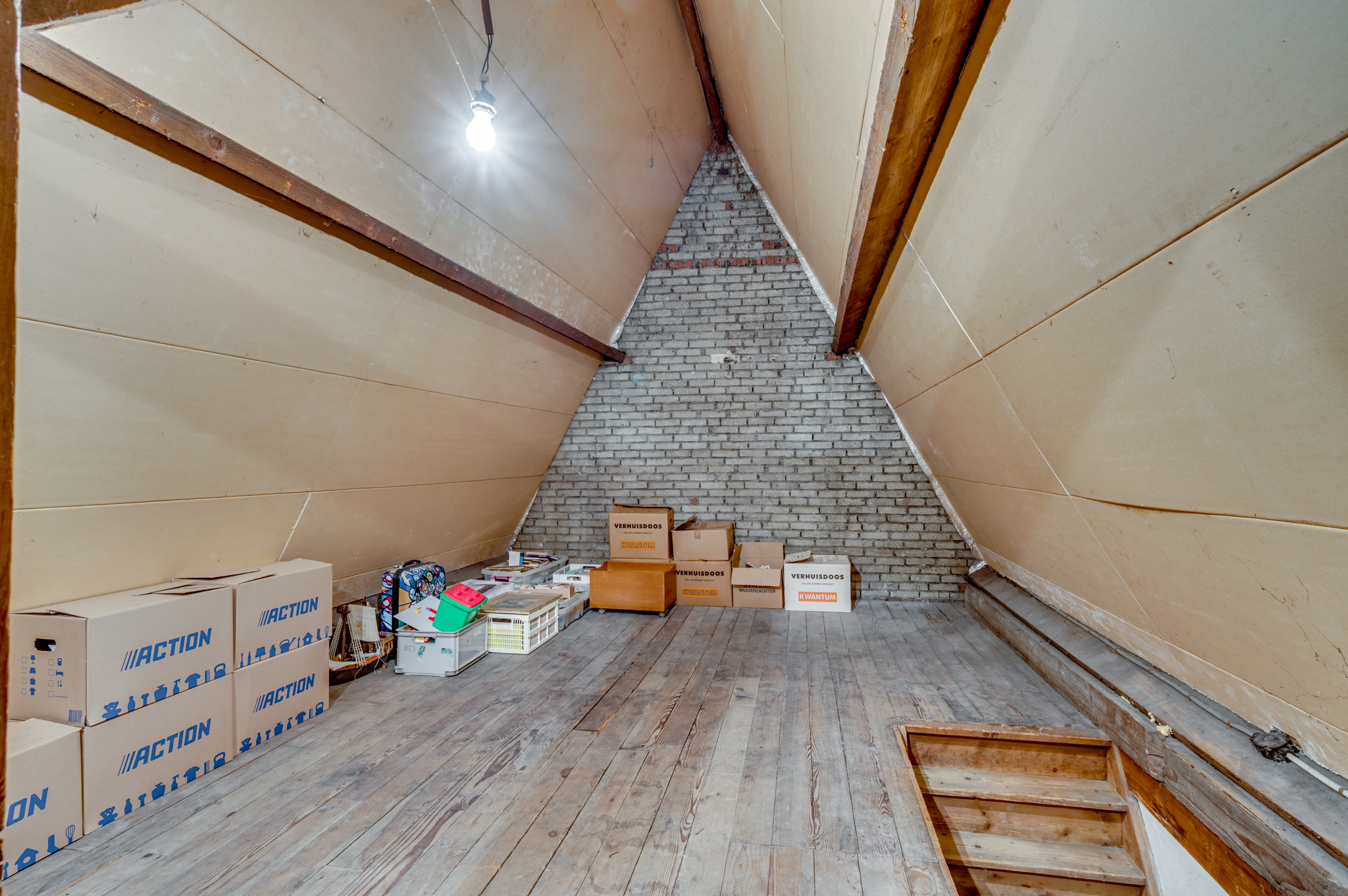 De verdieping is ca. 23m² groot en dient momenteel als opslagruimte/zolder.