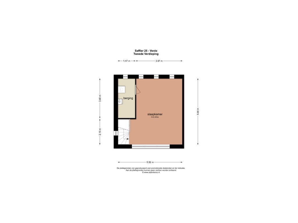 Middels de vaste trap is de 2e verdieping te bereiken. Hier is de 4e slaapkamer gelegen en is er toegang tot de inpandige berging. De slaapkamer is ca. 22,5m² groot. In de berging zijn de witgoedaansluitingen en de CV-ketel gepositioneerd. De CV-ketel is van Intergas met bouwjaar 2017 en is in eigendom.