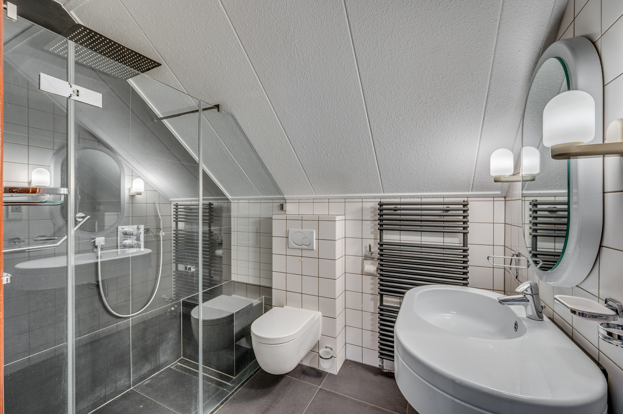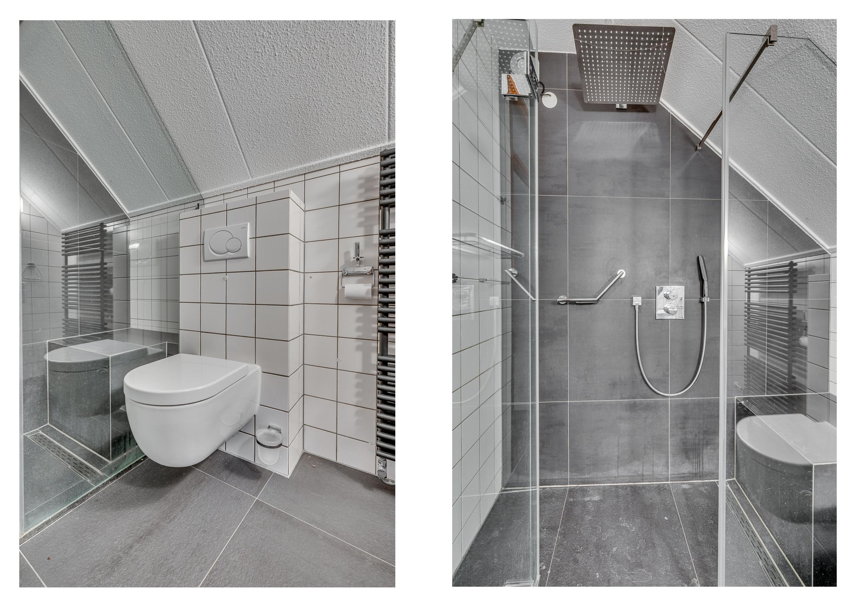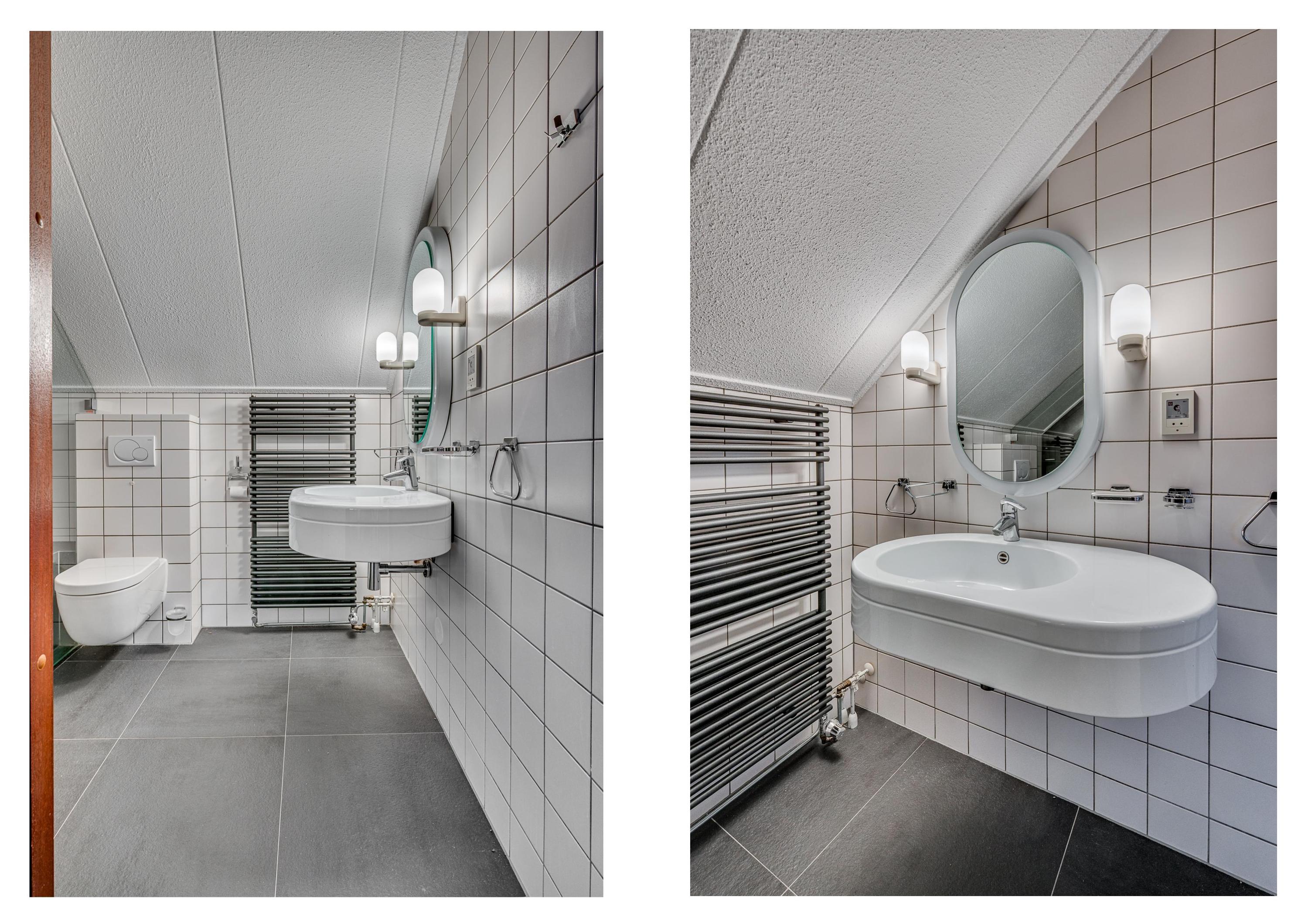 De ruime overloop welke is voorzien van vloerbedekking geeft toegang tot de 3 slaapkamers, badkamer en vaste trapopgang naar de 2e verdieping. De slaapkamers zijn allen voorzien van vloerbedekking. Verder is de masterbedroom welke aan de voorzijde is gelegen voorzien van een inbouwkast. De slaapkamer aan de achterzijde is voorzien van een wastafel. Aan de voorzijde van de woning is de badkamer gelegen. De badkamer is geheel betegeld en voorzien van een inloopdouche, zwevend toilet, wastafel met meubel, designradiator en mechanische ventilatie.