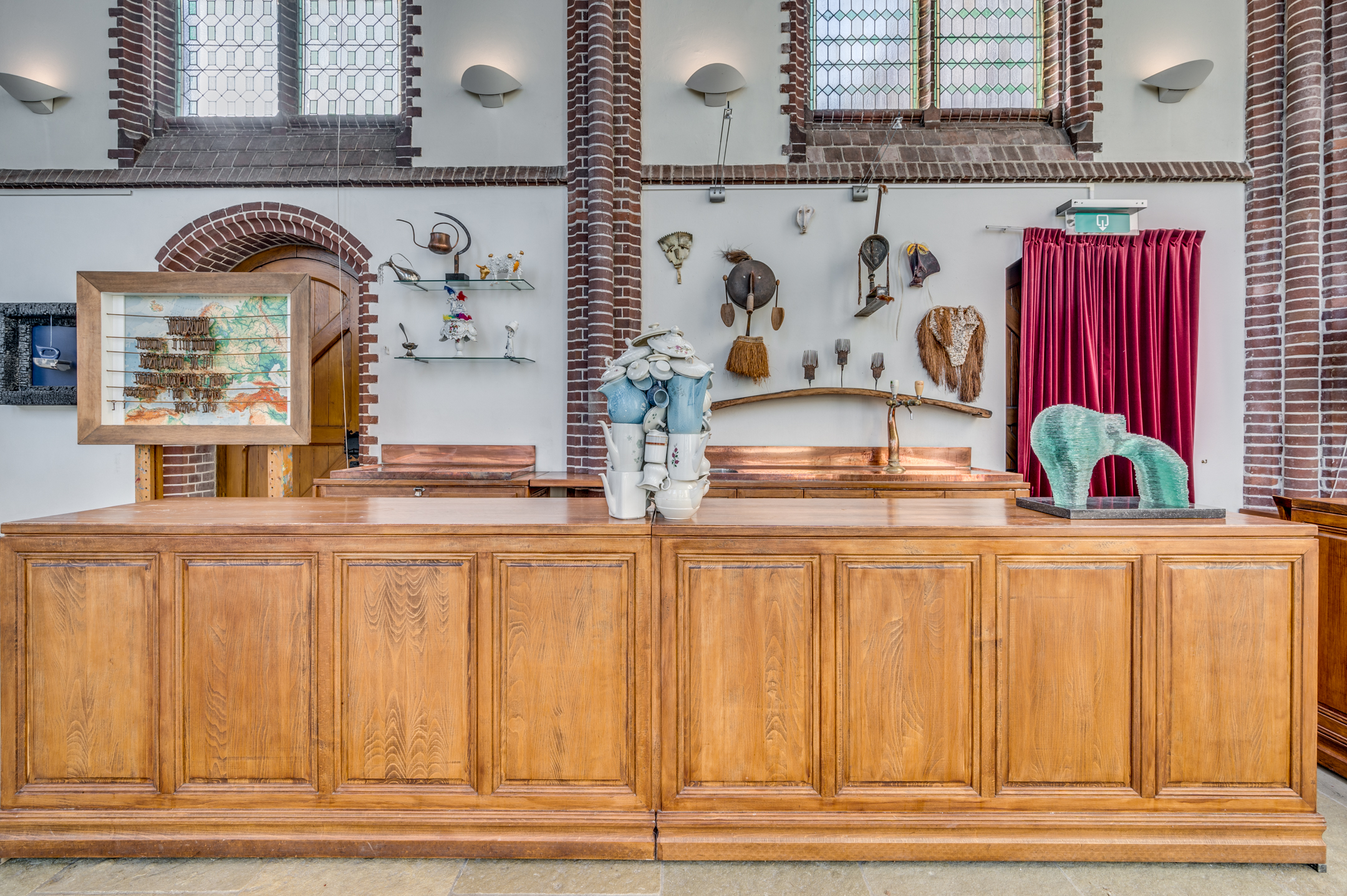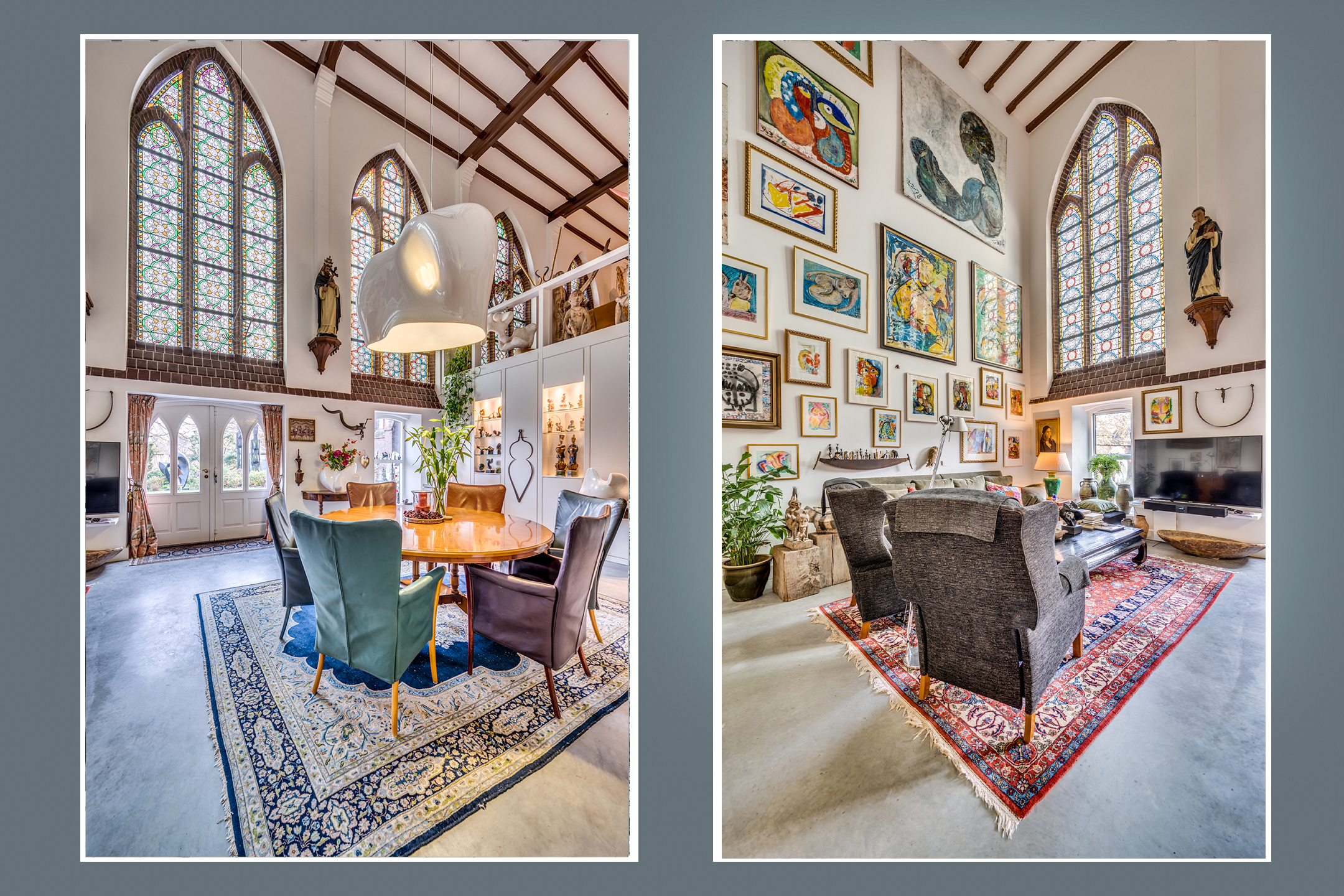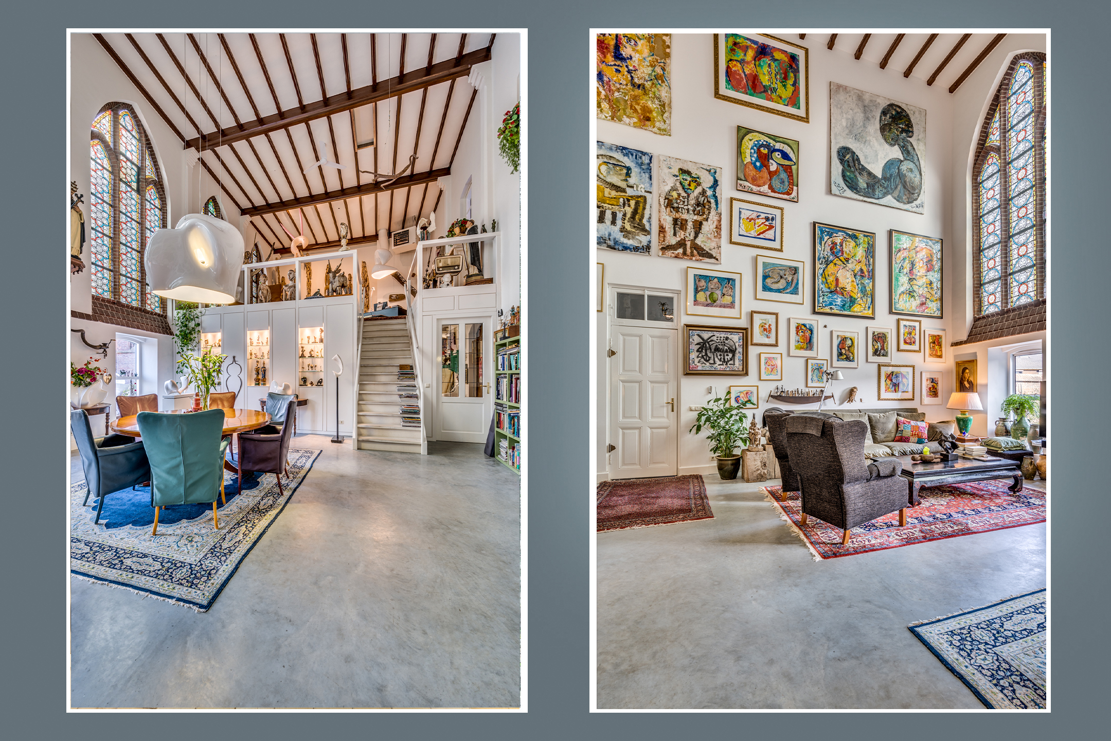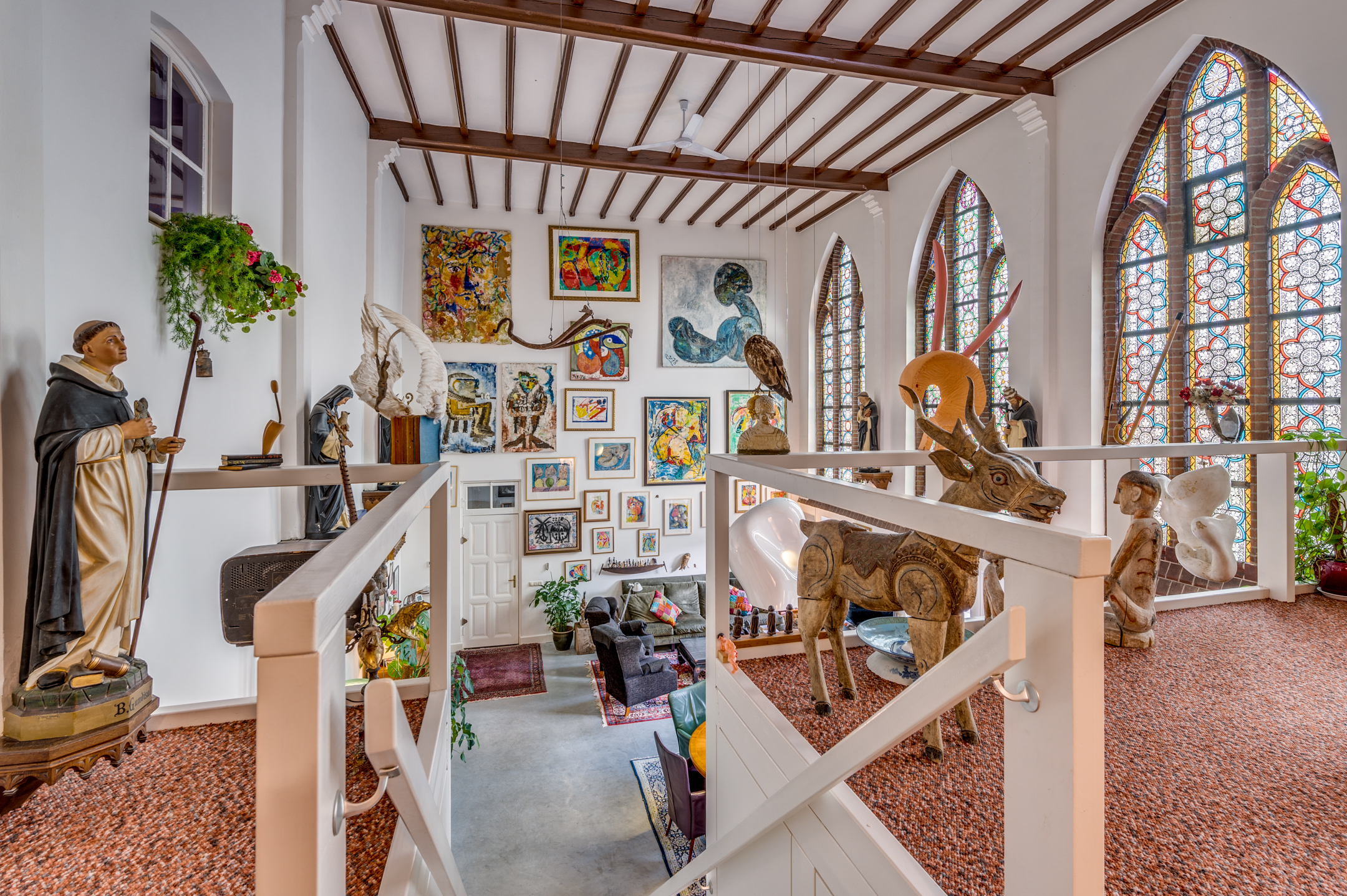 Kruisgewelven, originele glas-in-loodramen en een entresol met panoramisch zicht over de volledige ruimte.