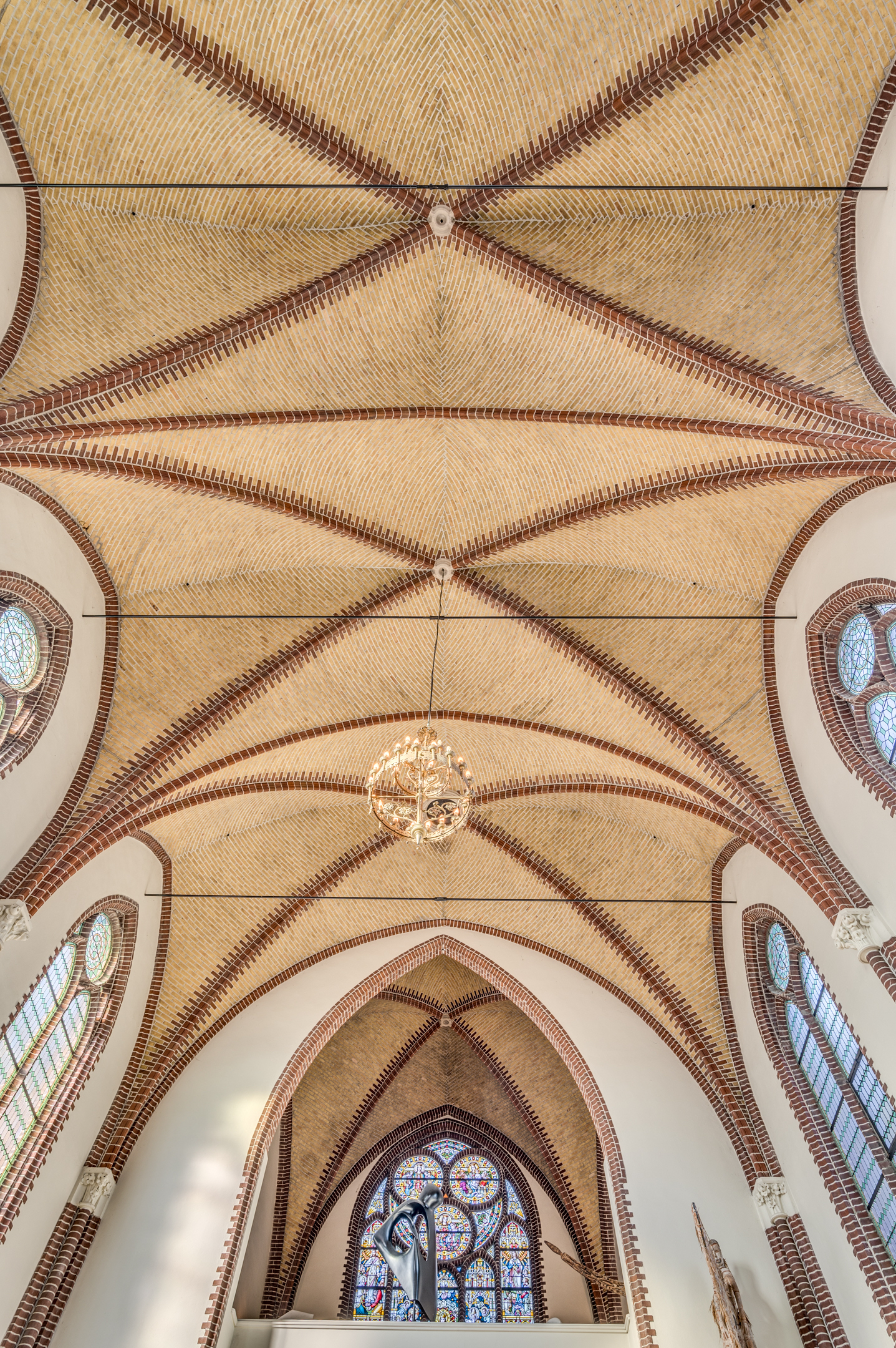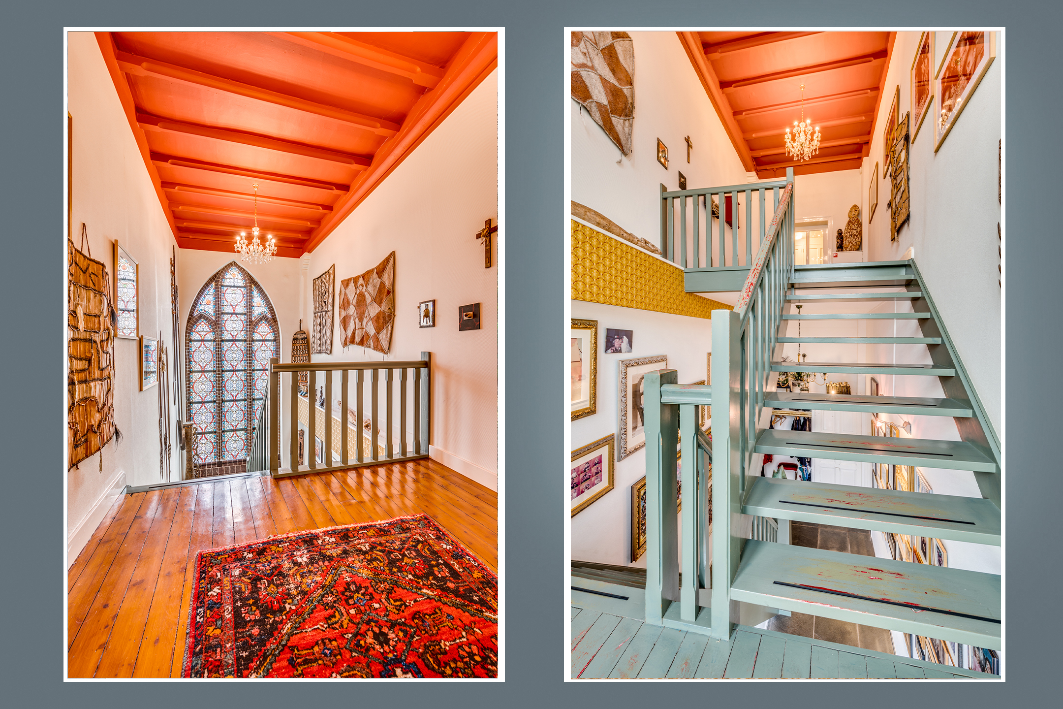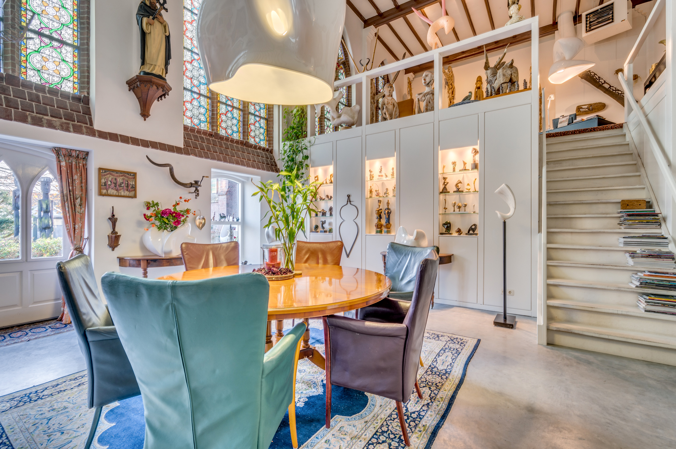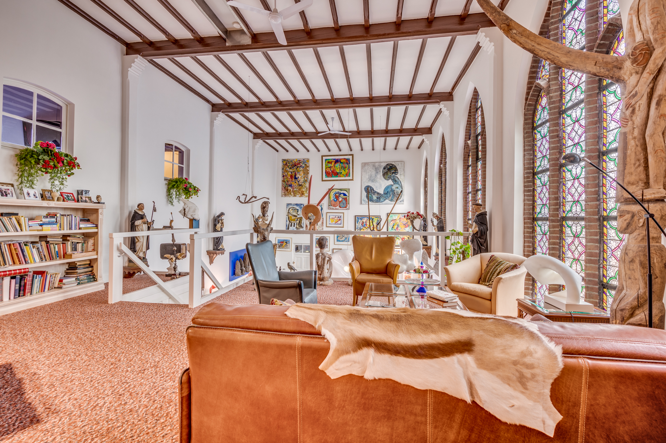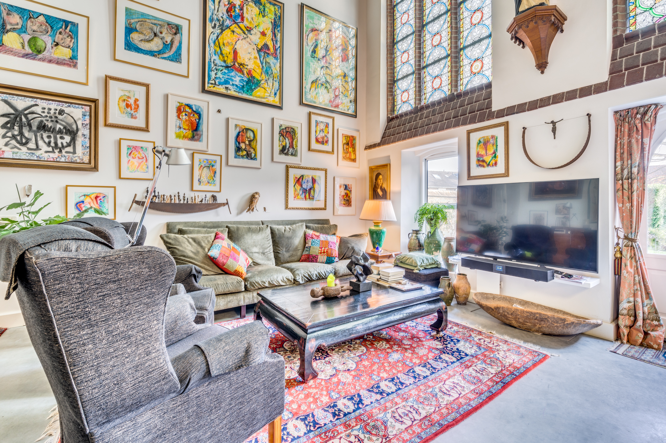 Kruisgewelven, originele glas-in-loodramen en een entresol met panoramisch zicht over de volledige ruimte.