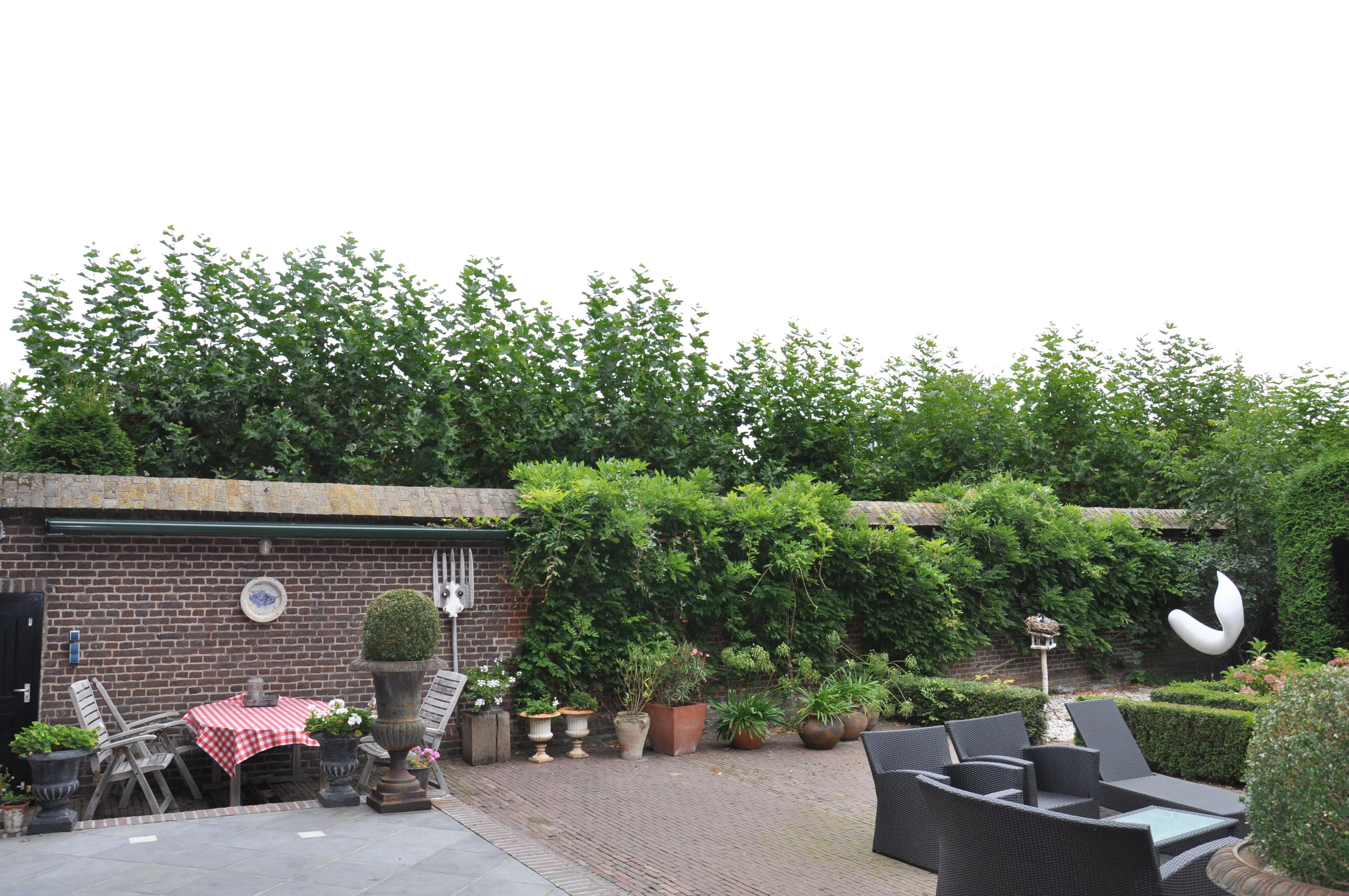 De tuin is volledig omsloten en biedt rust en privacy. Je vindt hier een groot overdekt terras, vaste beplanting, een zwembad met bijbehorende opslagruimte en toilet, een glazen tuinhuis en een extra tuin- en moestuingedeelte.