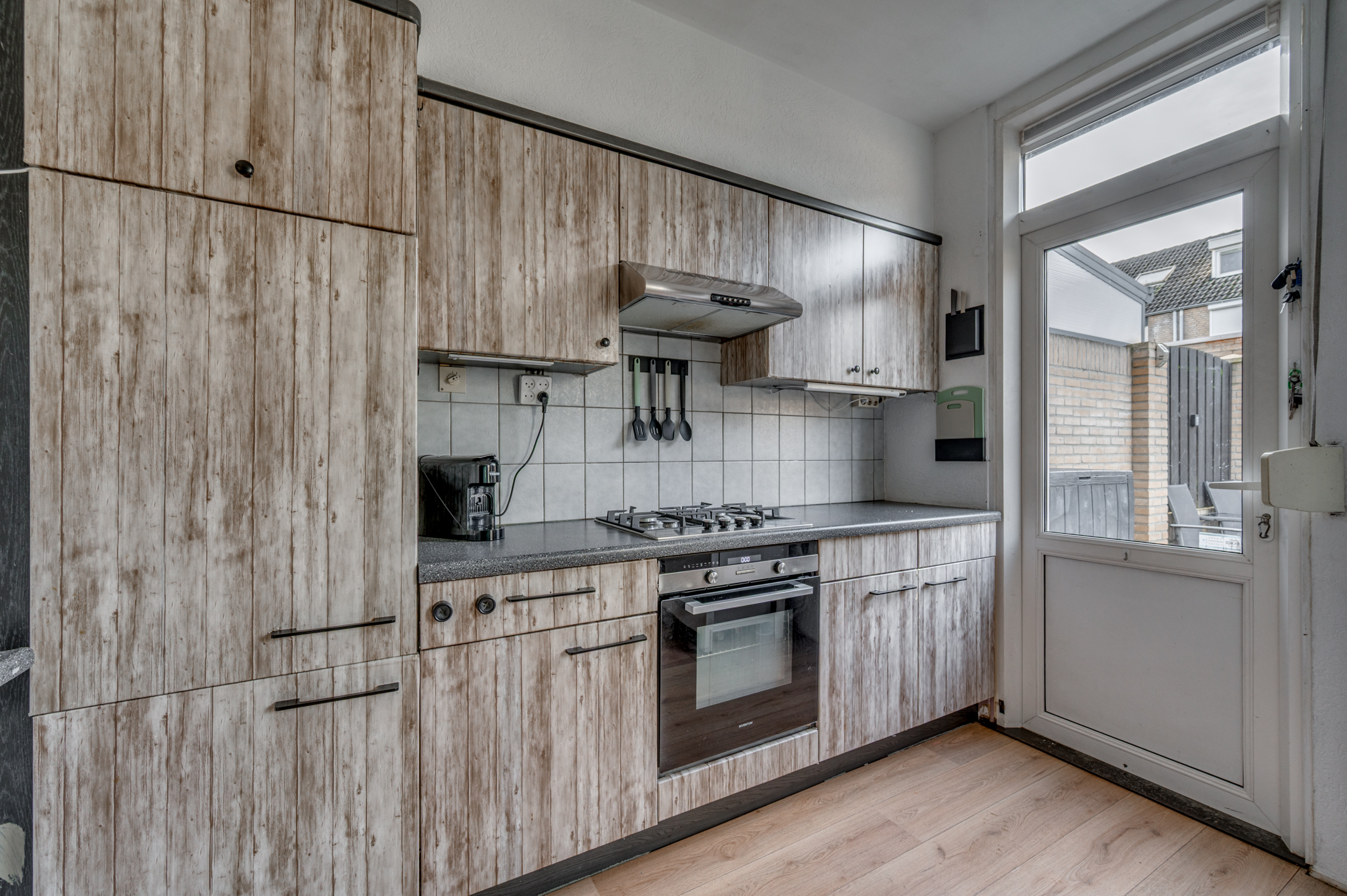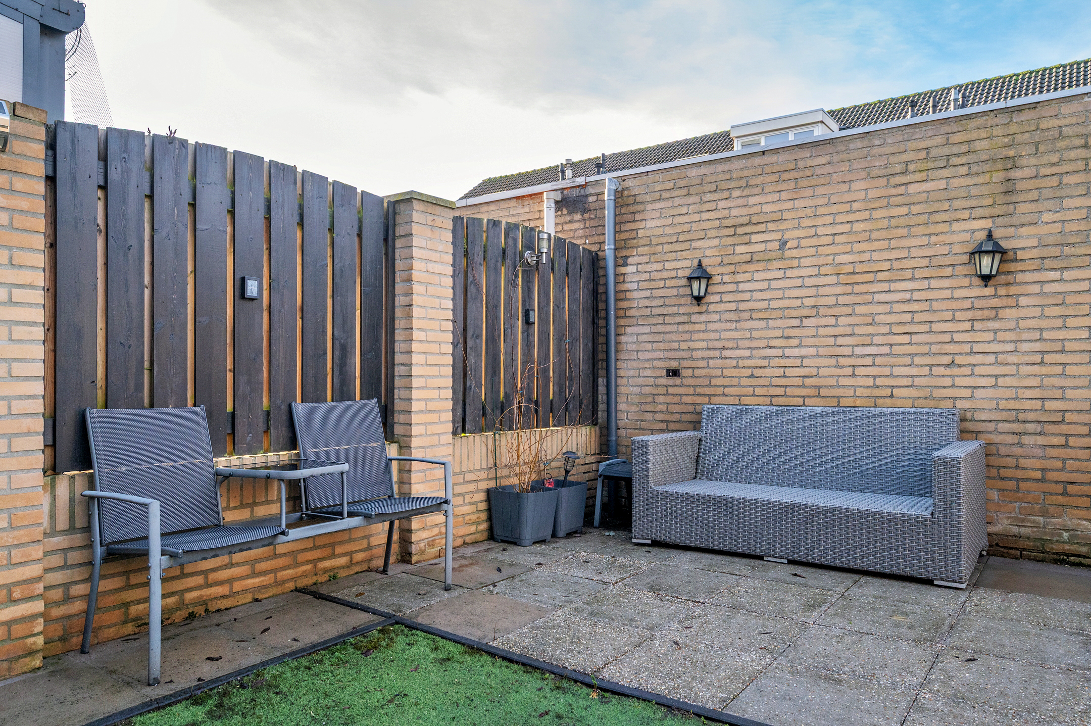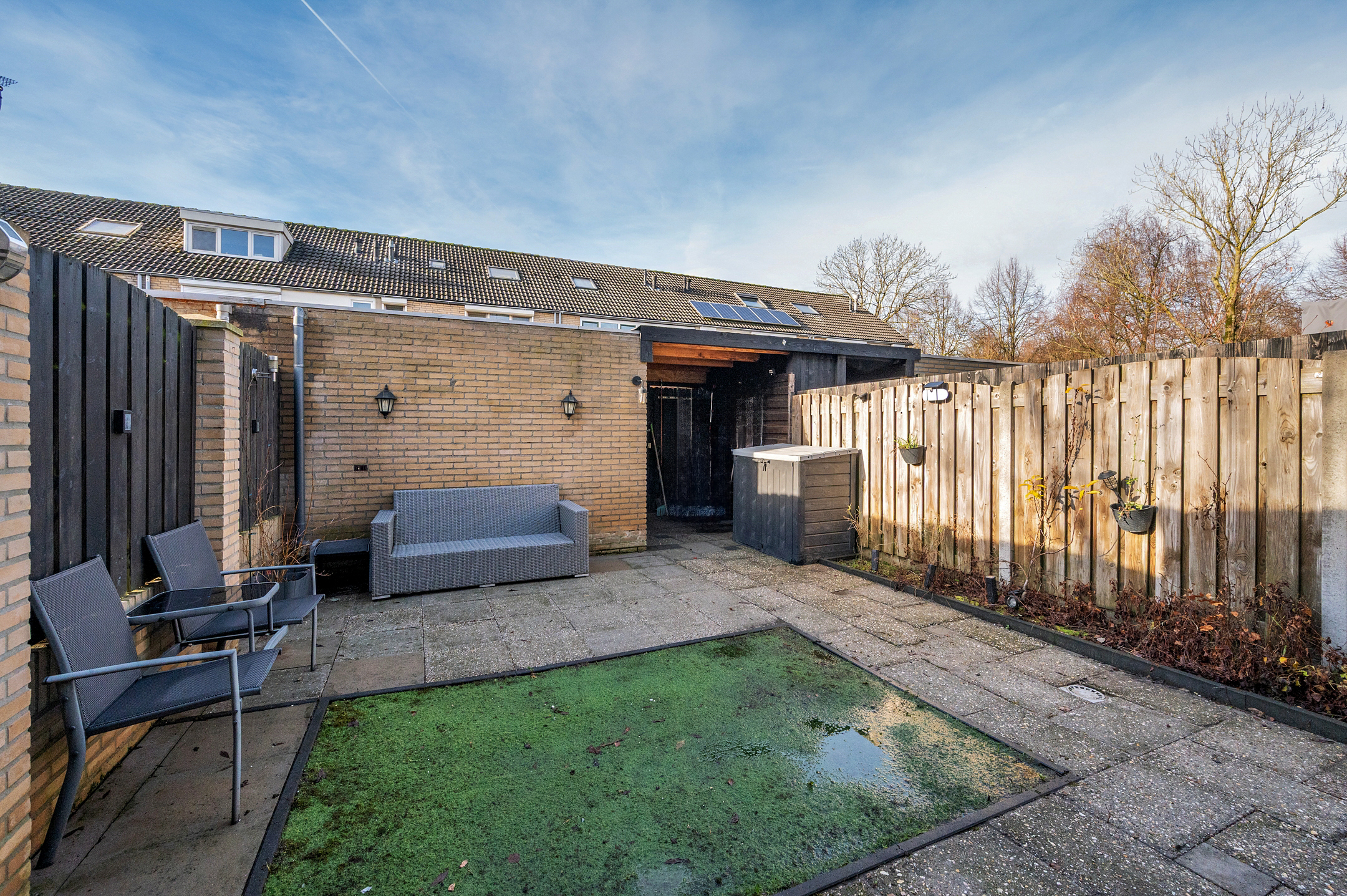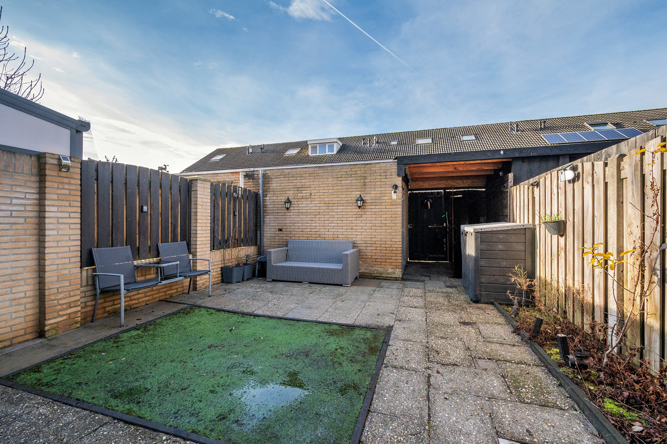 De achtertuin is grotendeels betegeld en geniet veel privacy. De stenen berging aan de achterzijde kan dienen voor extra opslag. Middels een vrije achterom is de tuin te bereiken.