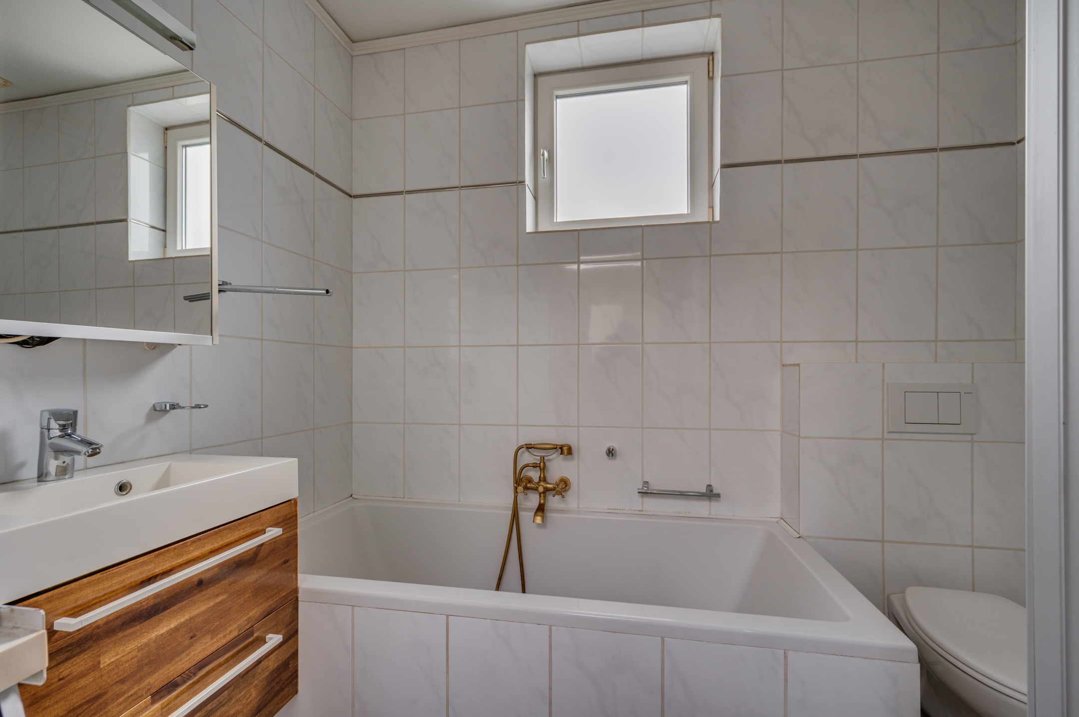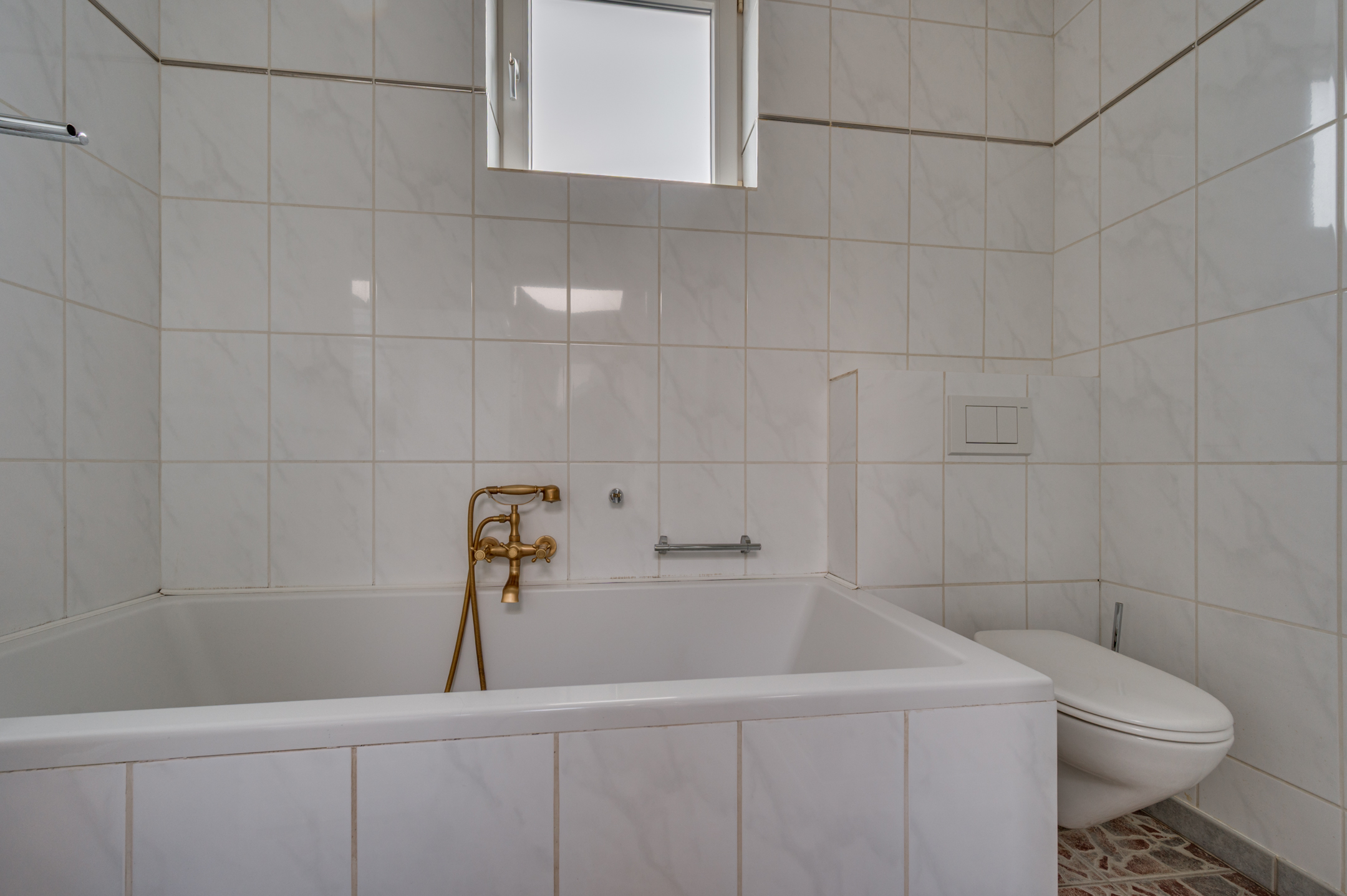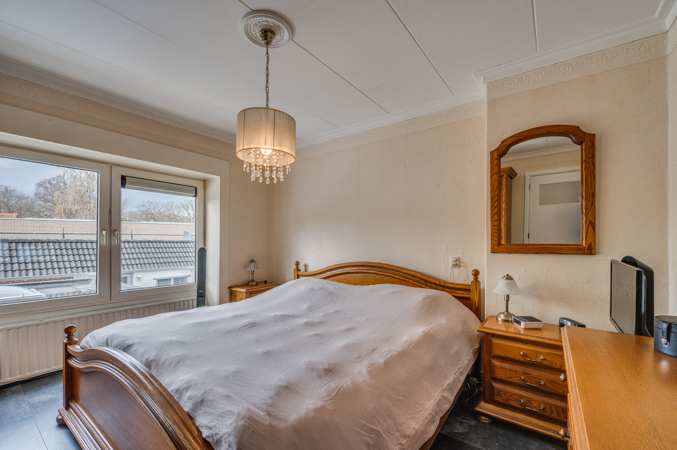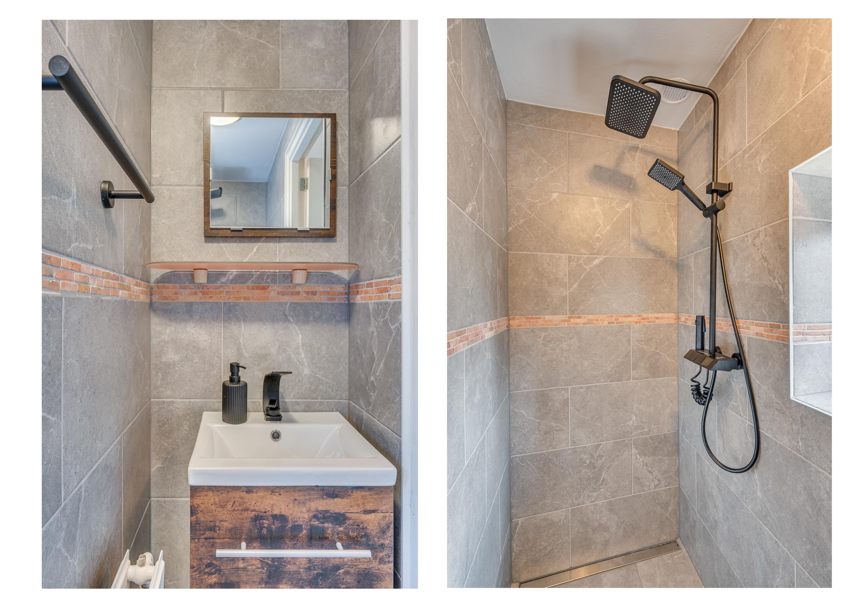 De overloop geeft toegang tot 3 ruime slaapkamers en 2e badkamer. De slaapkamers zijn ruim van opzet en voorzien van rolluiken. De badkamer welke geheel is betegeld is voorzien van een inloopdouche, wastafel met meubel en verwarming.