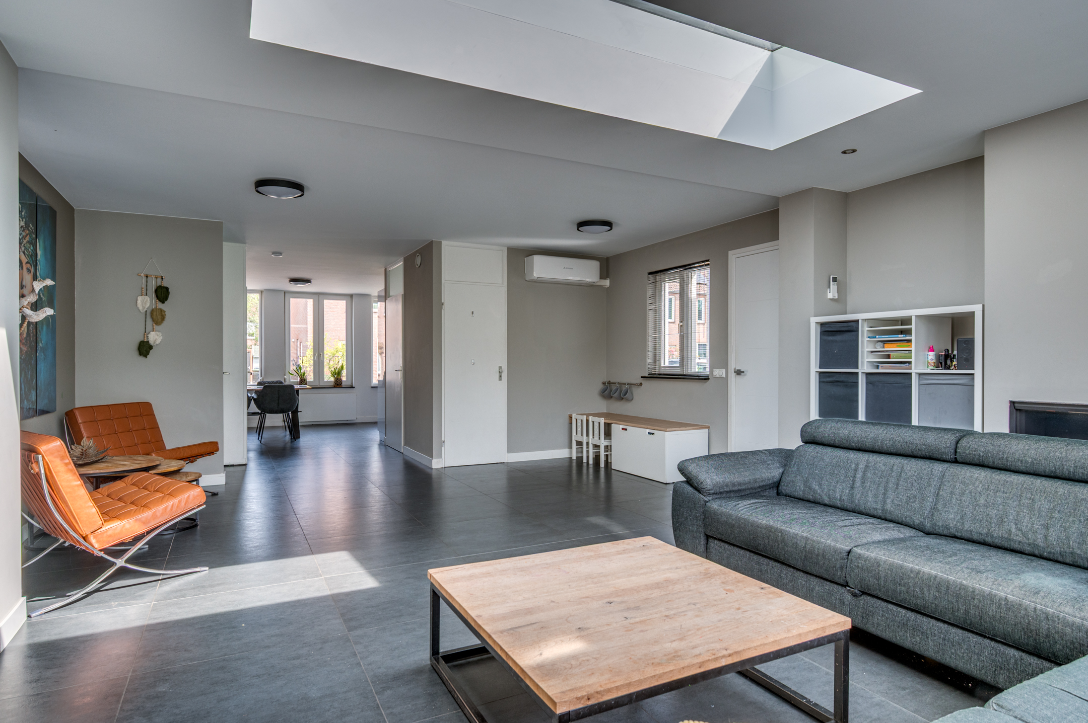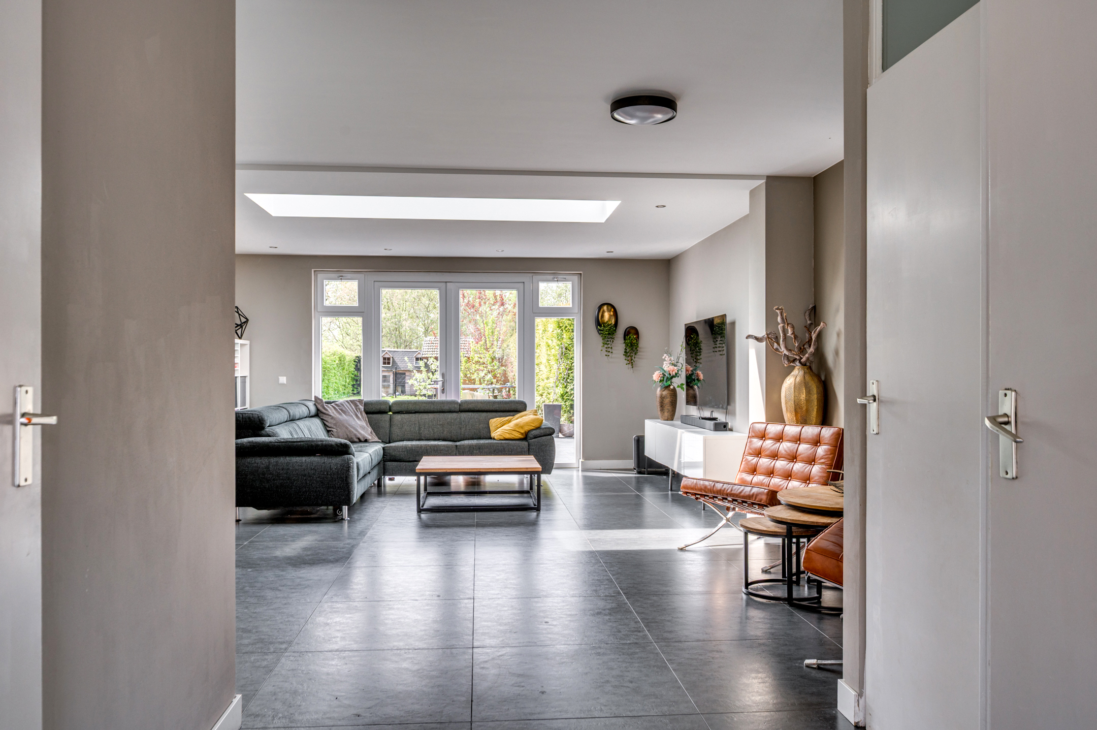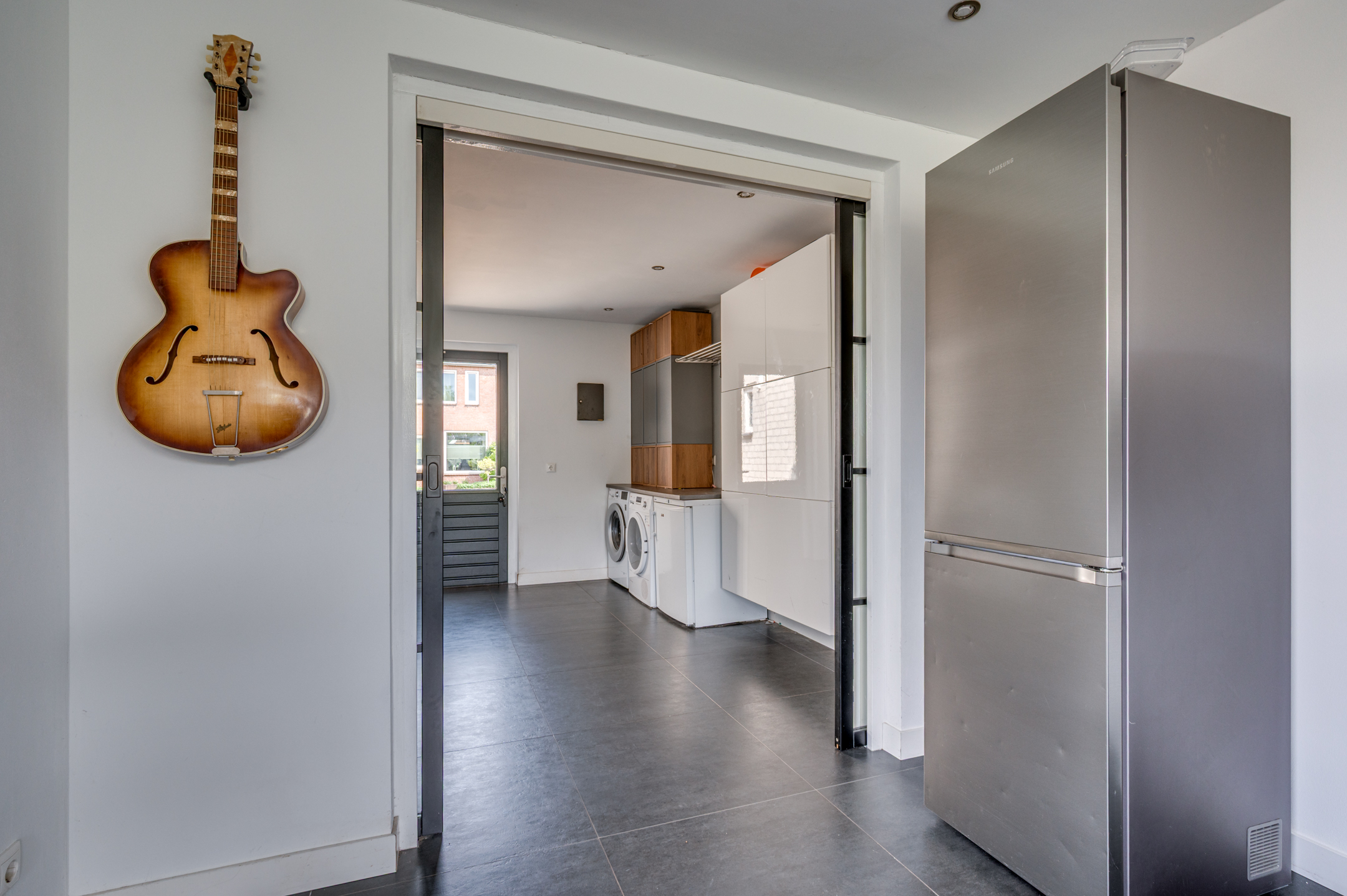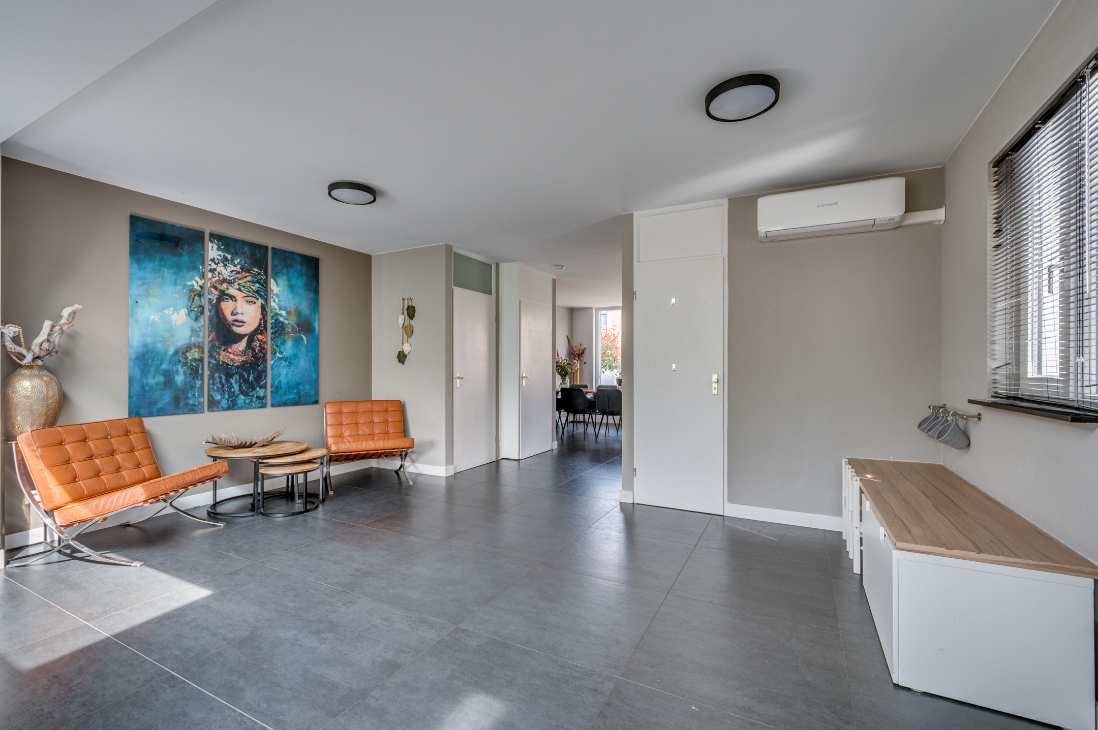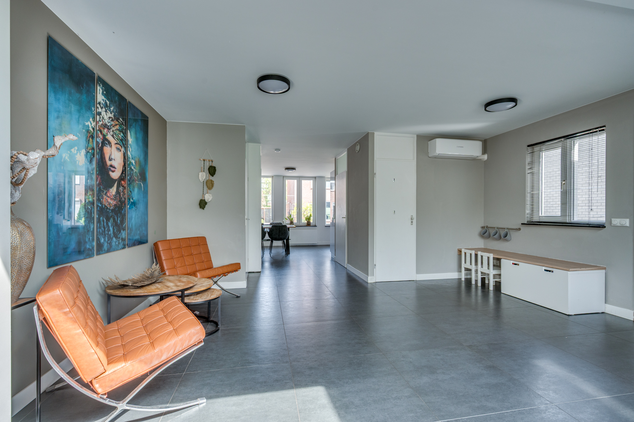 Via de eigen oprit is de entree van de woning te bereiken. De entree/hal geeft toegang tot de separate toiletruimte, meterkast en woonkamer. De separate toiletruimte is deels betegeld en voorzien van een zwevend toilet, fonteintje en buitenraam. Middels een loopdeur is de zeer ruime woonkamer te bereiken. De woonkamer is ingedeeld in een eetkamer met open keuken aan de voorzijde en ruime woonkamer aan de achterzijde. De keuken is in 2018 vernieuwd en voorzien van een inductiekookplaat, afzuigkap, vaatwasmachine, combi-oven/magnetron, spoelbak, koelkast en zeer veel opbergruimte. Vanuit de zithoek is er middels 2 openslaande tuindeuren toegang tot de tuin. De woonkamer geeft tevens toegang tot de wasruimte en riante bijruimte. De gehele begane grond is voorzien van vloerverwarming en tevens is er een airco aanwezig.