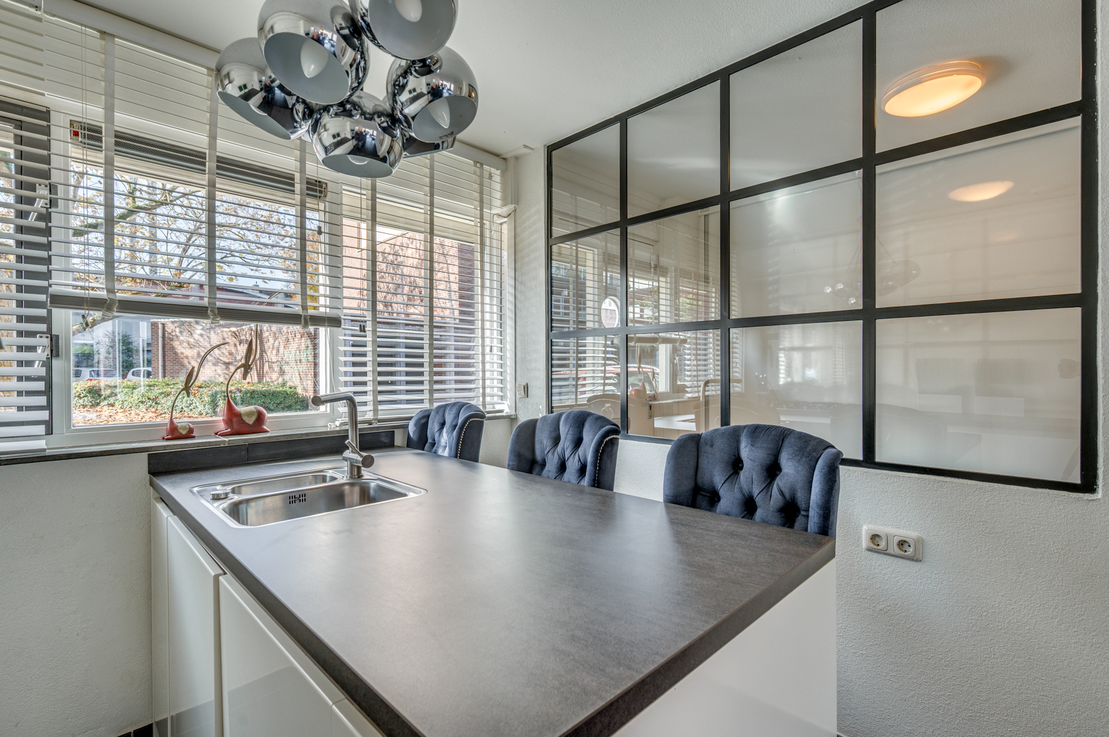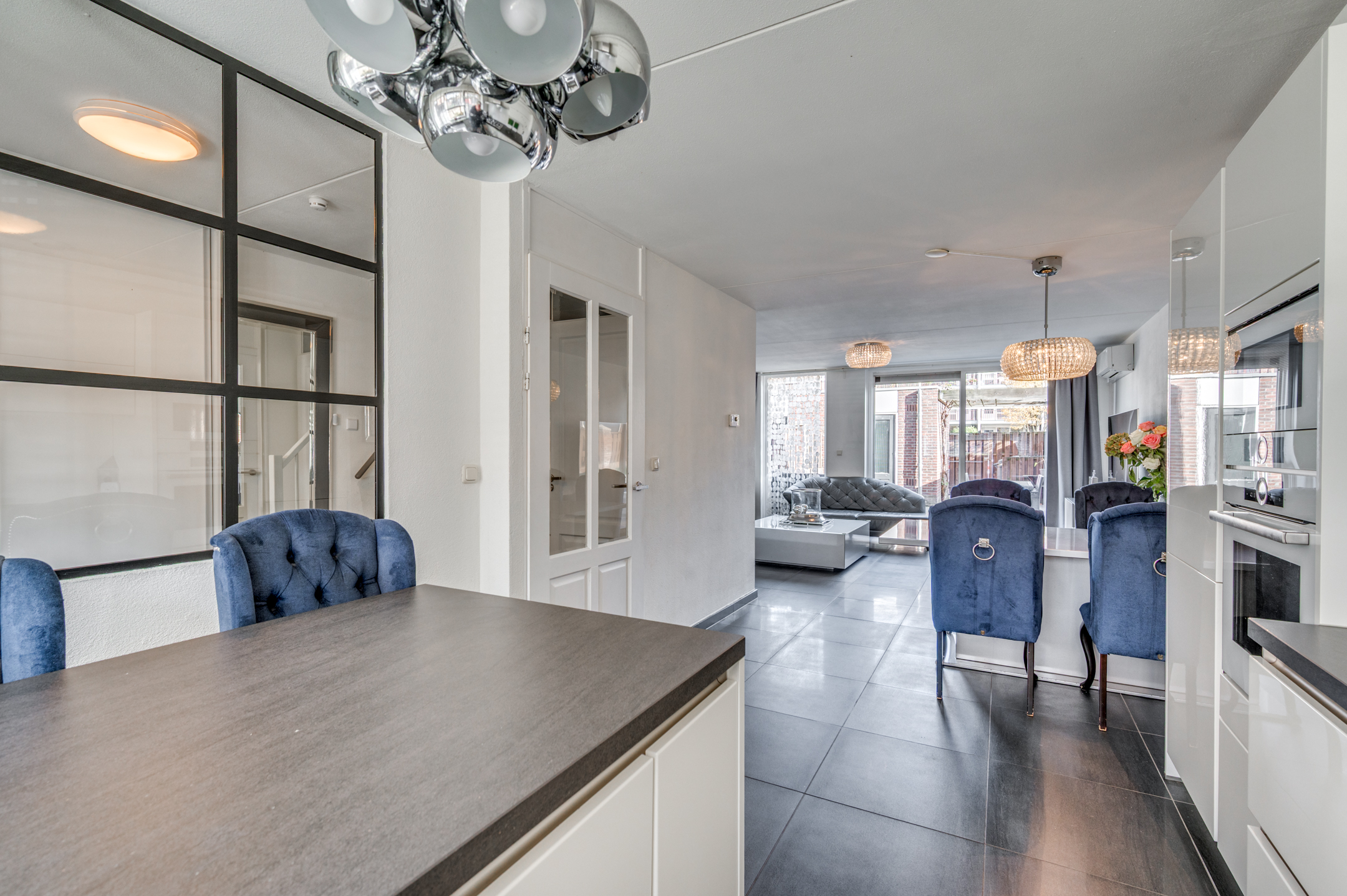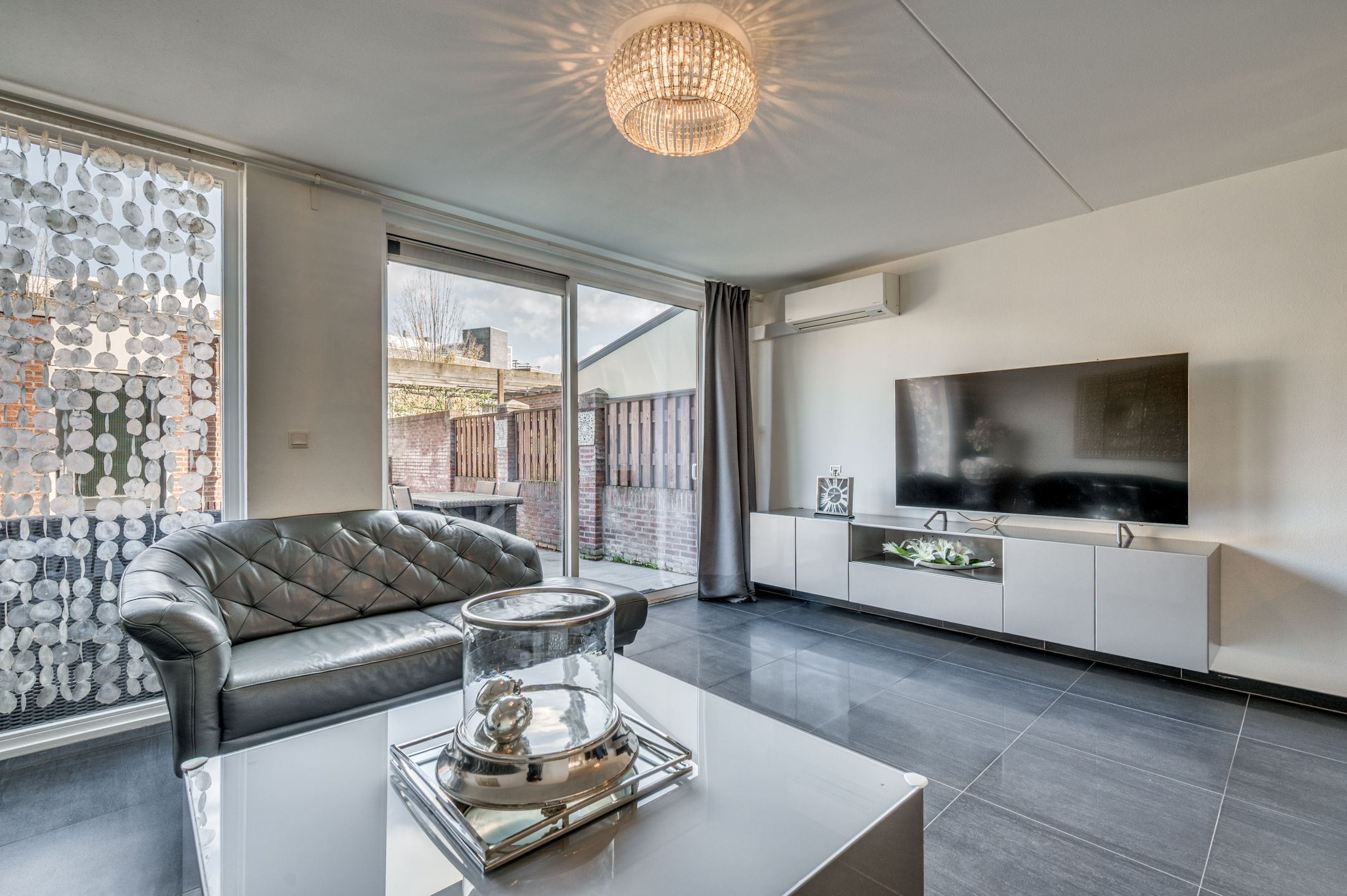 De entree/ hal geeft toegang tot de trapopgang naar de 1e verdieping, separate toiletruimte en de woonkamer. De geheel betegelde toiletruimte is voorzien van een zwevend toilet, fonteintje en mechanische ventilatie. Middels een loopdeur is de open keuken met woonkamer te betreden. De keuken is aan de voorzijde van de woning gelegen en is voorzien van een spoeleiland, 5-pits gasfornuis, afzuigkap, oven, magnetron, koelkast, diepvries en zeer veel opbergruimte. Aan de achterzijde is de woonkamer gelegen. Hier is een airco geplaatst en is er toegang tot de trapkast. Middels een schuifpui is de onderhoudsvriendelijke achtertuin te bereiken. De gehele begane grond is voorzien van een tegelvloer, verder zijn de woonkamer en de hal voorzien van vloerverwarming.