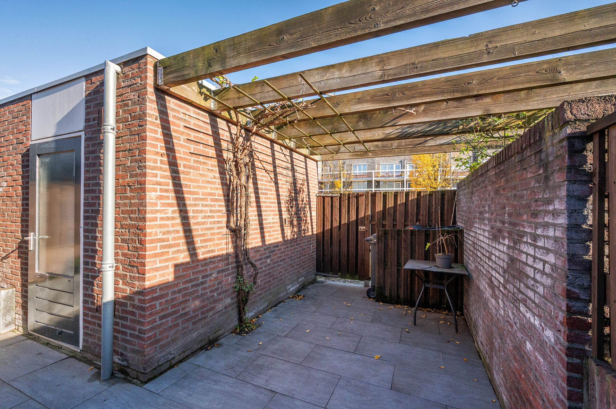 De onderhoudsvrije achtertuin is nagenoeg geheel betegeld en voorzien van een border met beplanting. In de tuin bevindt zich een stenen berging. Verder is er aan de achterkant van de woning een groot zonnescherm aanwezig. De tuin is gelegen op het noordoosten en is te bereiken middels een vrije achterom.